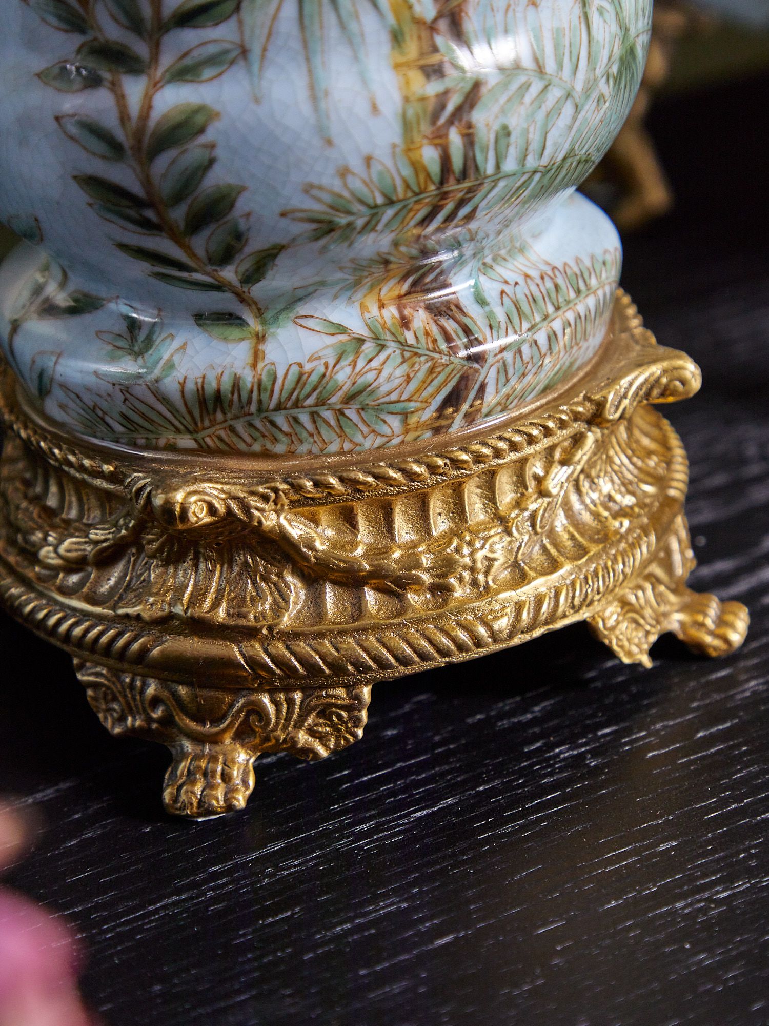 Ваза на подставке, выполненная из фарфора с бронзовыми элементами. Уникальное изделие ручной работы. При производстве этих художественных изделий из фарфора с бронзой используются вековые традиции китайских мастеров. Видимые трещинки (кракелюры) делаются по уникальной технологии, что придает более благородный вид старинного изделия.