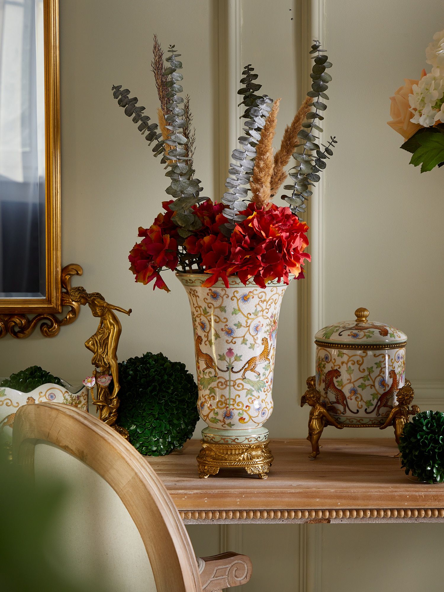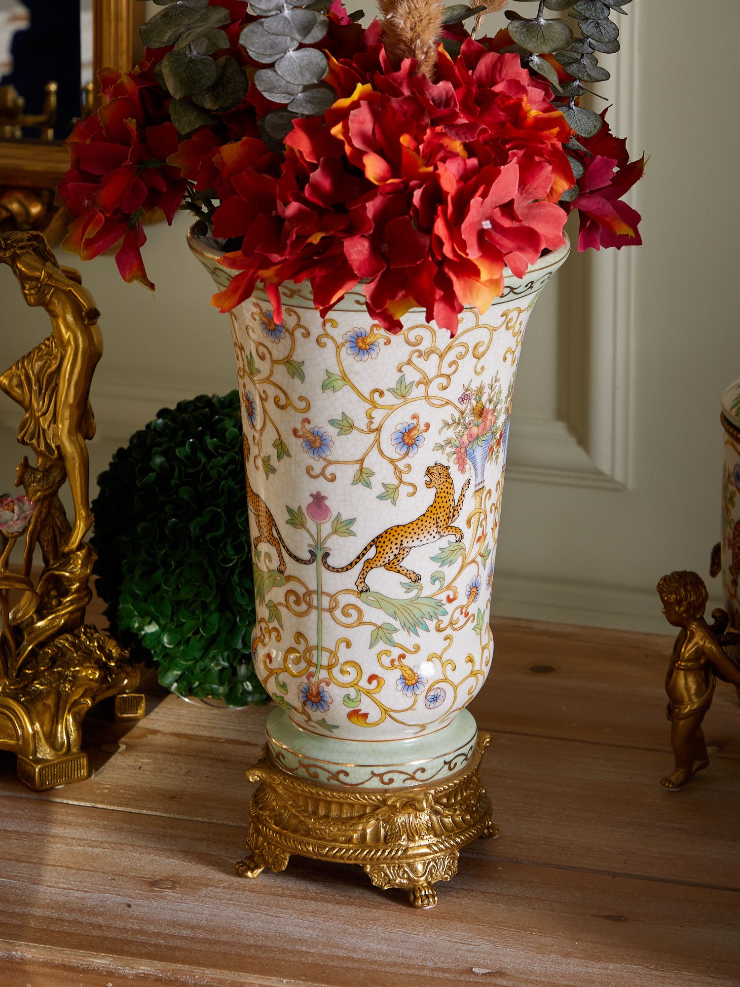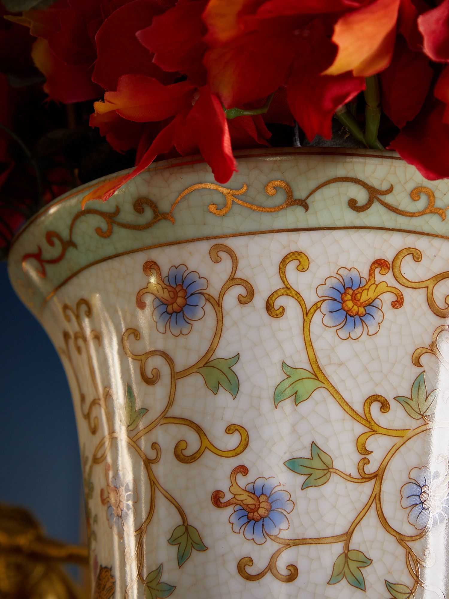 Ваза на подставке, выполненная из фарфора с бронзовыми элементами. Уникальное изделие ручной работы. При производстве этих художественных изделий из фарфора с бронзой используются вековые традиции китайских мастеров. Видимые трещинки (кракелюры) делаются по уникальной технологии, что придает более благородный вид старинного изделия.