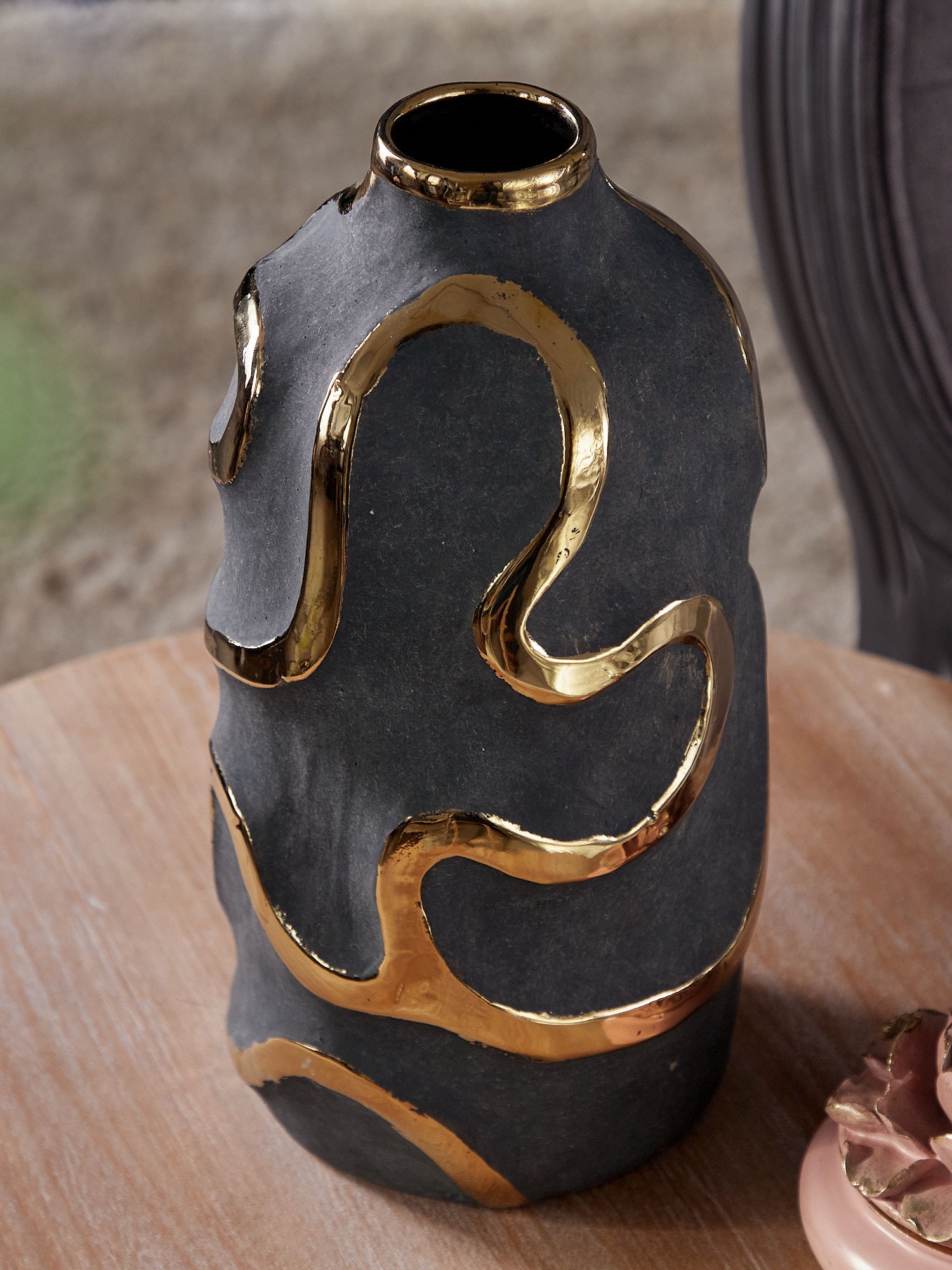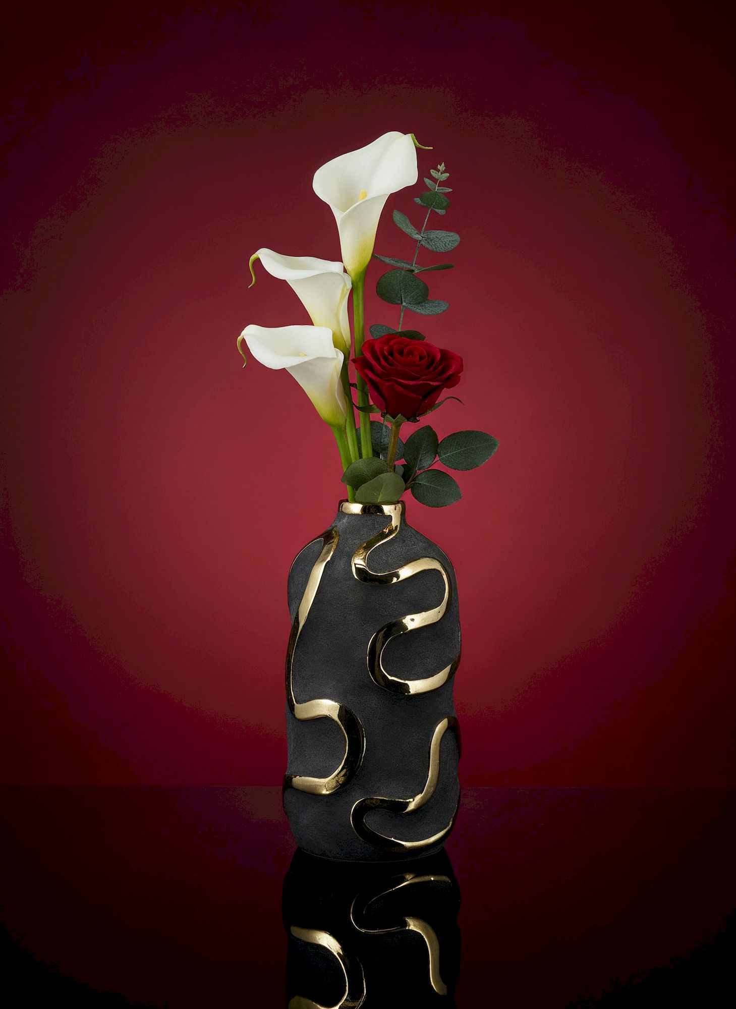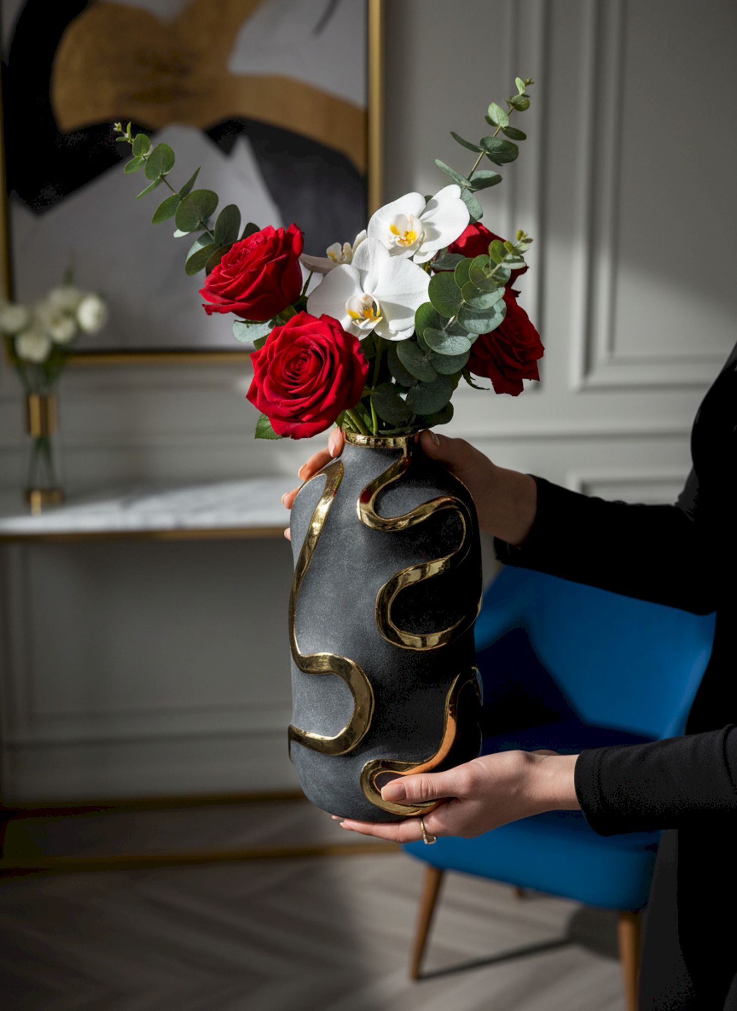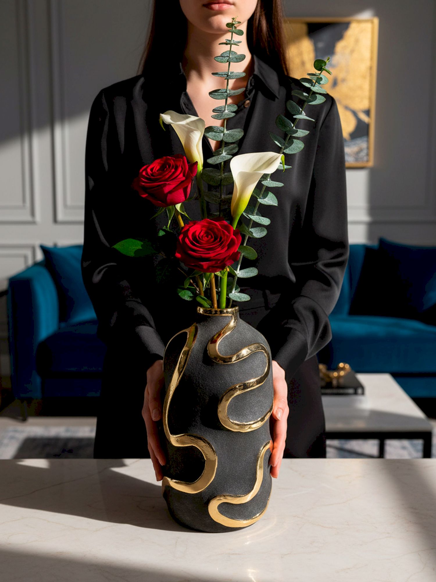Элегантная форма вазы с яркими акцентными полосами на черном матовом фоне - это оригинальный вариант украшения вашего интерьера. Золотистый блеск на поверхности смотрится роскошно и стильно. Ваза идеально подойдет для шикарного офиса или гостиной.