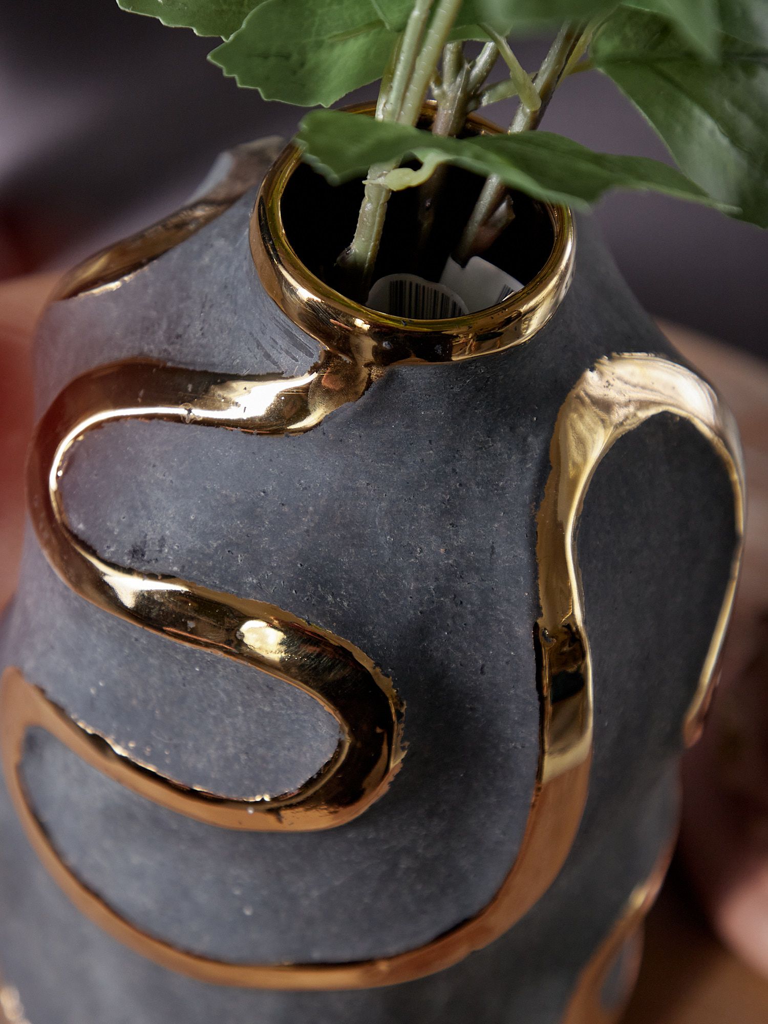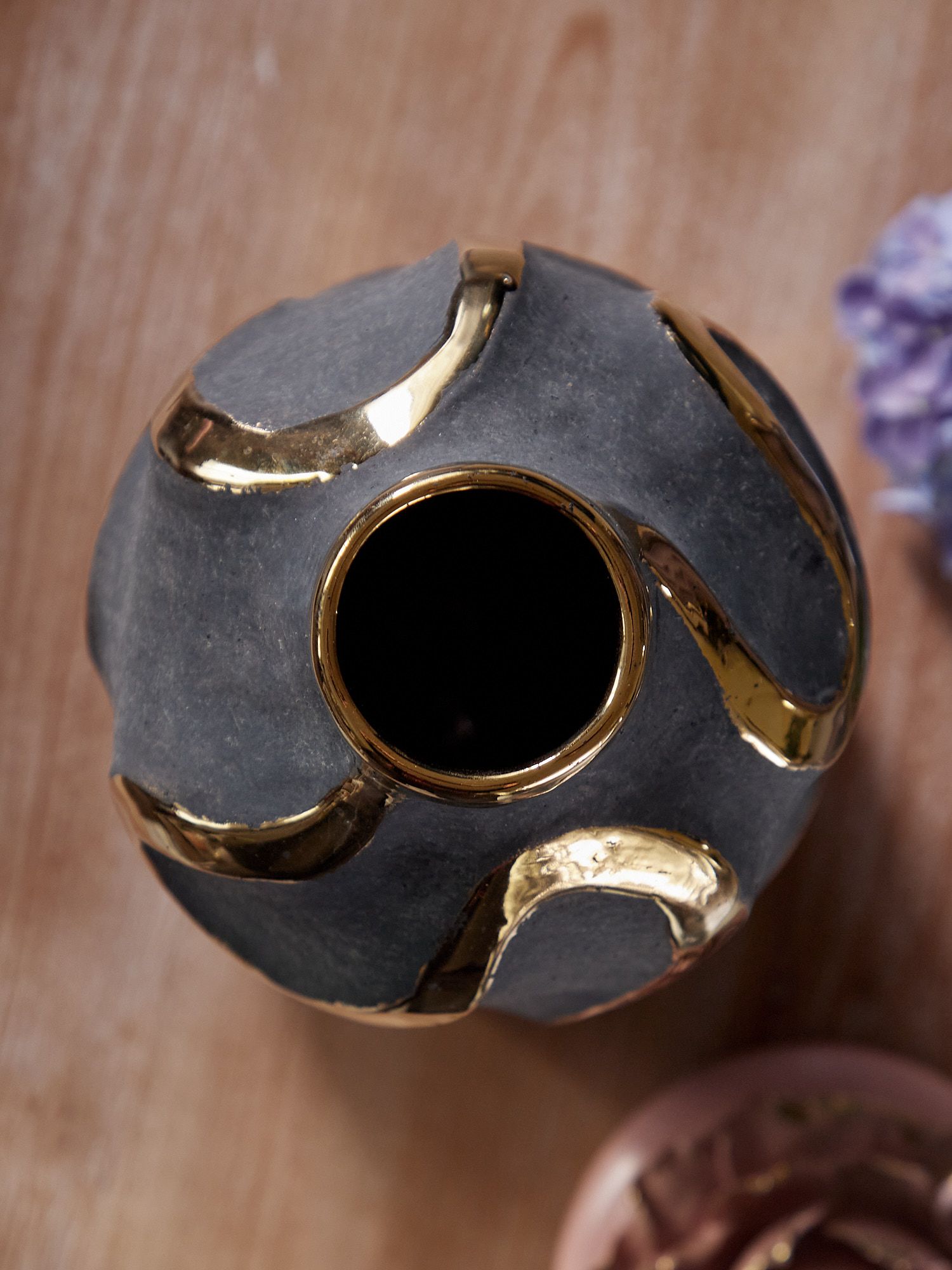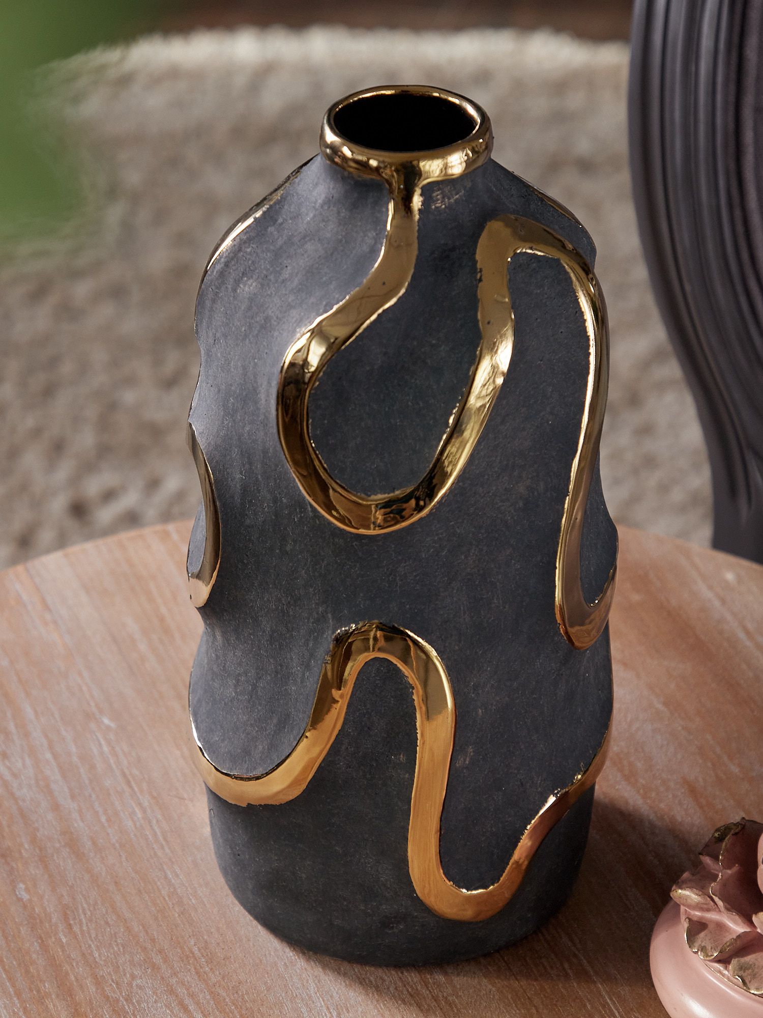 Элегантная форма вазы с яркими акцентными полосами на черном матовом фоне - это оригинальный вариант украшения вашего интерьера. Золотистый блеск на поверхности смотрится роскошно и стильно. Ваза идеально подойдет для шикарного офиса или гостиной.