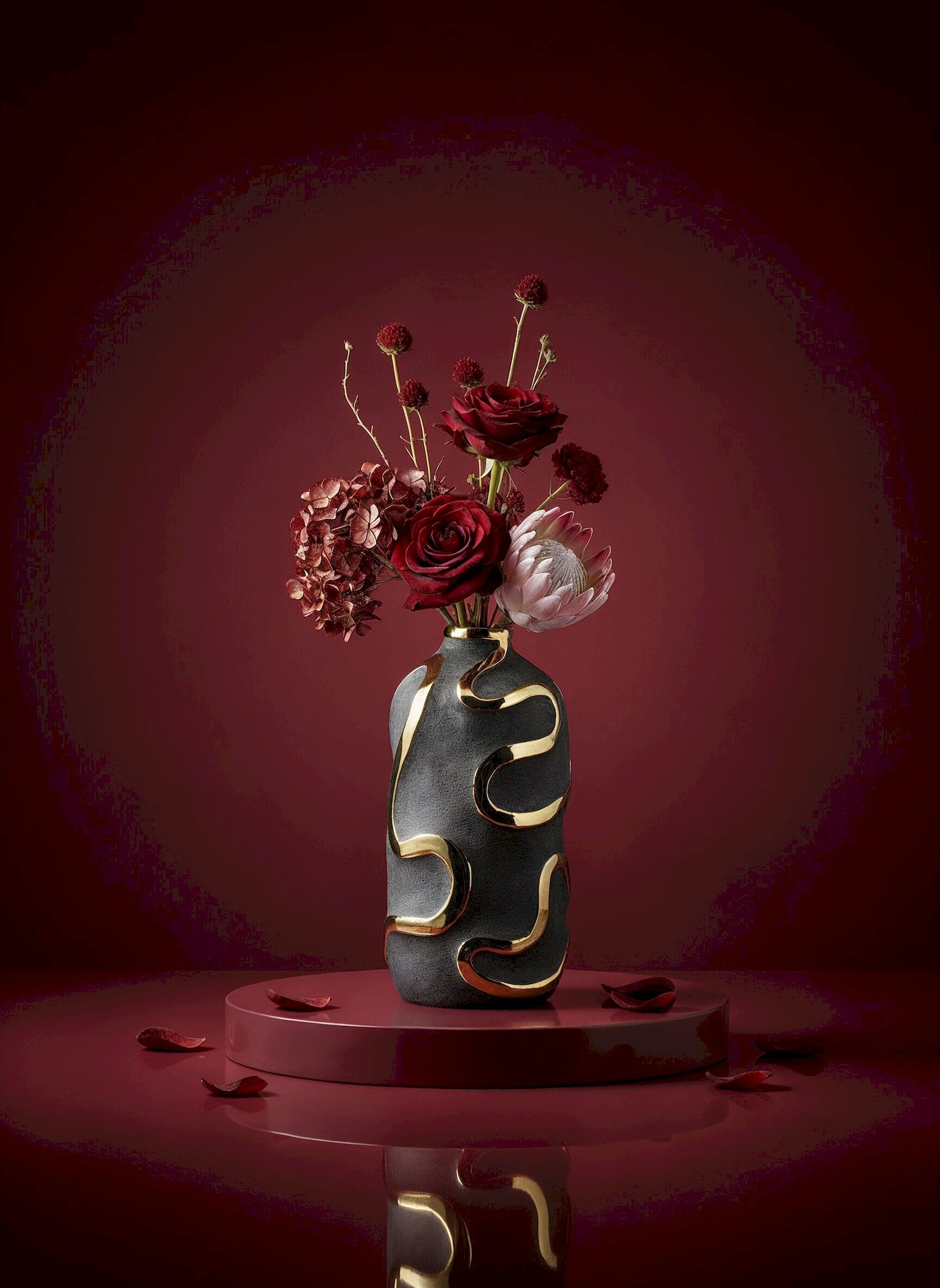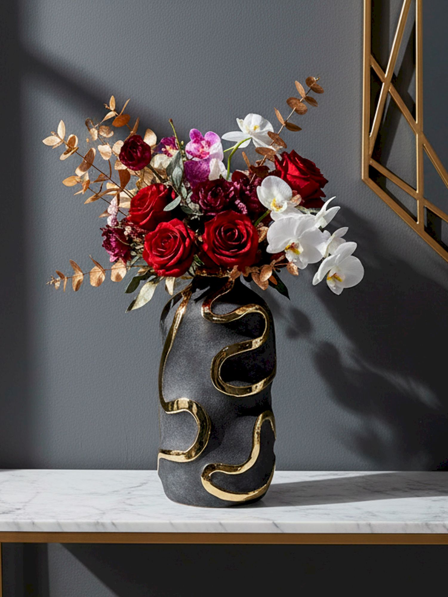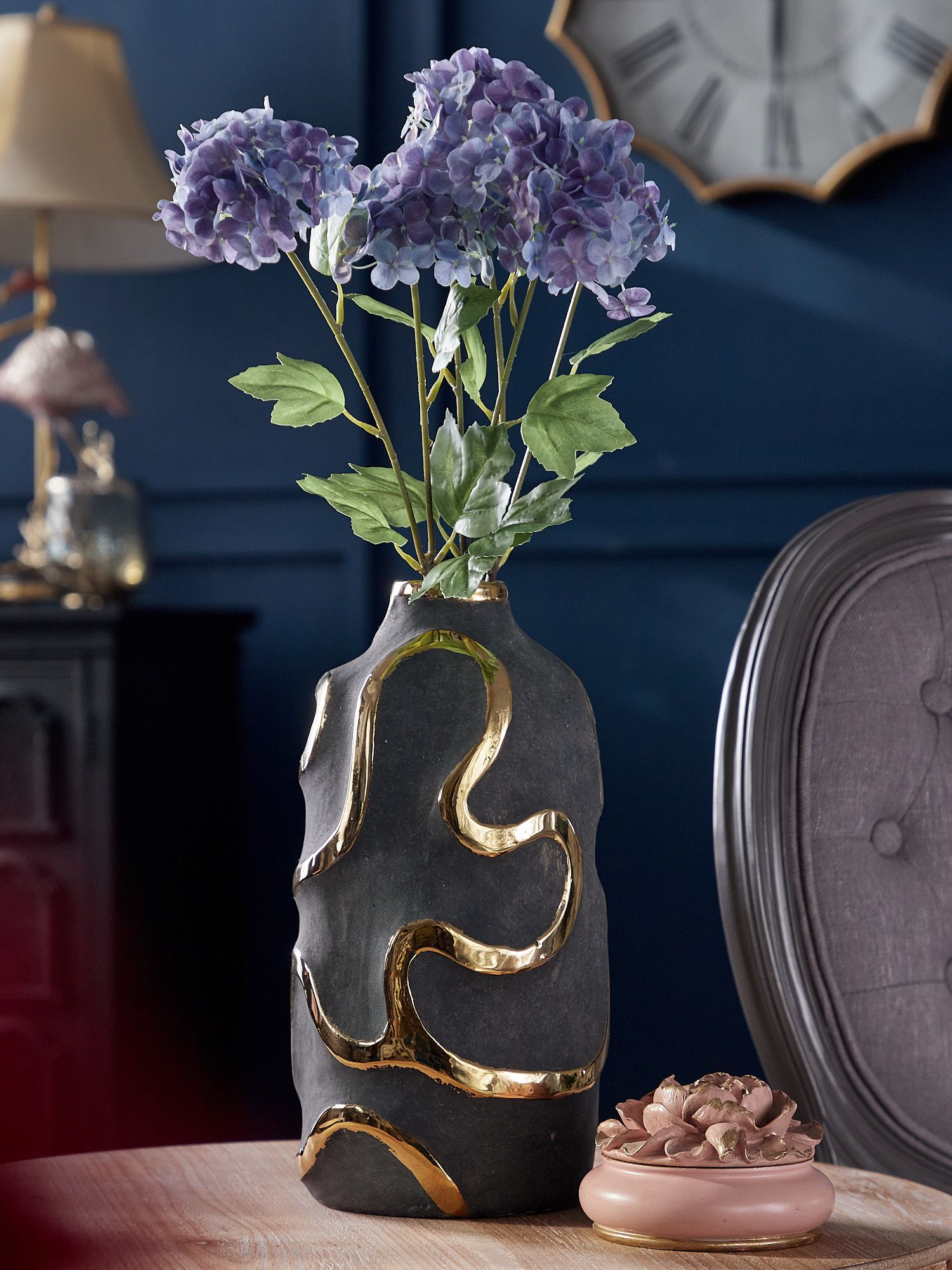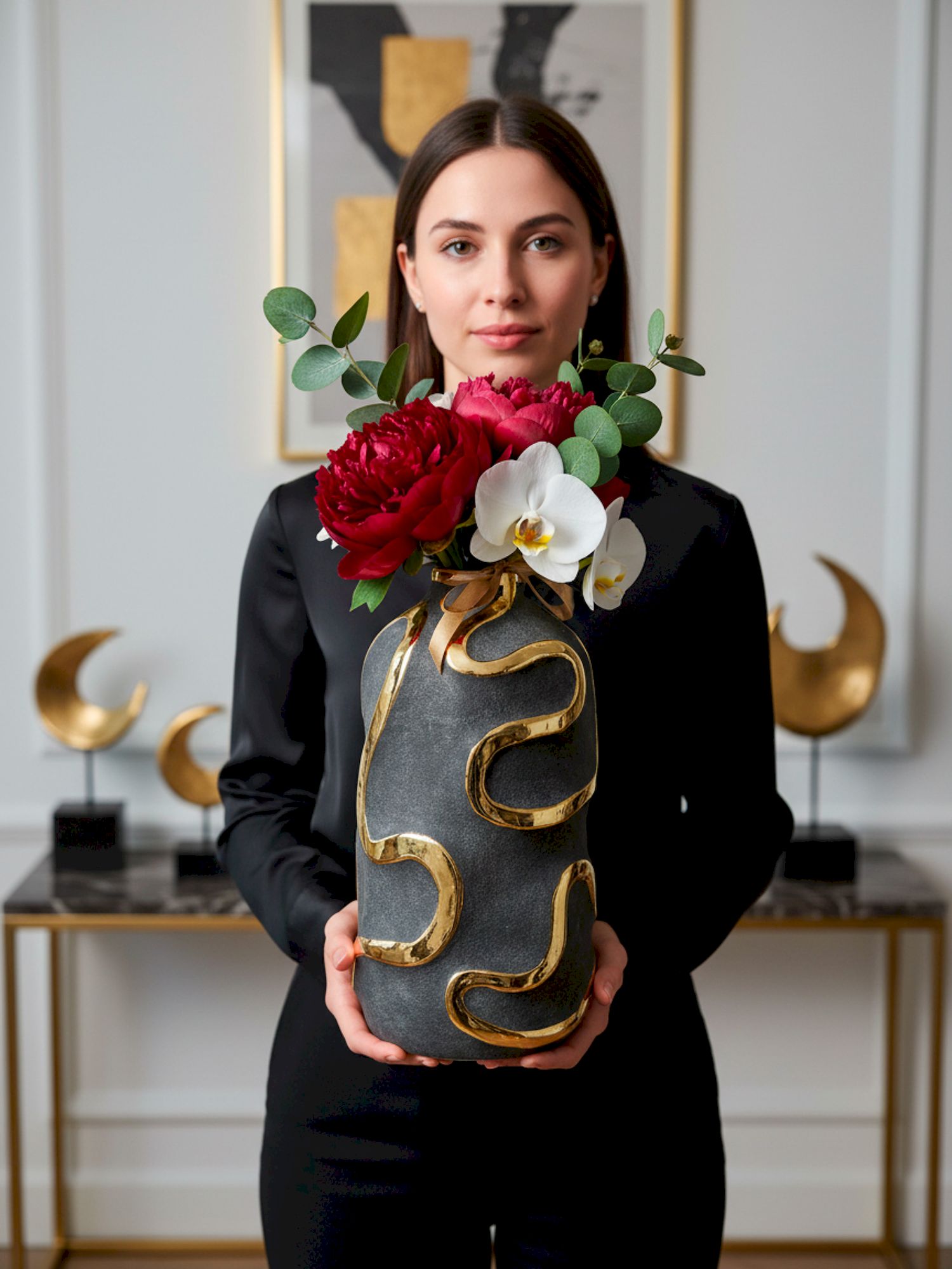 Элегантная форма вазы с яркими акцентными полосами на черном матовом фоне - это оригинальный вариант украшения вашего интерьера. Золотистый блеск на поверхности смотрится роскошно и стильно. Ваза идеально подойдет для шикарного офиса или гостиной.