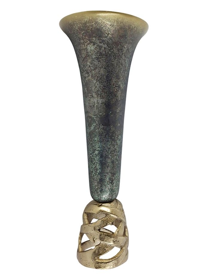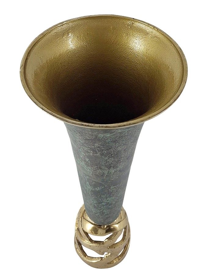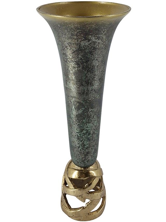 Изысканная ваза имеет высокую изящную форму, текстурную отделку на корпусе в абстрактном стиле и резное нижнее основание, выполнена из высококачественного алюминия в цвете античного золота с черным напылением. Поставьте изделие отдельно, в сочетании с предметами из этой коллекции или в составе роскошного цветочного букета на длинных стеблях. Силуэт и роскошная цветовая гамма позволяют этой вазе гармонично вписываться в переходный, современный, эклектичный и дворцовый стили.