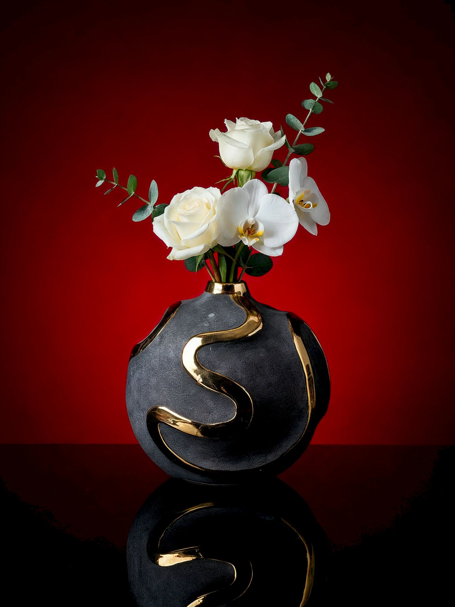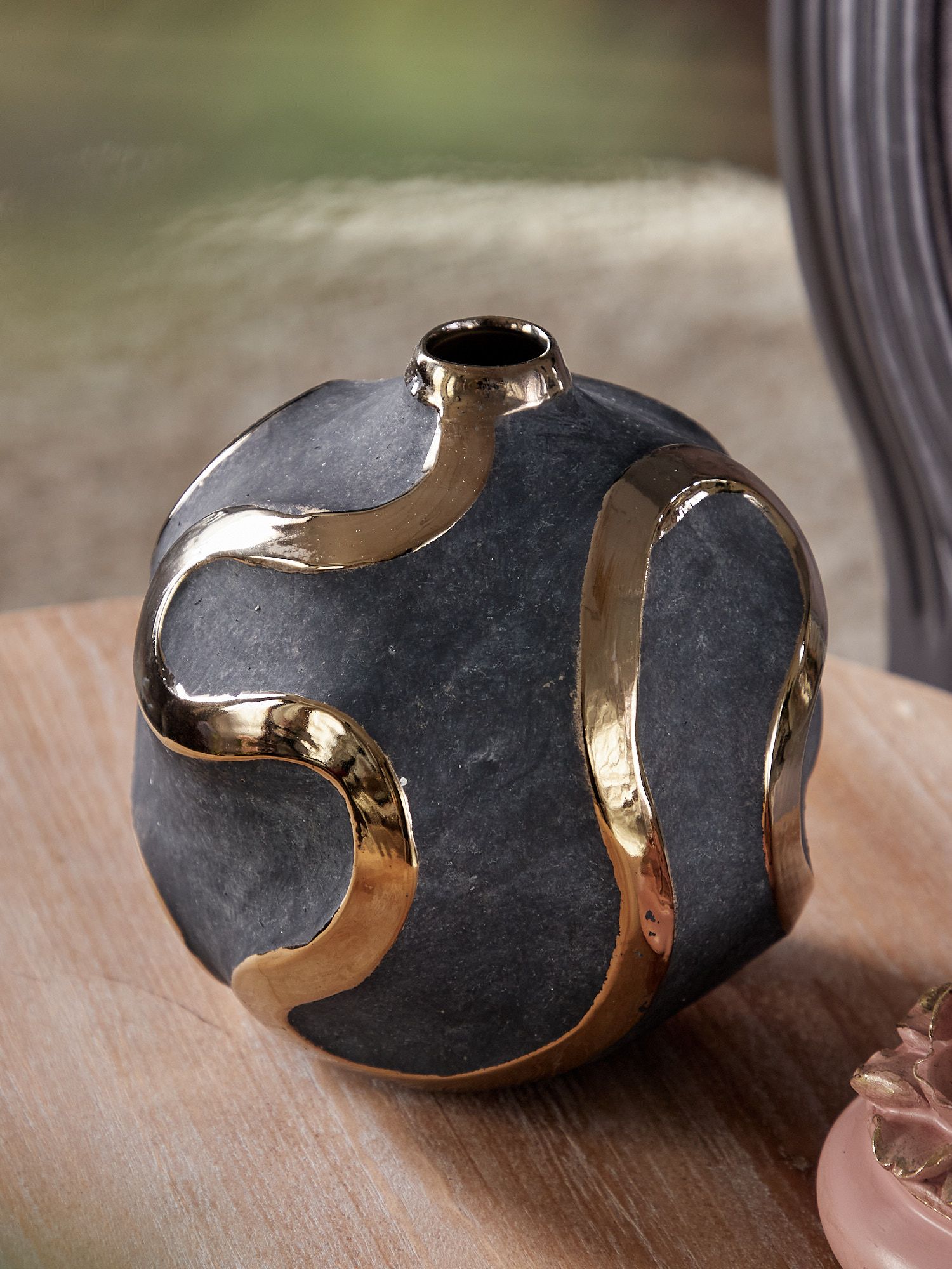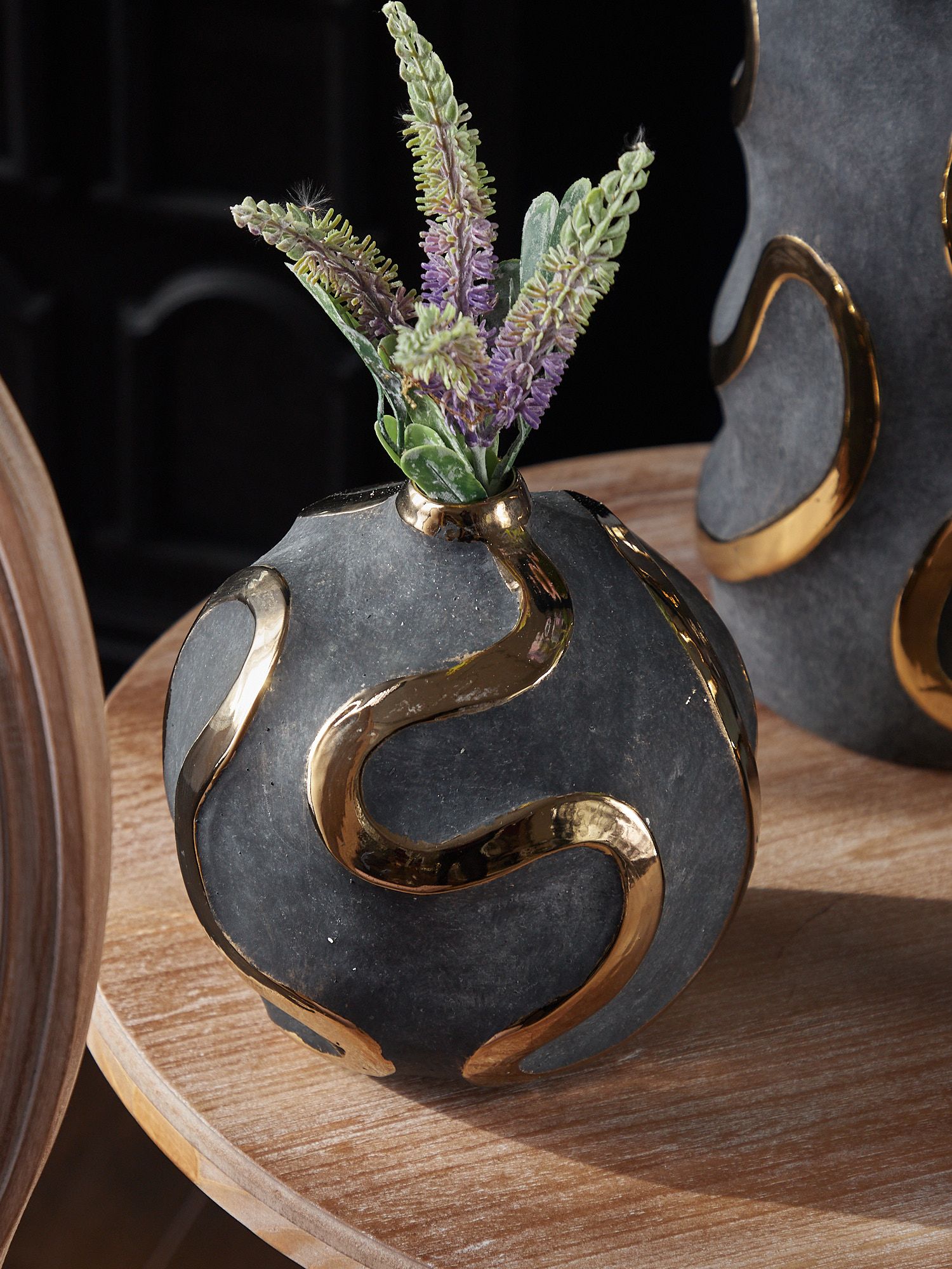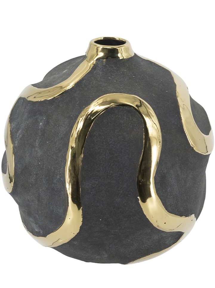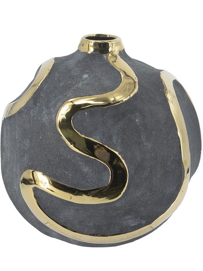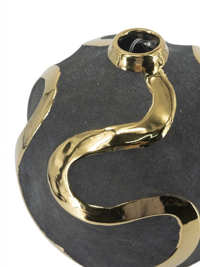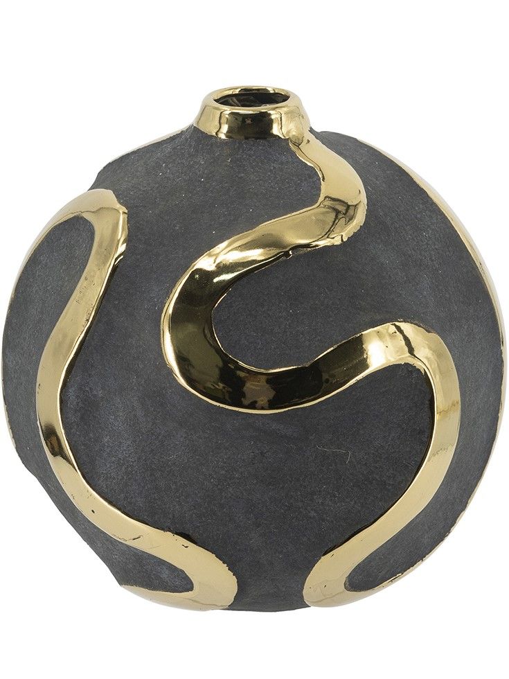 Элегантная форма вазы с яркими акцентными полосами на черном матовом фоне - это оригинальный вариант украшения вашего интерьера. Золотистый блеск на поверхности смотрится роскошно и стильно. Ваза идеально подойдет для шикарного офиса или гостиной.