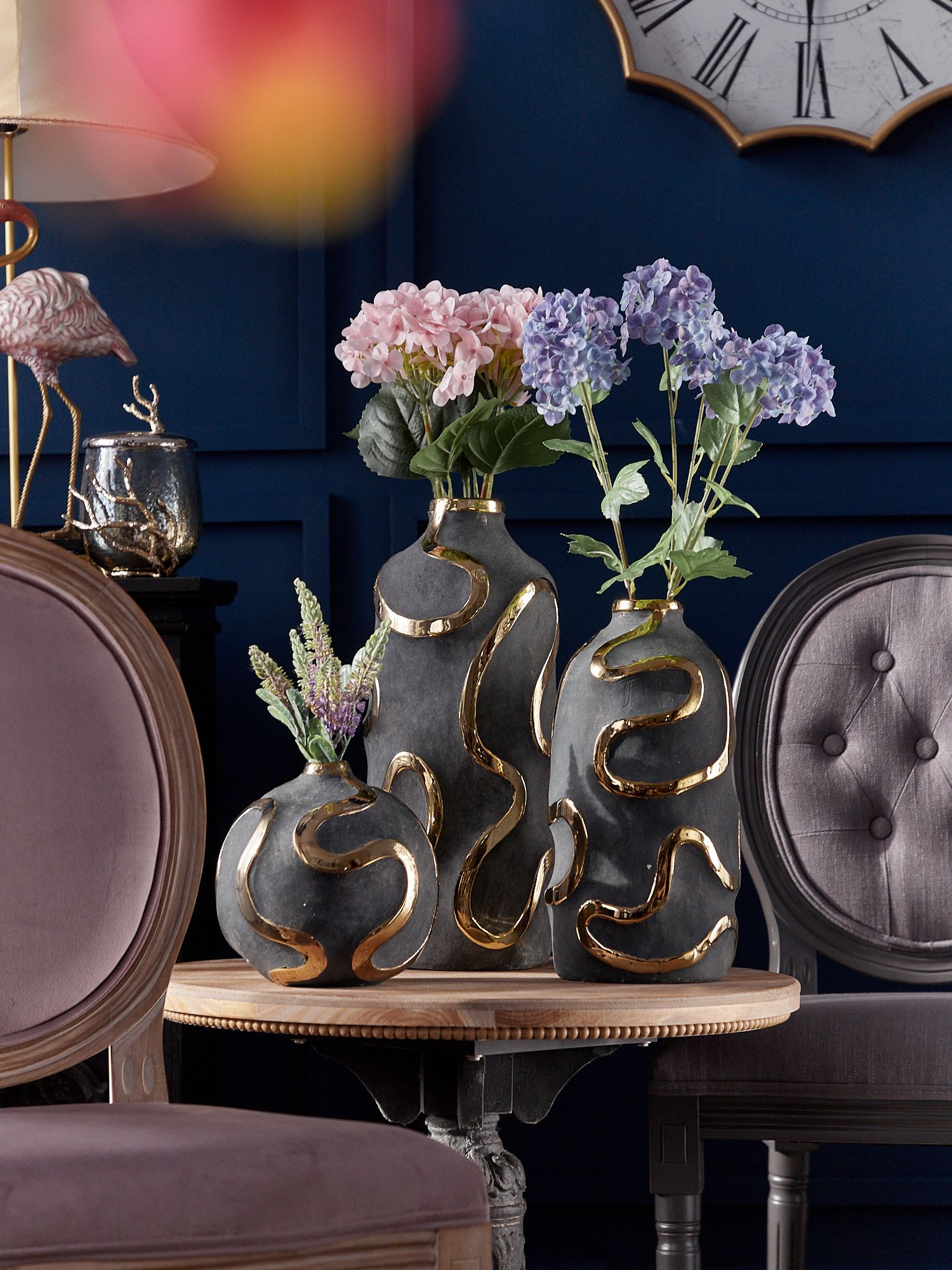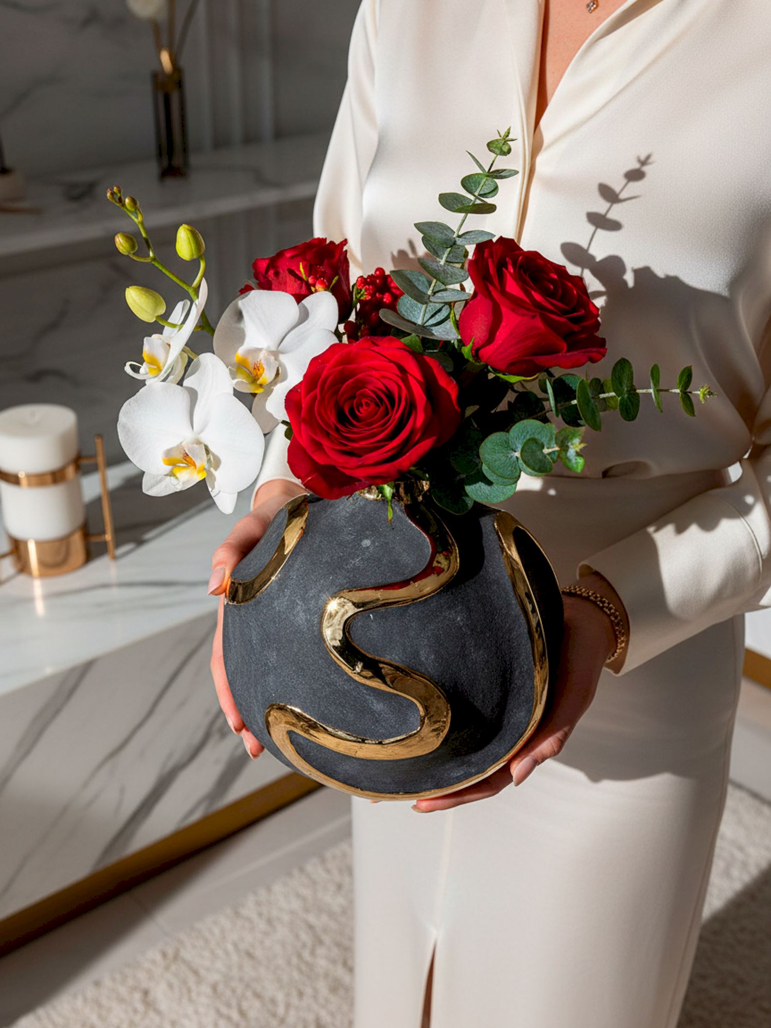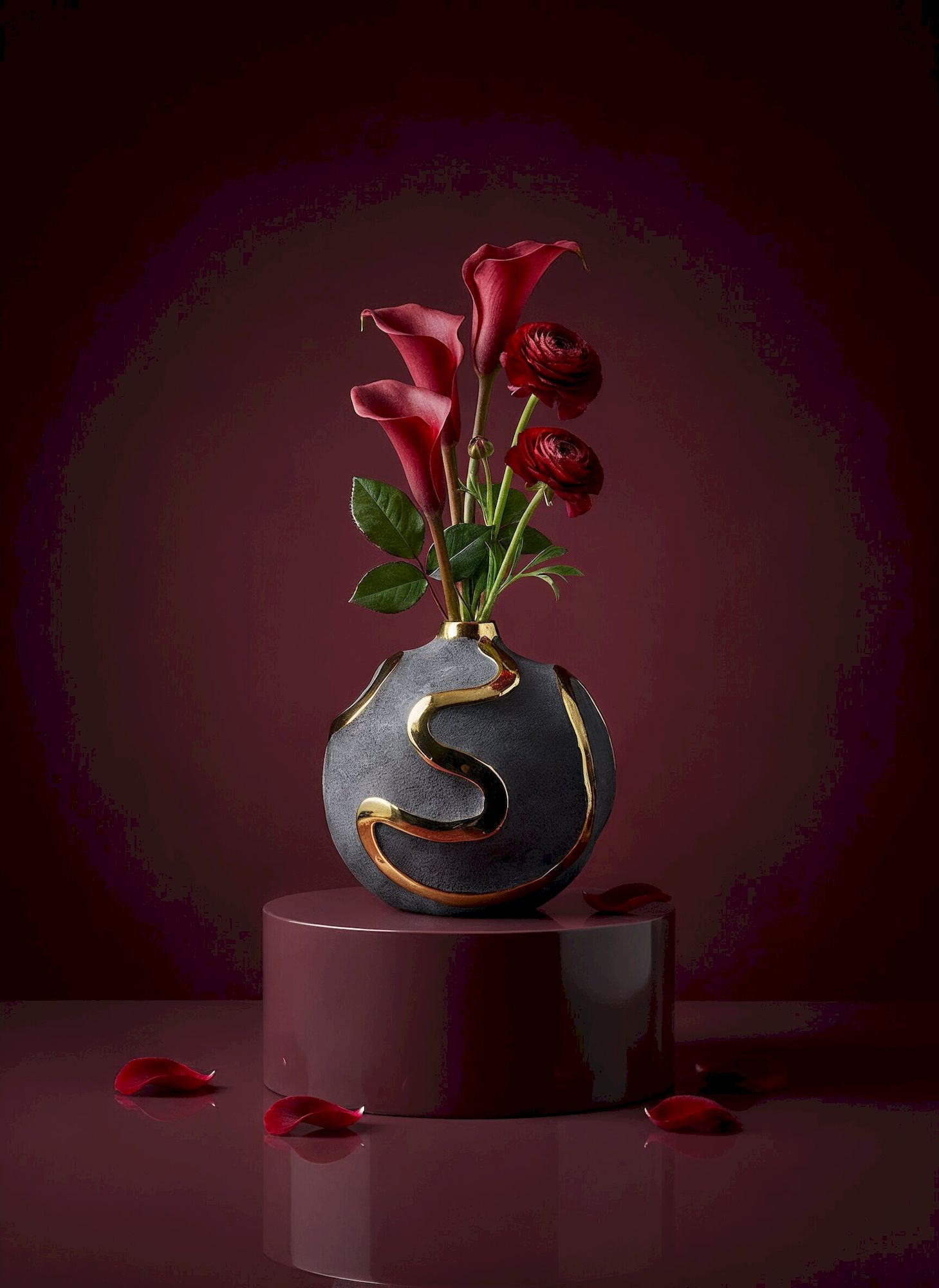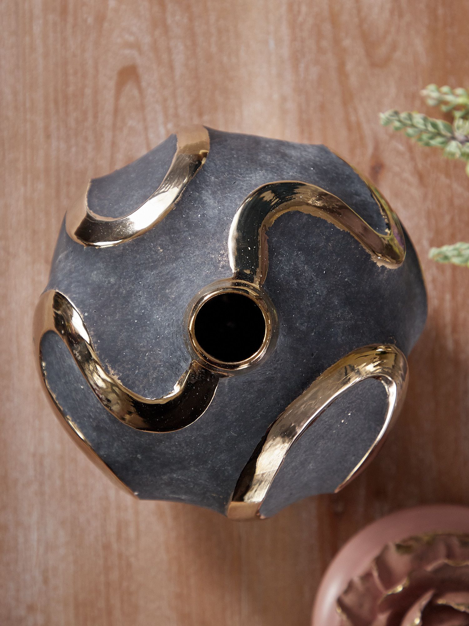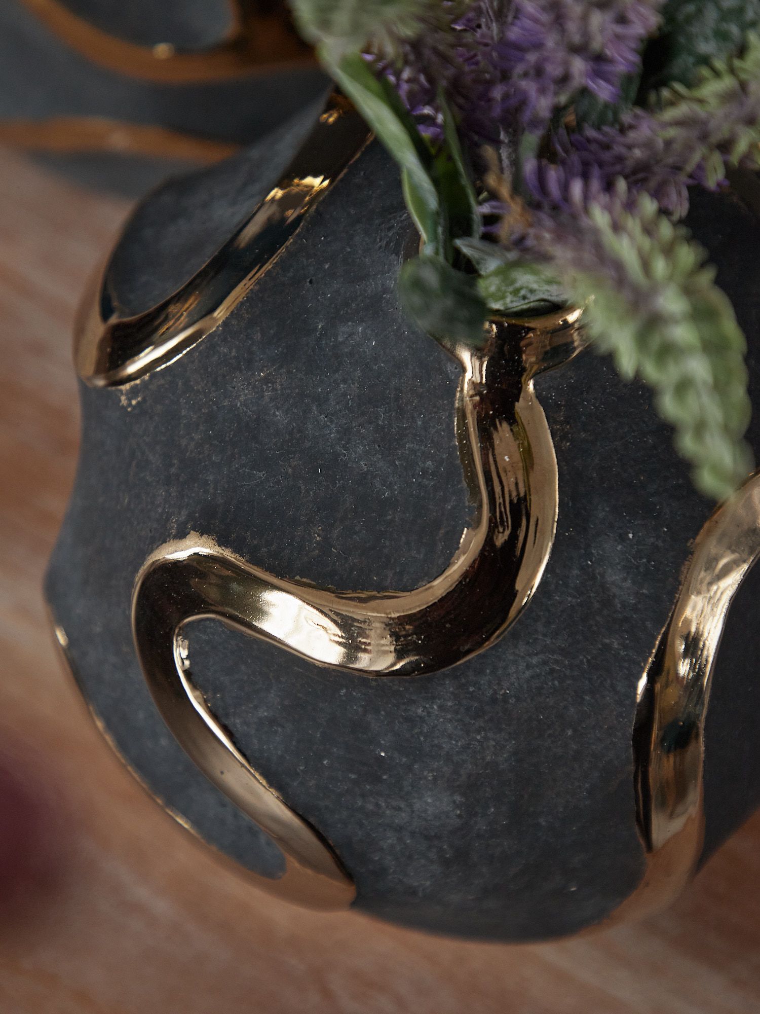 Элегантная форма вазы с яркими акцентными полосами на черном матовом фоне - это оригинальный вариант украшения вашего интерьера. Золотистый блеск на поверхности смотрится роскошно и стильно. Ваза идеально подойдет для шикарного офиса или гостиной.