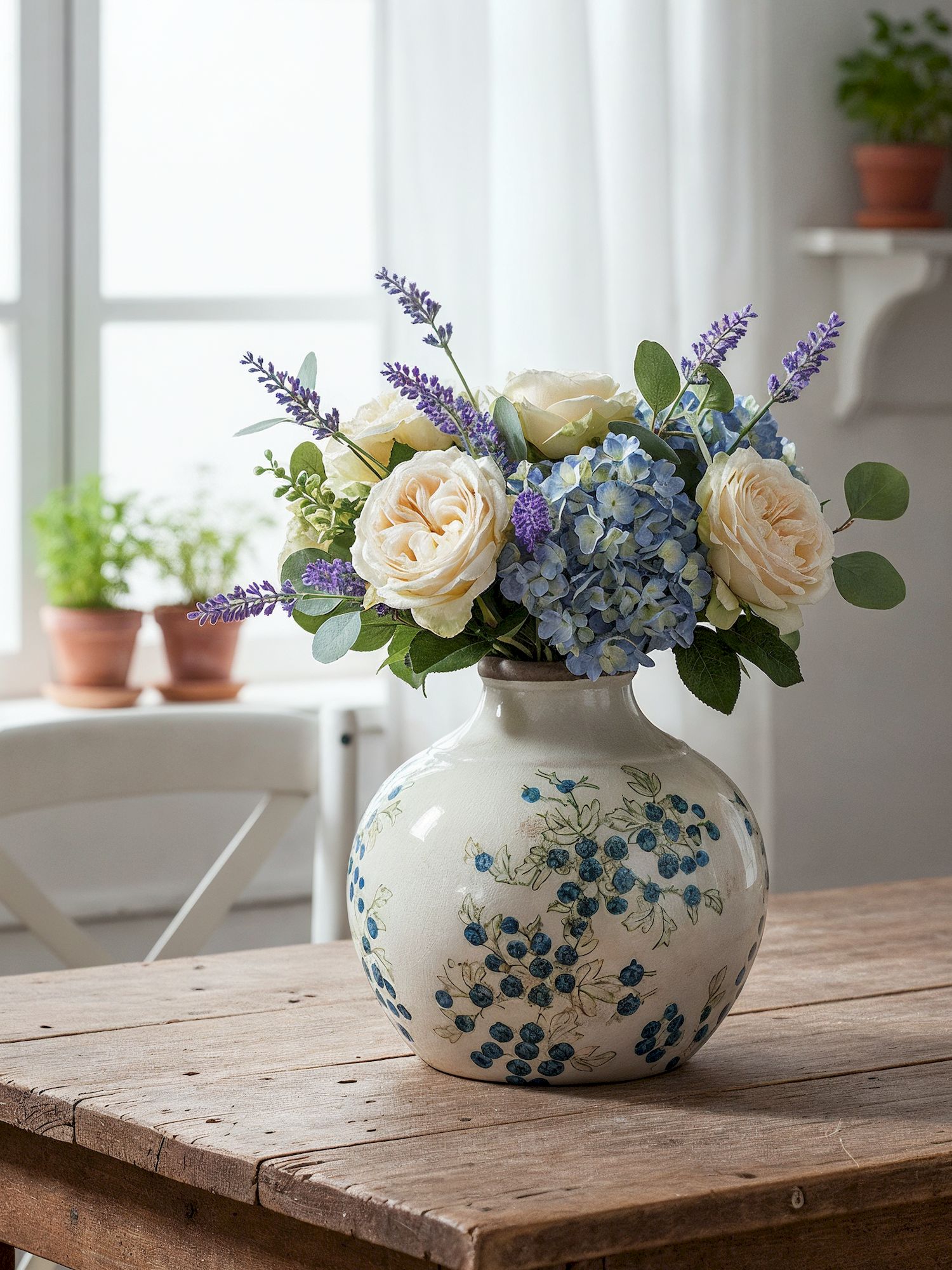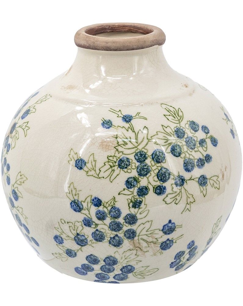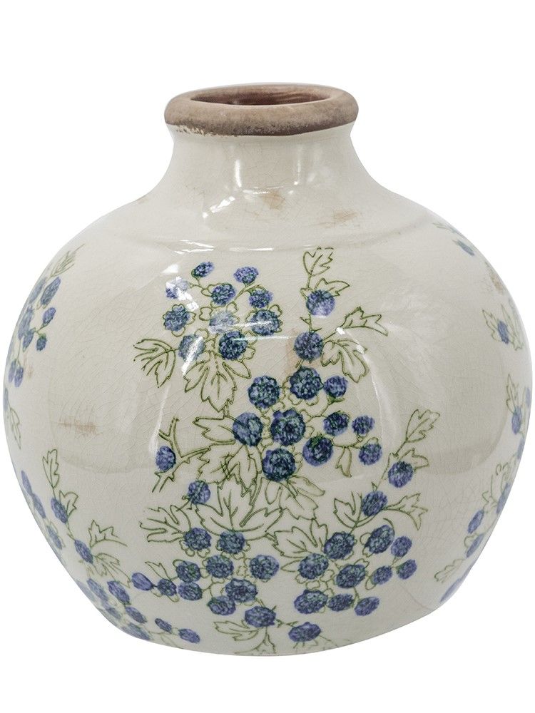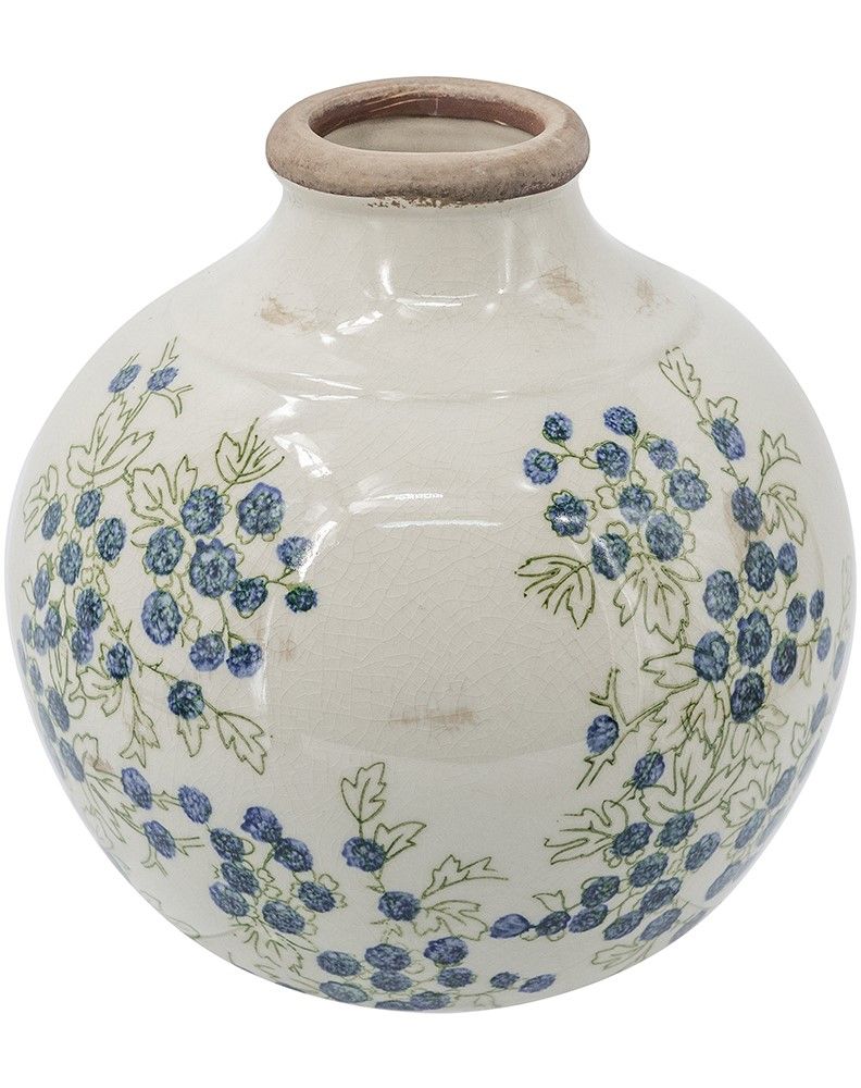 Эффектная ваза представляет собой округлую форму с ягодными узорами, которые выделяются на фоне белого цвета, подчеркнутого винтажным эффектом. Изделие идеально смотрится как отдельный предмет интерьера, так и в сочетании с пышной цветочной композицией, красочной коллекцией суккулентов или вьющихся растений, украшая вашу гостиную, столовую или прихожую.