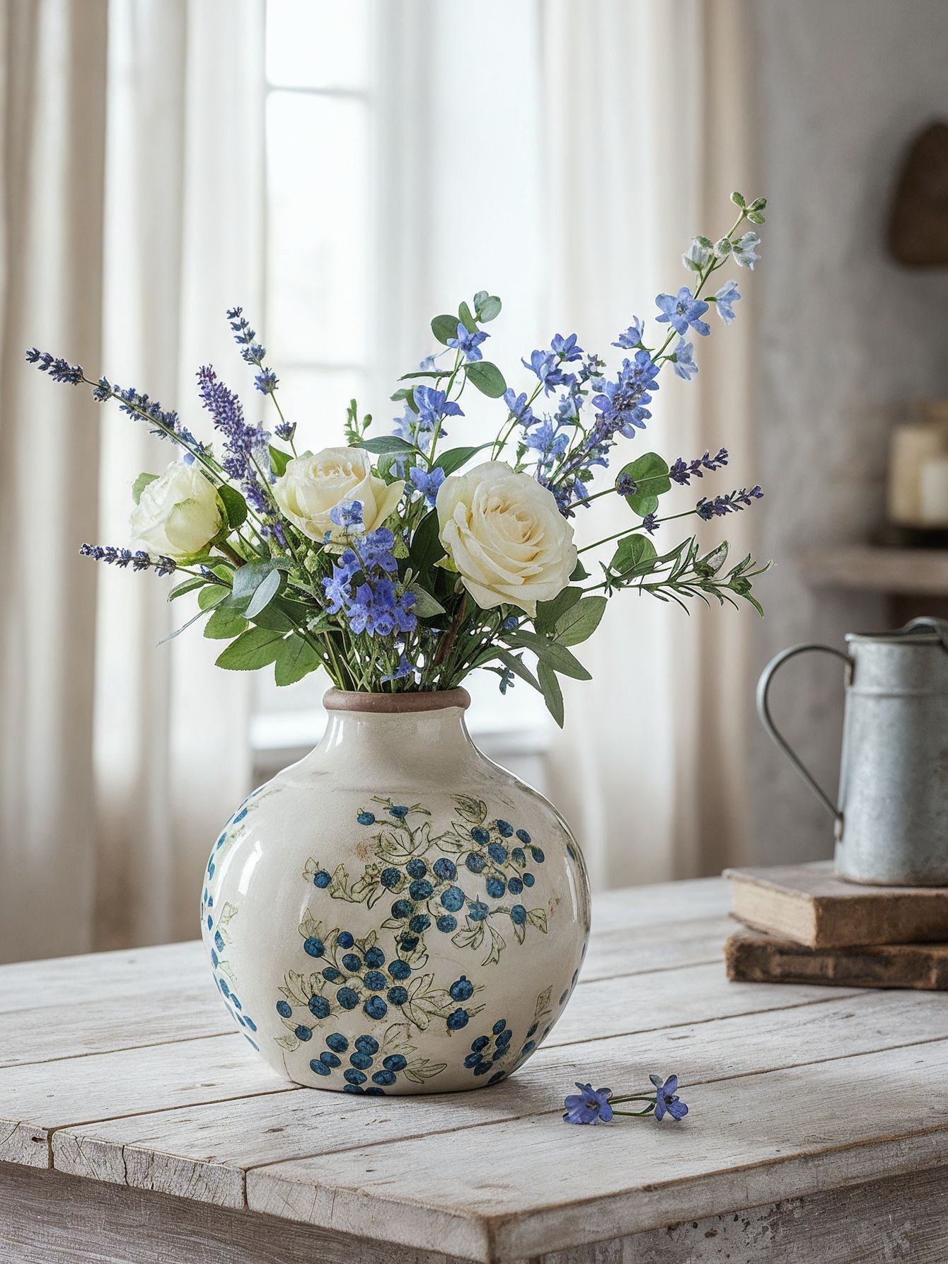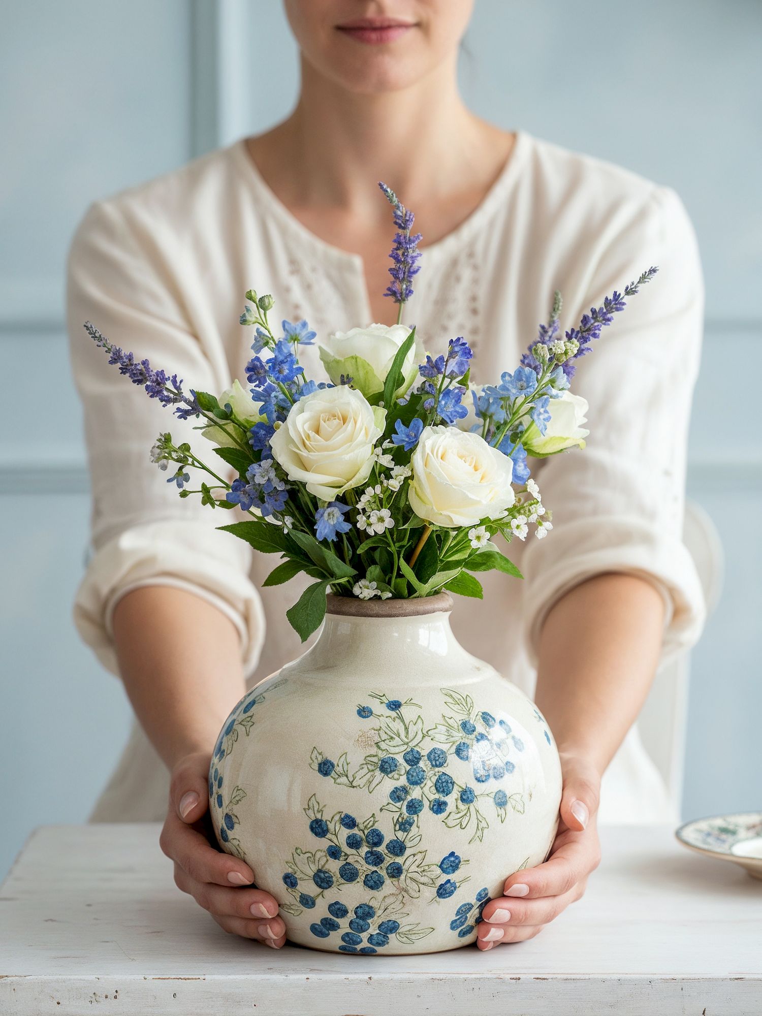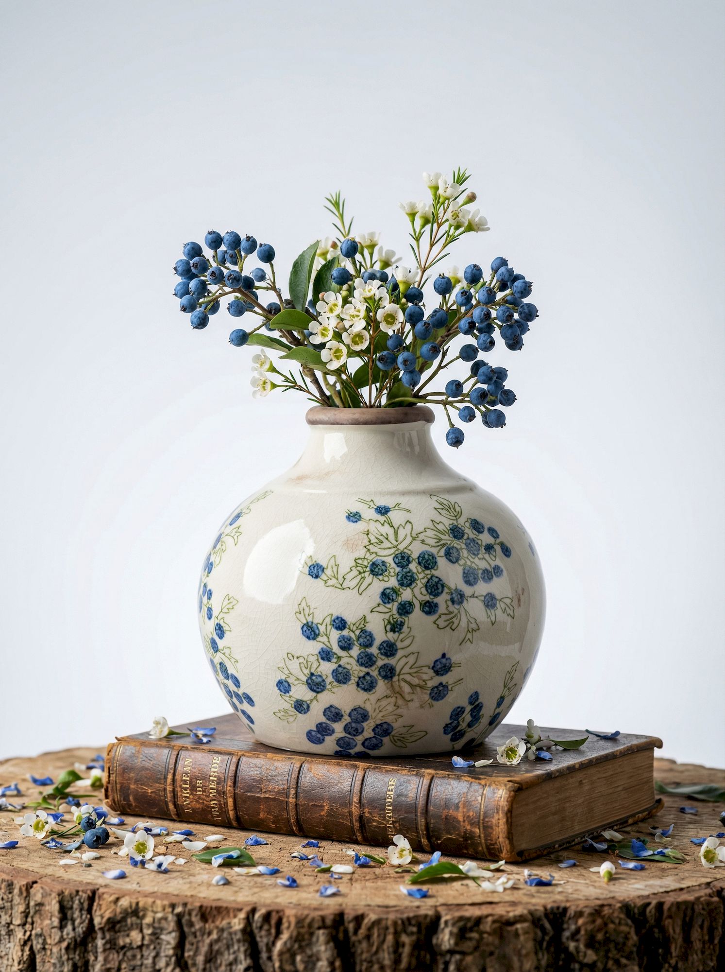 Эффектная ваза представляет собой округлую форму с ягодными узорами, которые выделяются на фоне белого цвета, подчеркнутого винтажным эффектом. Изделие идеально смотрится как отдельный предмет интерьера, так и в сочетании с пышной цветочной композицией, красочной коллекцией суккулентов или вьющихся растений, украшая вашу гостиную, столовую или прихожую.