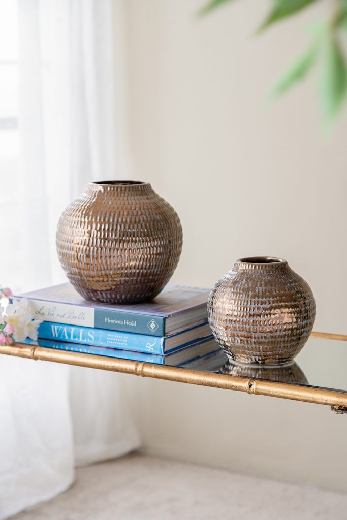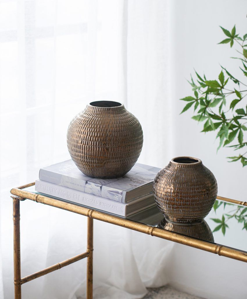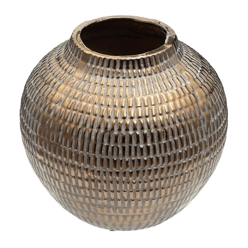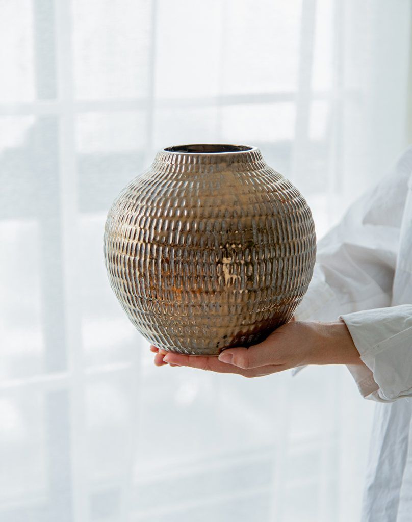 Круглая ваза отличается яркой текстурой, которая блестит на свету благодаря металлической бронзовой глазури. Используйте для хранения цветов или в качестве отдельного украшения.