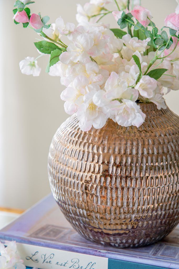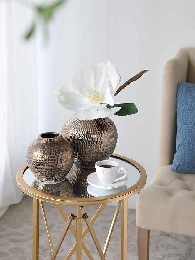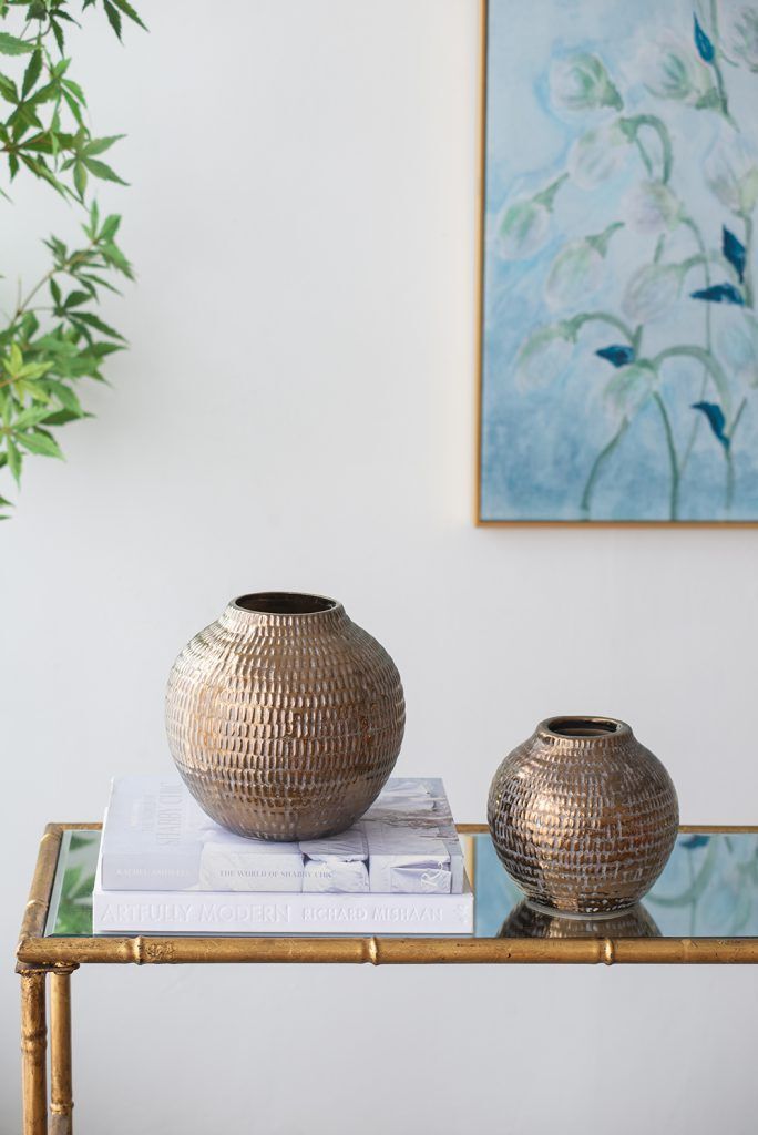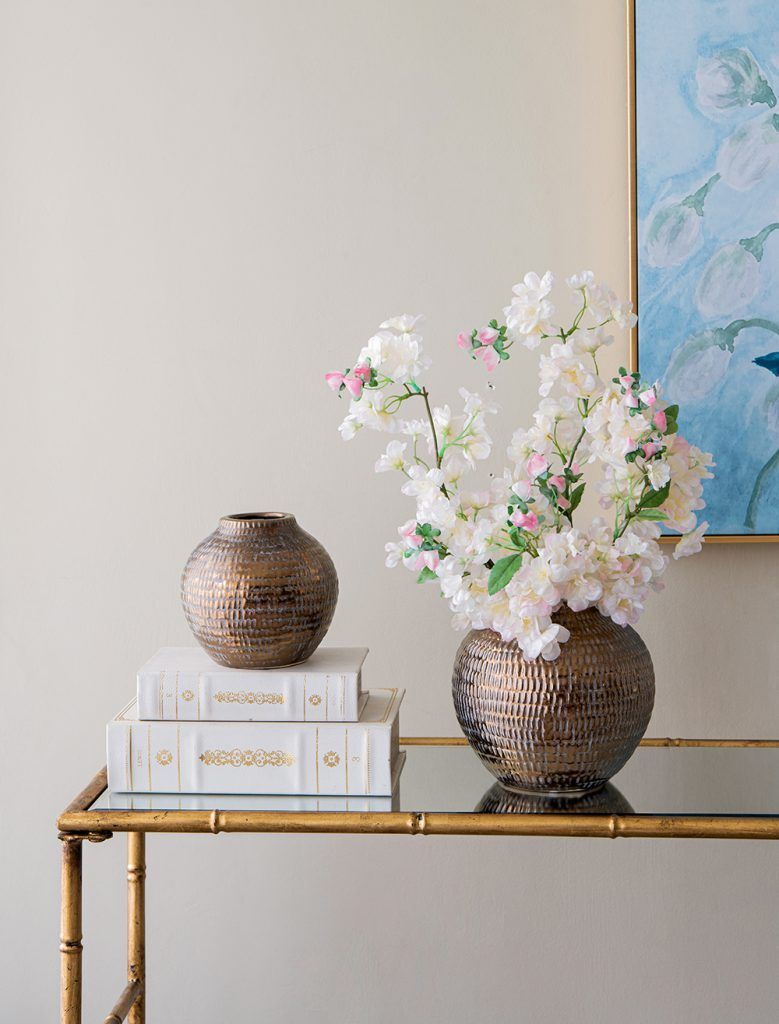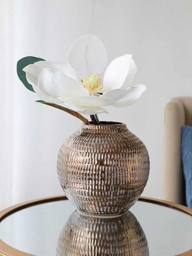 Круглая ваза отличается яркой текстурой, которая блестит на свету благодаря металлической бронзовой глазури. Используйте для хранения цветов или в качестве отдельного украшения.