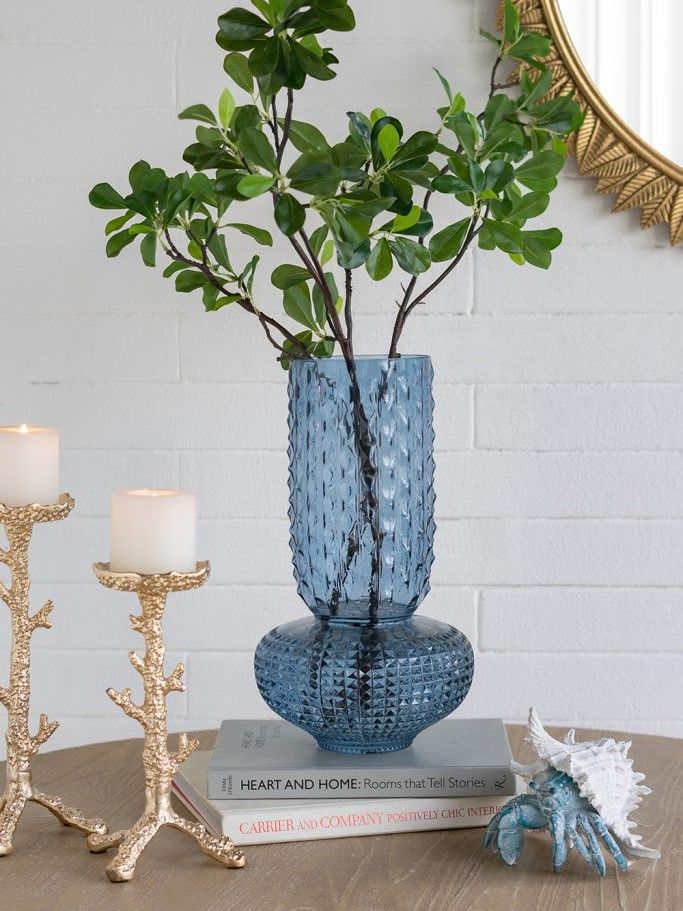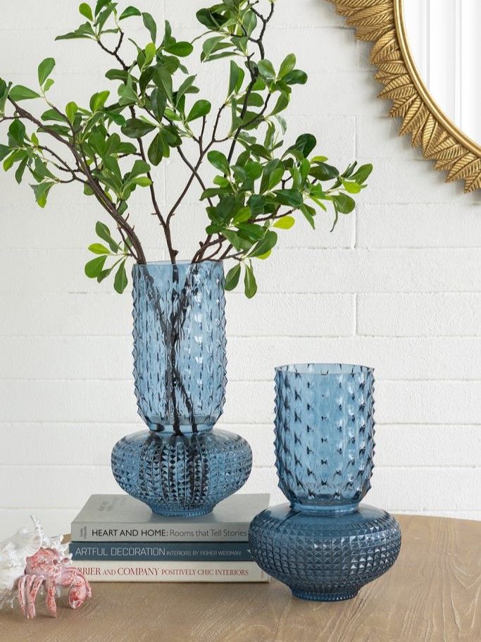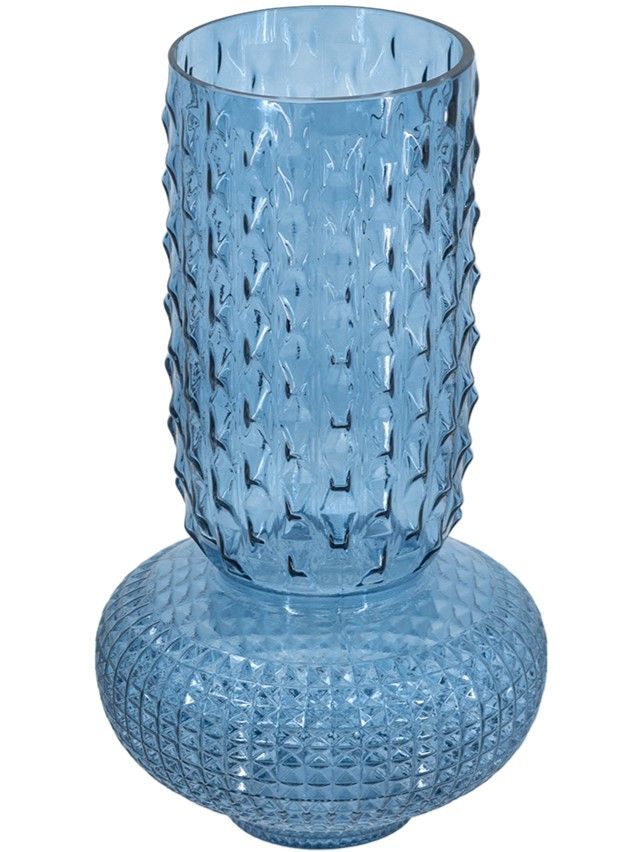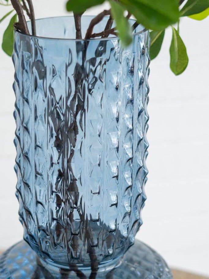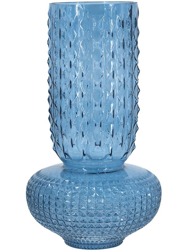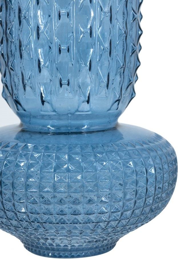 Изысканная стеклянная ваза с округлым скульптурным силуэтом, рельефной текстурой и насыщенным синим оттенком. Ваза идеально подходит для того, чтобы стать самостоятельным акцентом или дополнить композицию из пышных цветов. Смелая форма в античном стиле позволяет этому изделию дополнять интерьеры в переходном стиле, стиле модерн, эклектике и арт-деко.