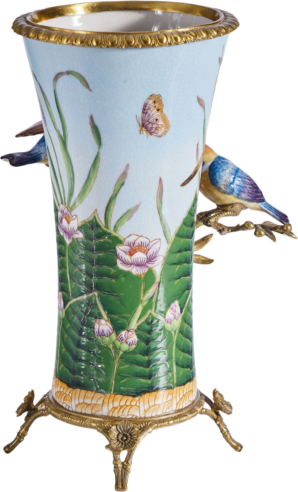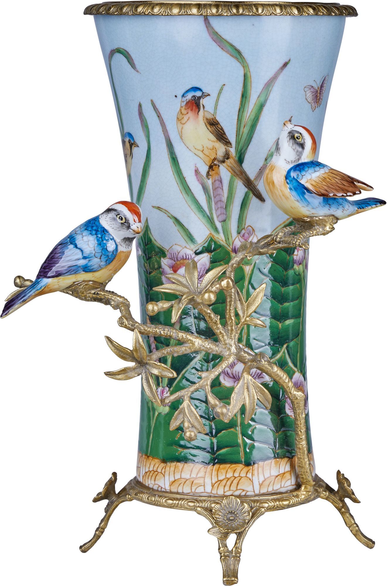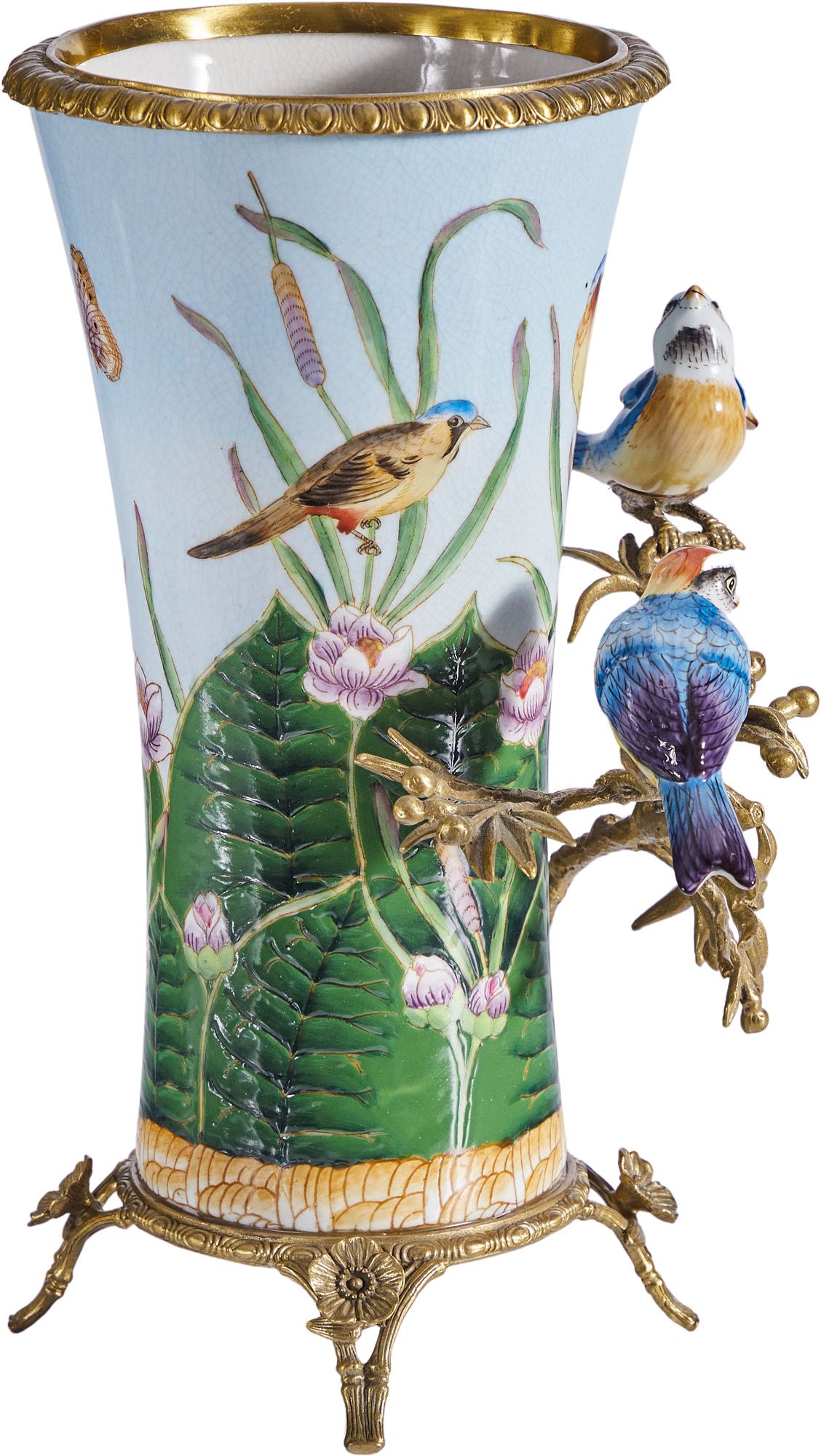 Изысканная ваза, выполненная из фарфора с бронзовыми элементами. Уникальное изделие ручной работы. При производстве этих художественных изделий из фарфора с бронзой используются вековые традиции китайских мастеров. Видимые трещинки (кракелюры) делаются по уникальной технологии, что придает более благородный вид старинного изделия.