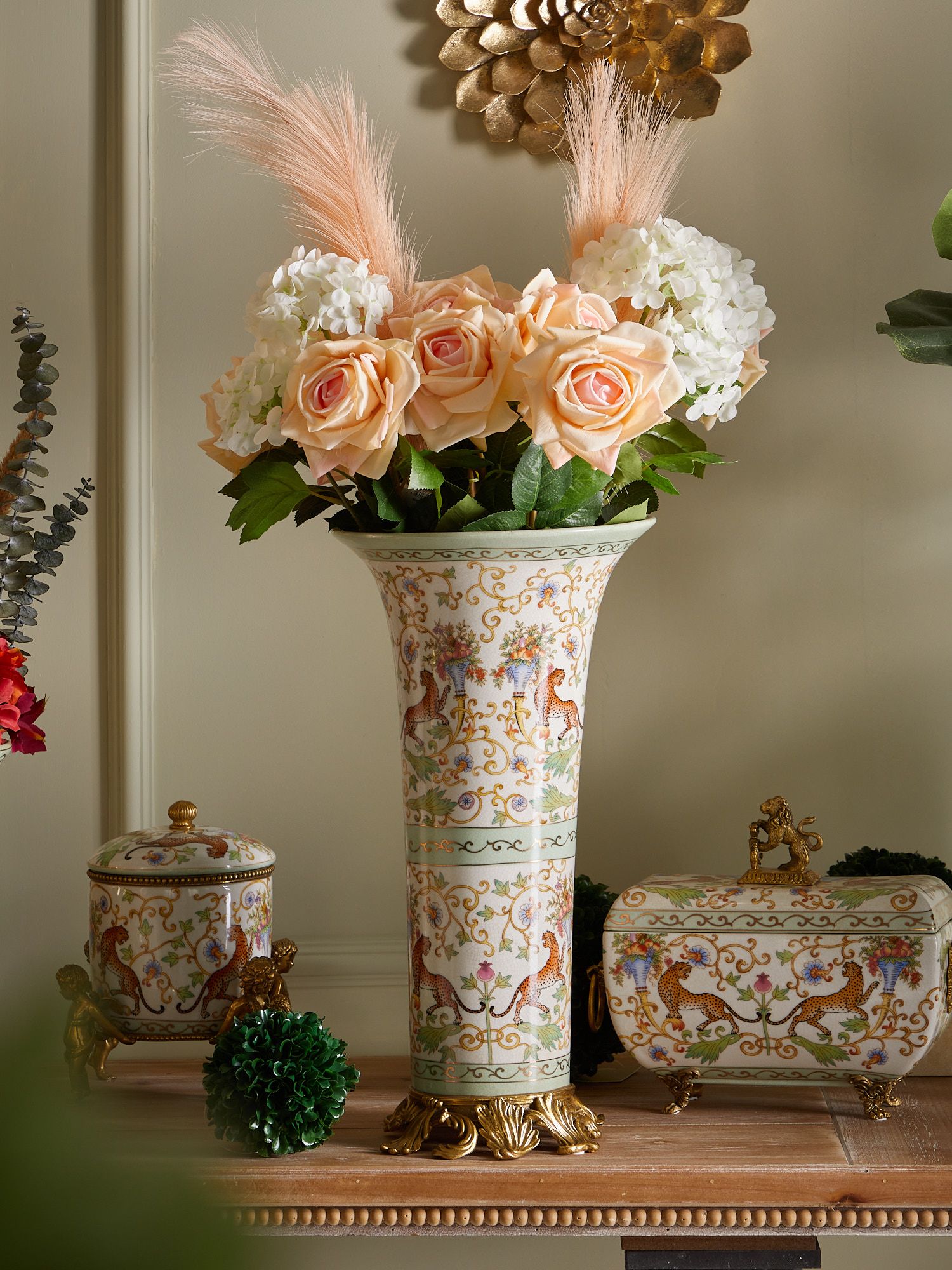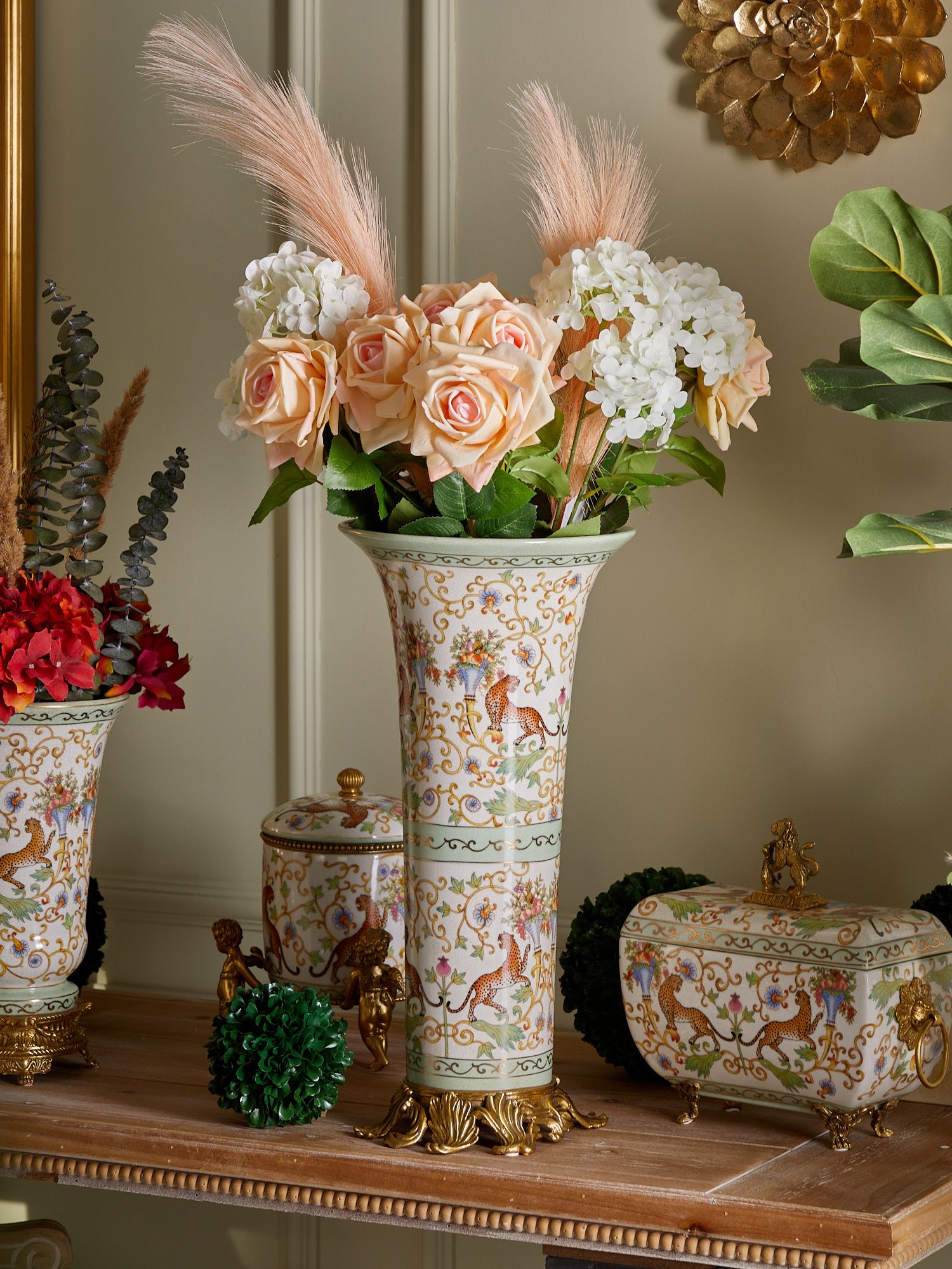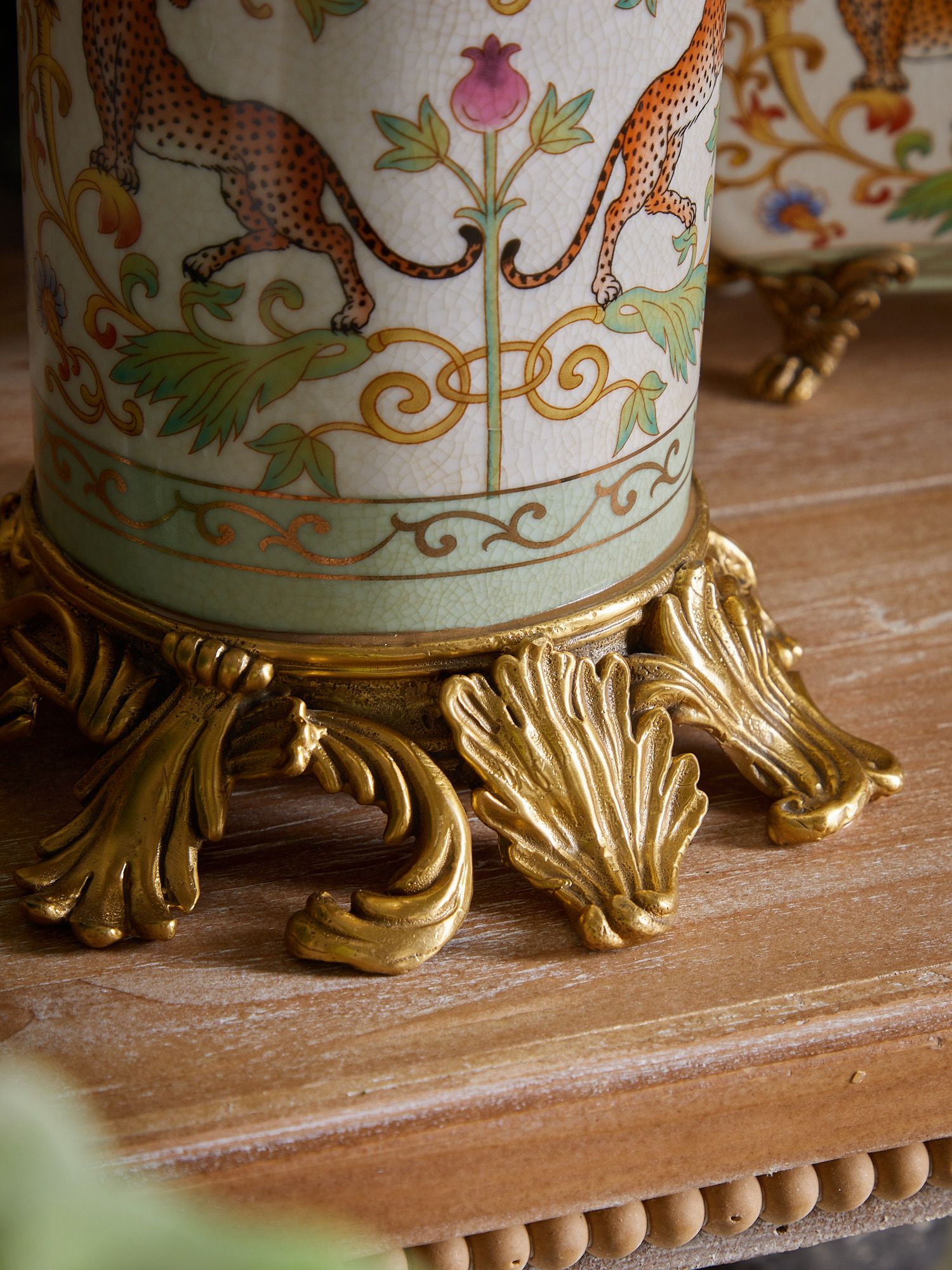 Ваза на подставке, выполненная из фарфора с бронзовыми элементами. Уникальное изделие ручной работы. При производстве этих художественных изделий из фарфора с бронзой используются вековые традиции китайских мастеров. Видимые трещинки (кракелюры) делаются по уникальной технологии, что придает более благородный вид старинного изделия.