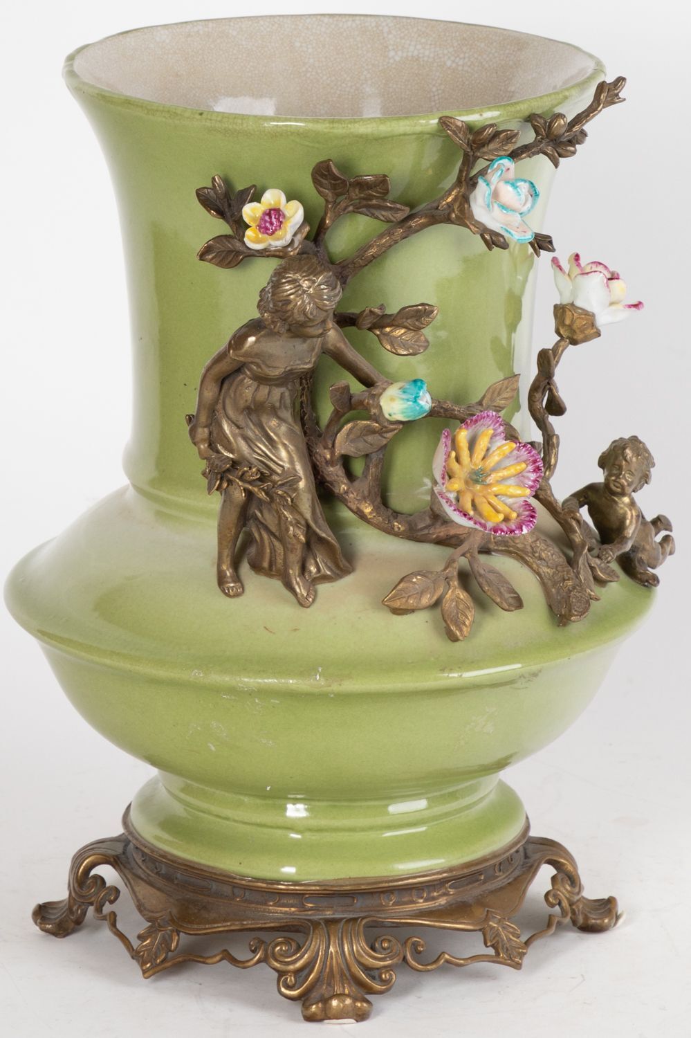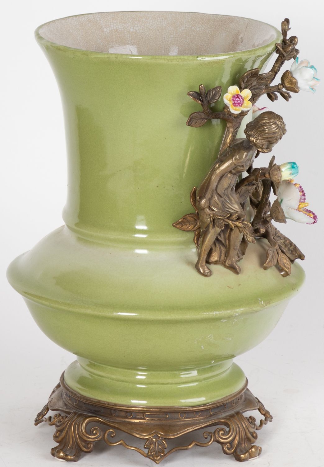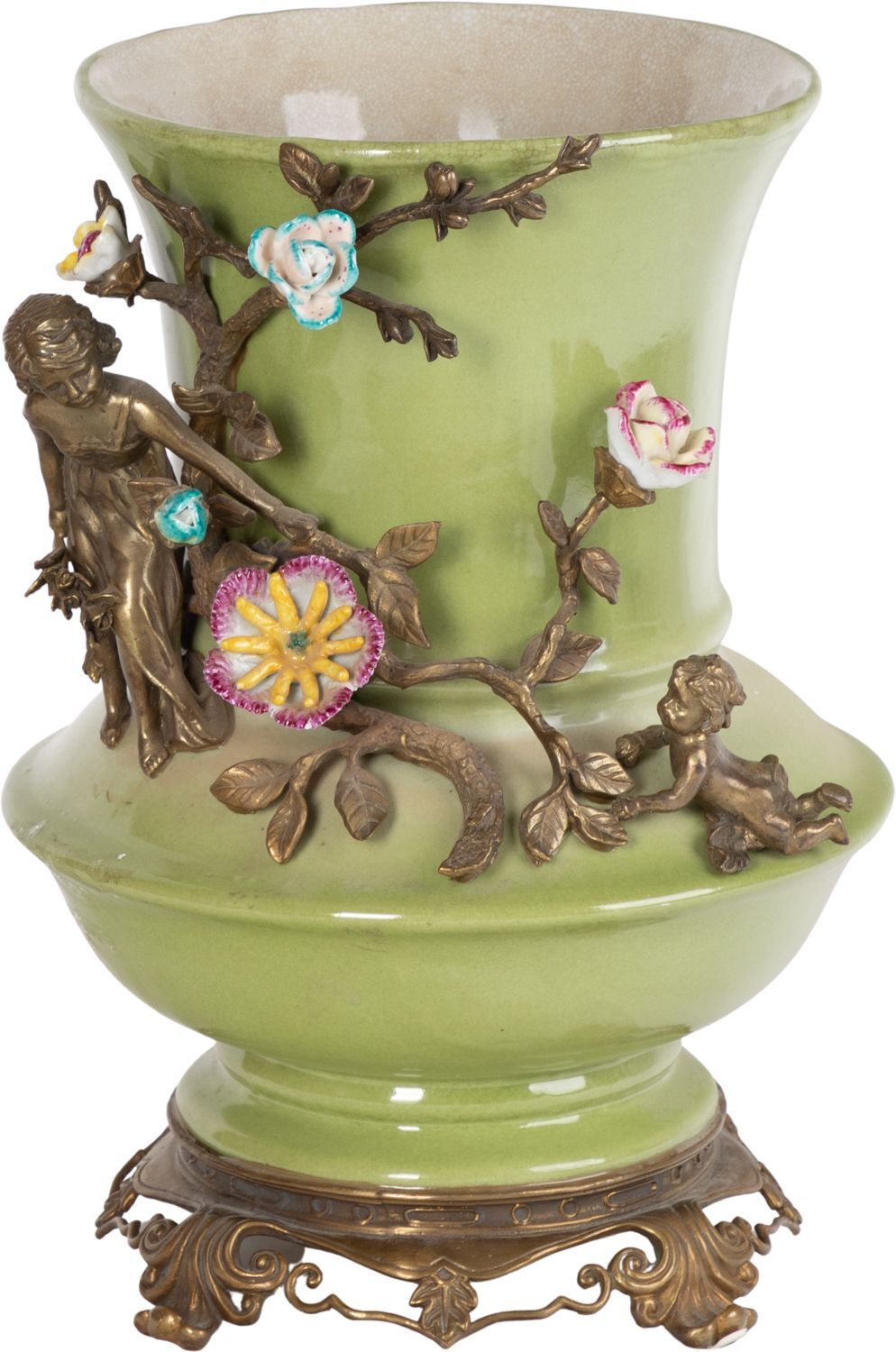 Ваза, выполненная из фарфора с бронзовыми элементами. Уникальное изделие ручной работы. При производстве этих художественных изделий из фарфора с бронзой используются вековые традиции китайских мастеров. Видимые трещинки (кракелюры) делаются по уникальной технологии, что придает более благородный вид старинного изделия.