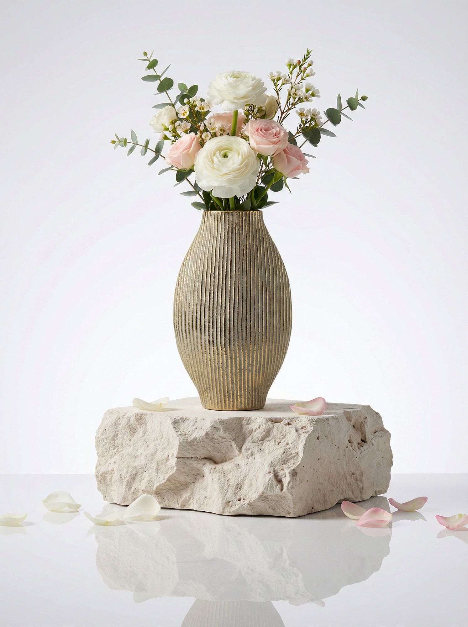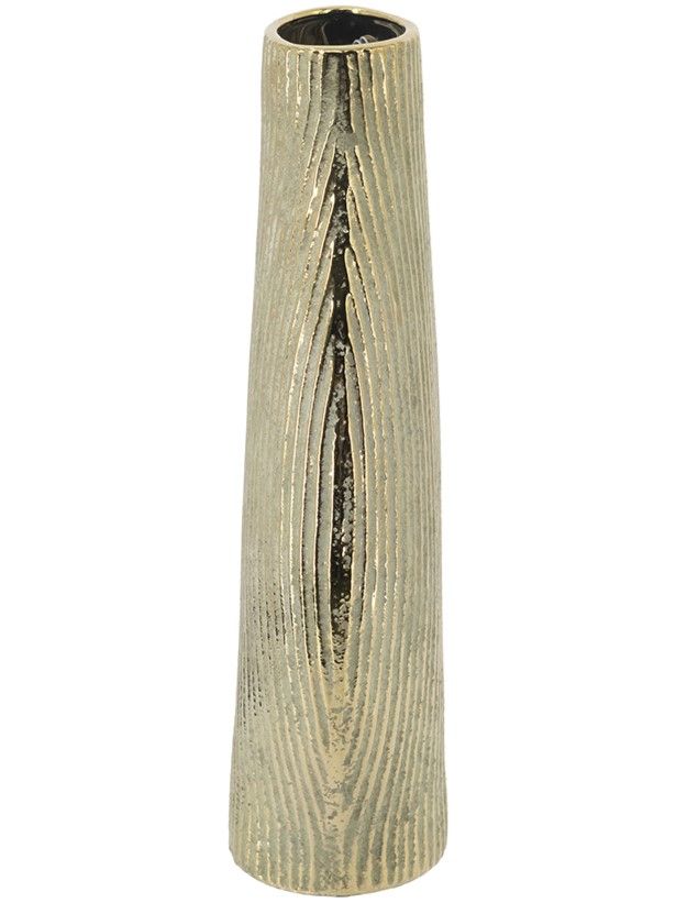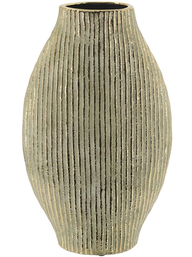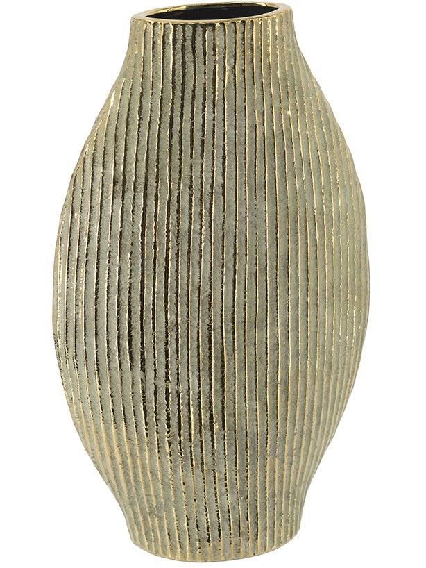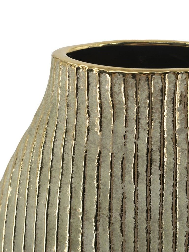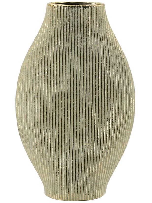 Керамическая ваза продемонстрирует классический силуэт, украшенный фактурной волнистой отделкой золотистого цвета. Независимо от того, выставлена ли она как отдельная часть декора или заполнена яркой коллекцией цветов, ваза обязательно послужит изысканным центральным элементом на вашем журнальном столике, каминной полке или серванте.