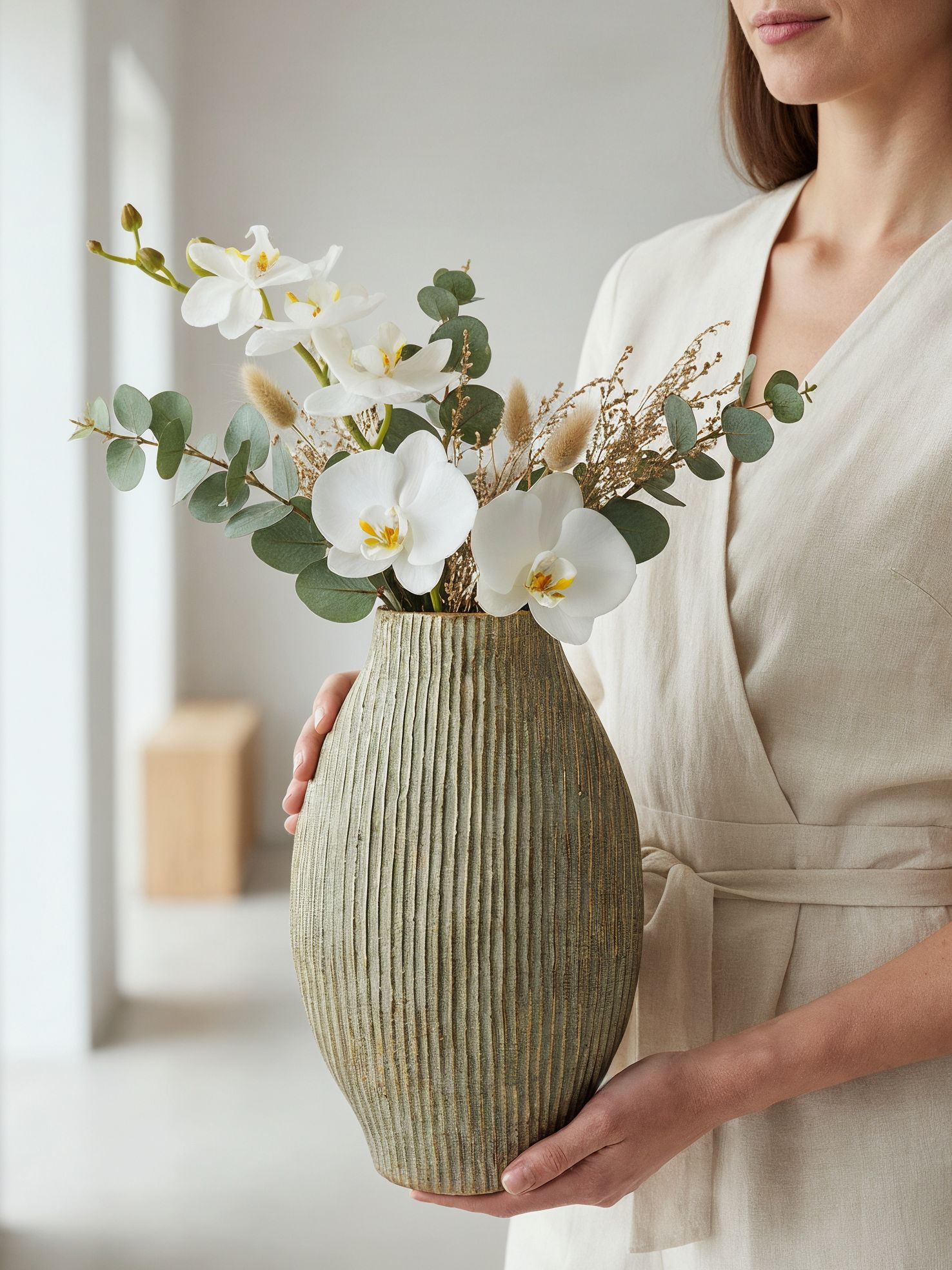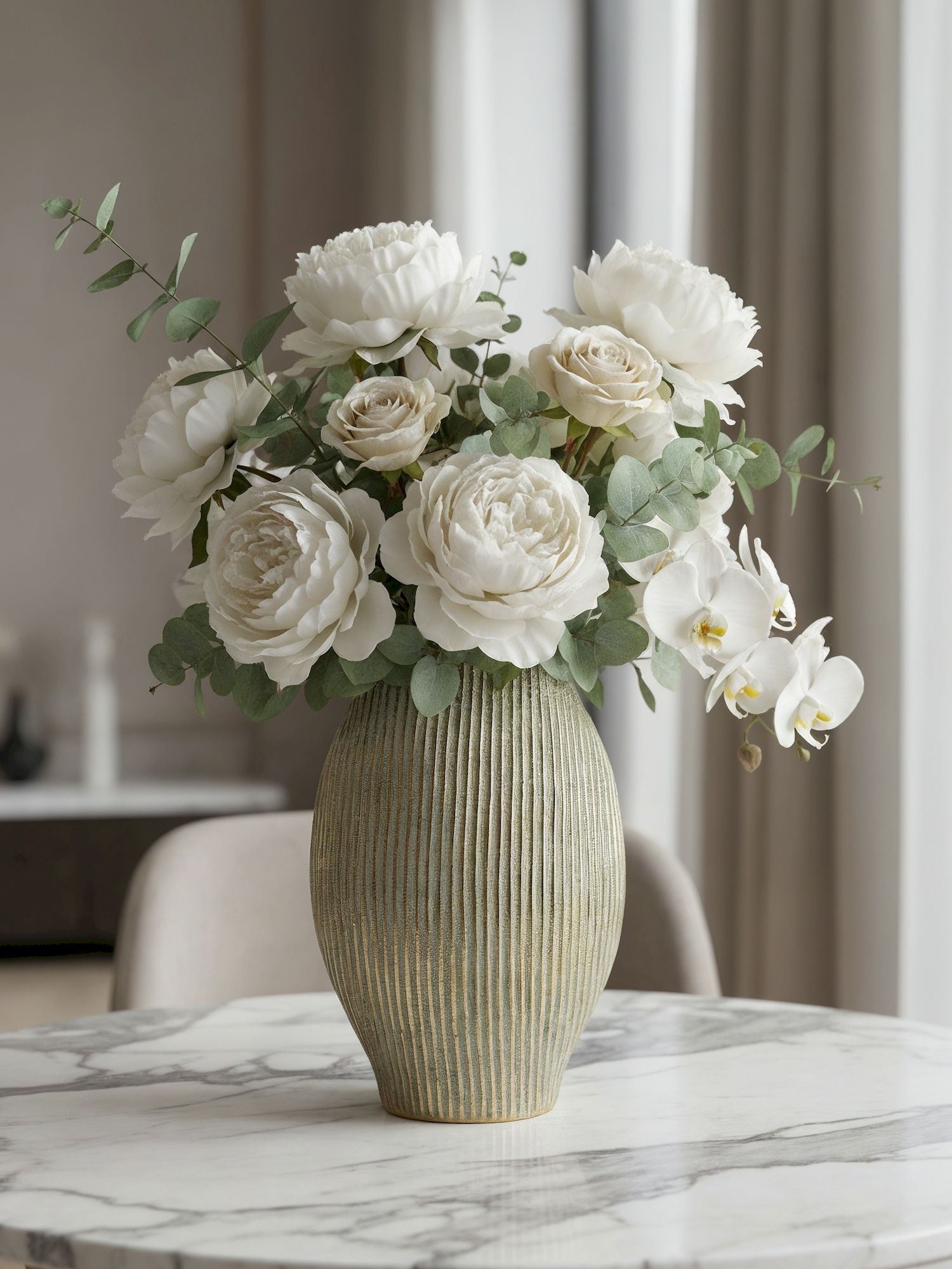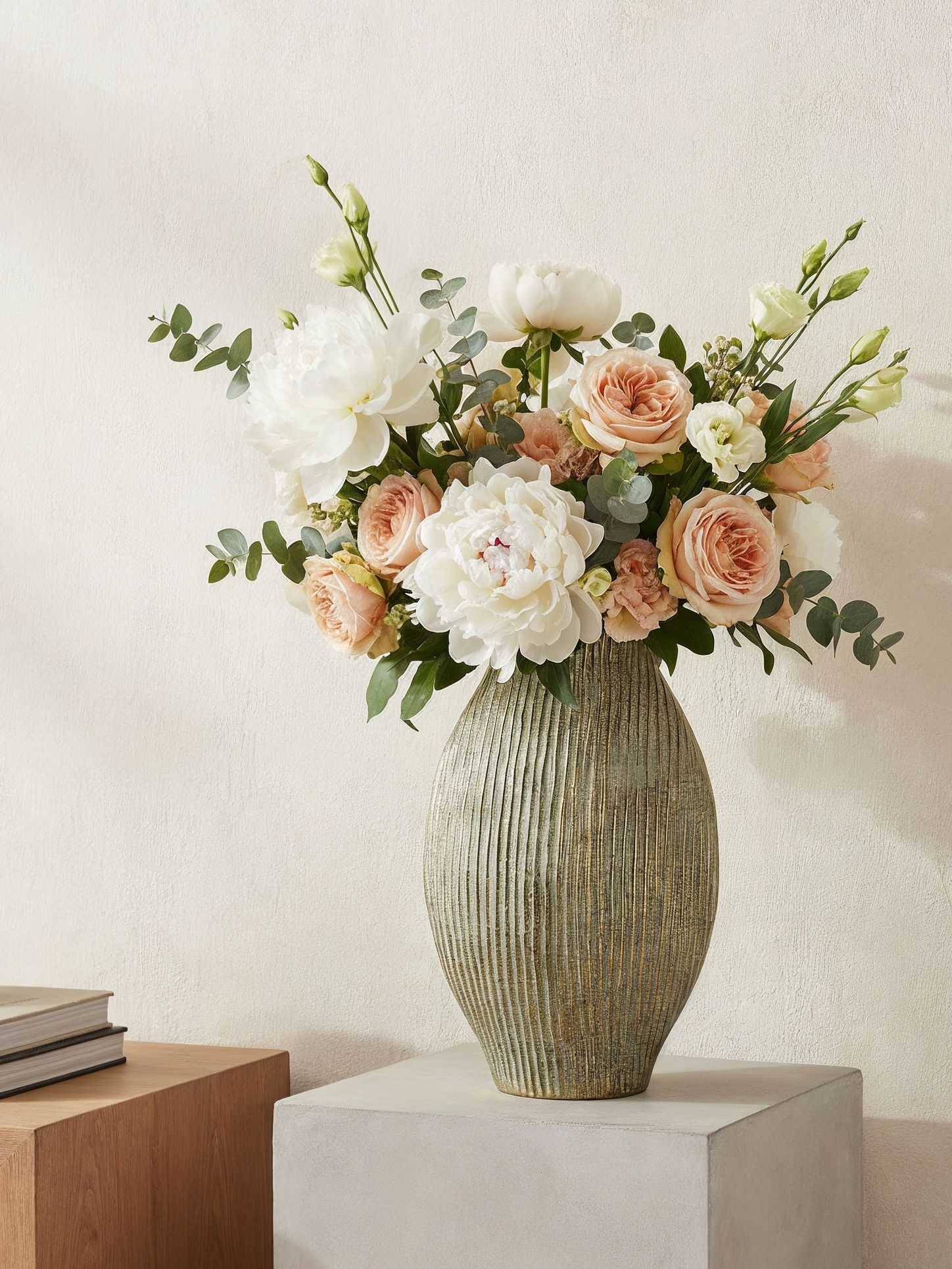 Керамическая ваза продемонстрирует классический силуэт, украшенный фактурной волнистой отделкой золотистого цвета. Независимо от того, выставлена ли она как отдельная часть декора или заполнена яркой коллекцией цветов, ваза обязательно послужит изысканным центральным элементом на вашем журнальном столике, каминной полке или серванте.