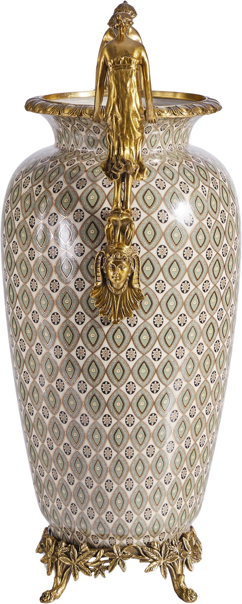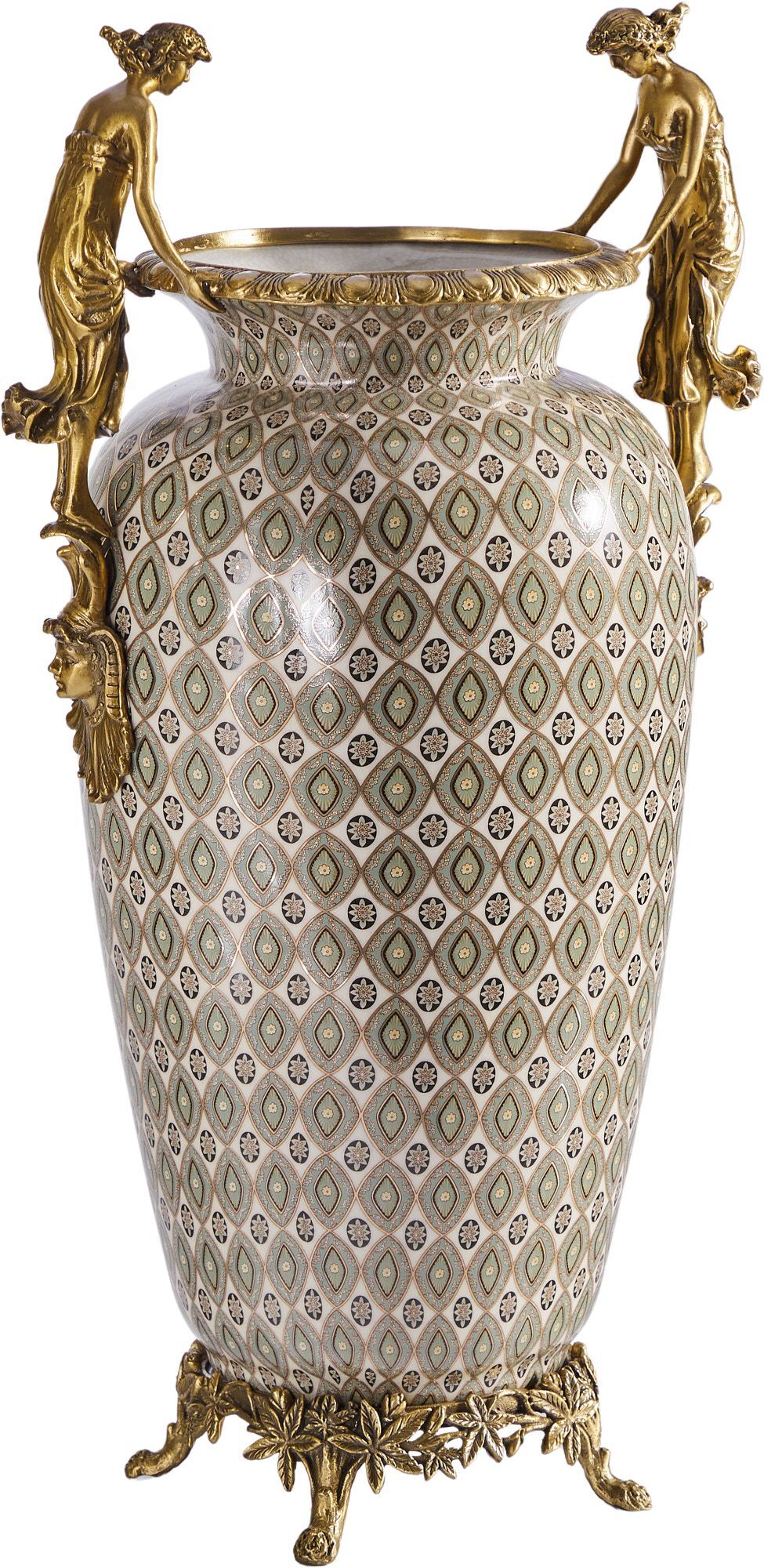 Великолепная ваза, декорированная фигурками, выполненная из фарфора с бронзовыми элементами. Уникальное изделие ручной работы. При производстве этих художественных изделий из фарфора с бронзой используются вековые традиции китайских мастеров. Видимые трещинки (кракелюры) делаются по уникальной технологии, что придает более благородный вид старинного изделия.
