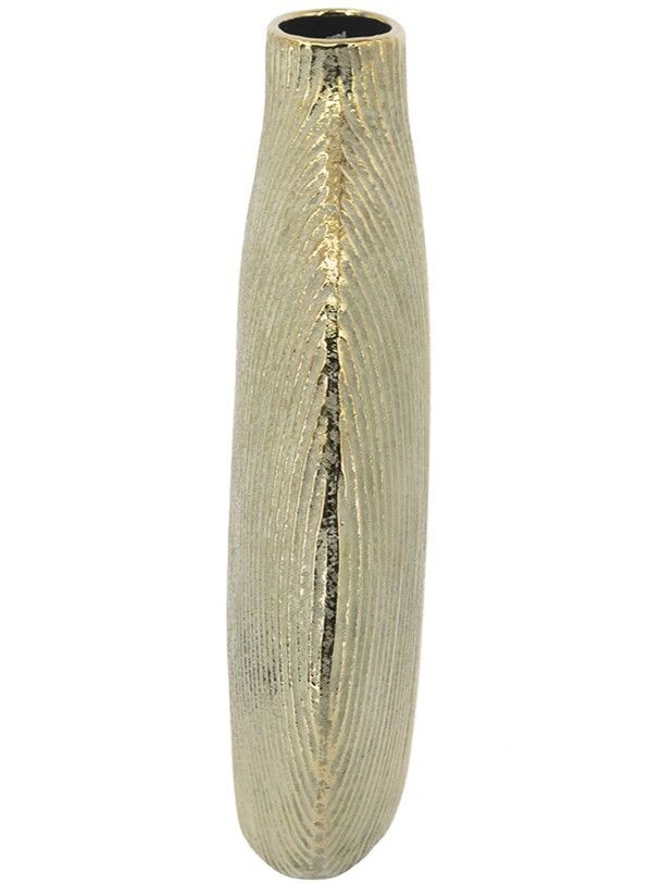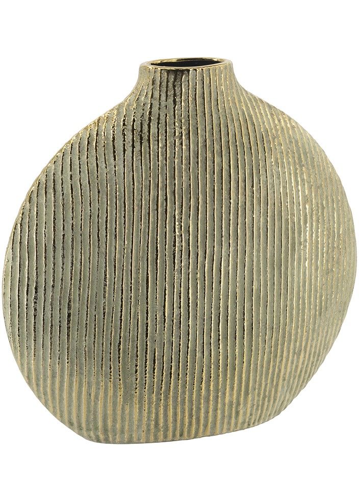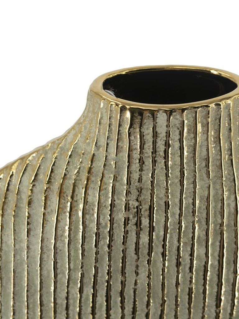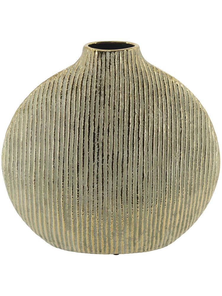 Керамическая ваза продемонстрирует круглый силуэт, украшенный фактурной волнистой отделкой золотистого цвета. Независимо от того, выставлена ли она как отдельная часть декора или заполнена яркой коллекцией цветов, ваза обязательно послужит изысканным центральным элементом на вашем журнальном столике, каминной полке или серванте.