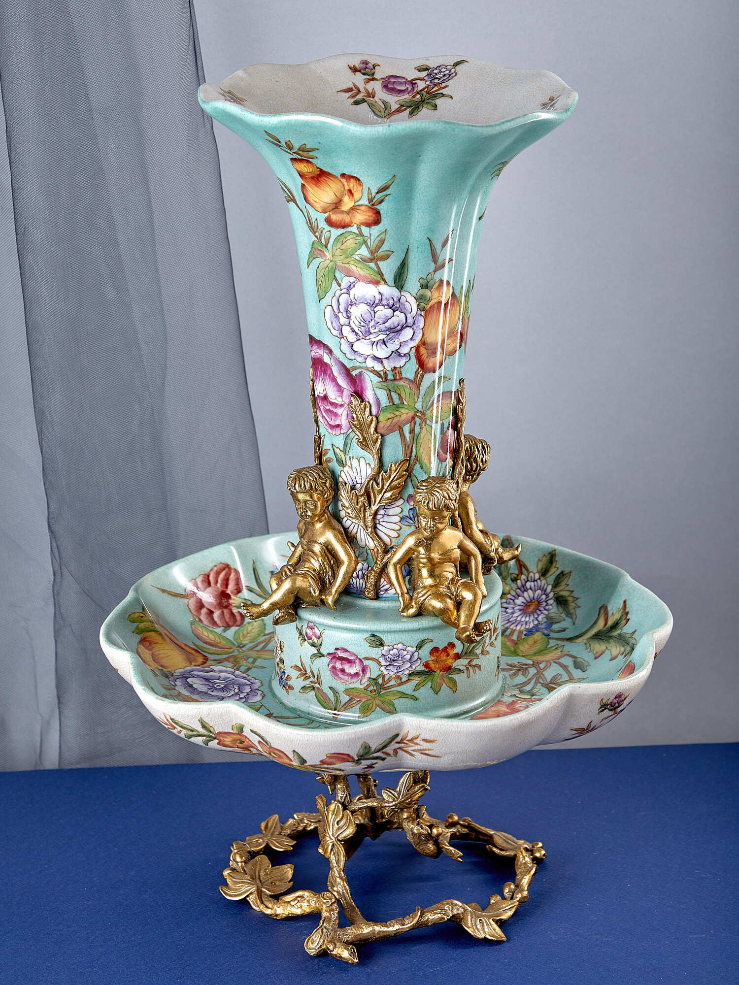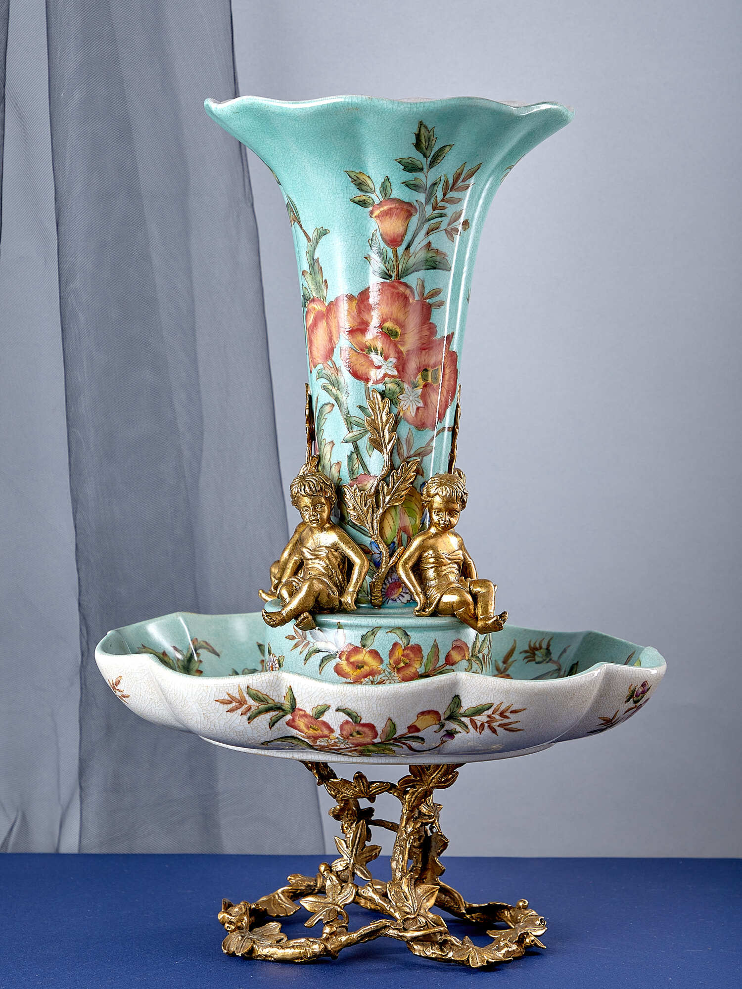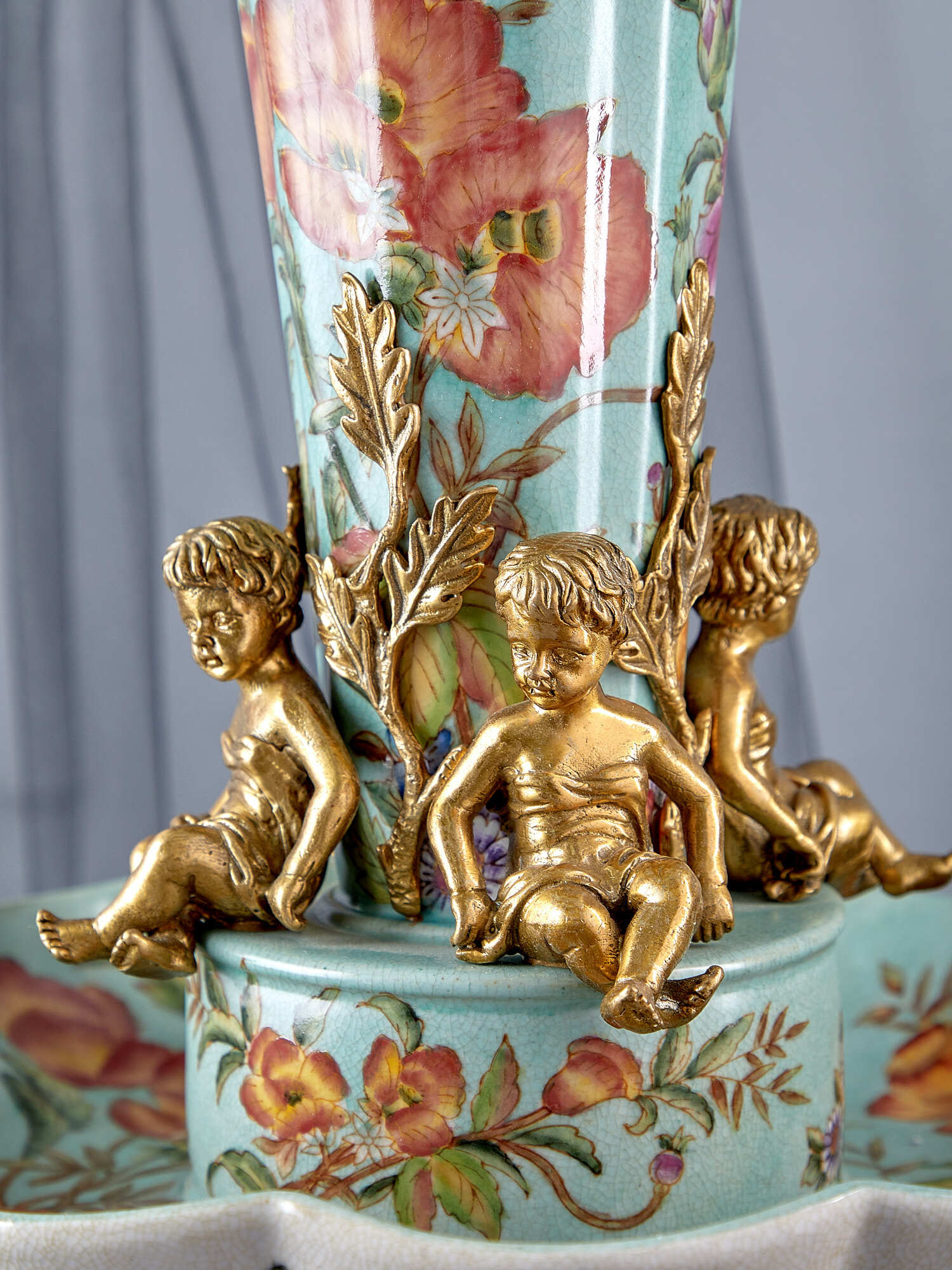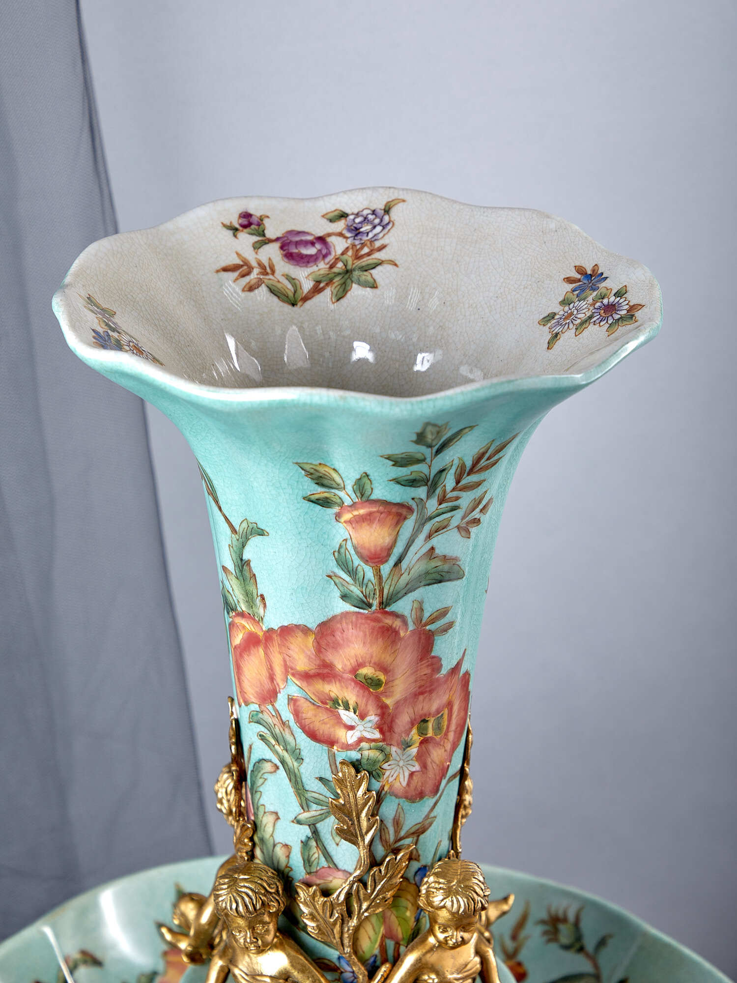 Ваза, выполненная из фарфора с бронзовыми элементами. Уникальное изделие ручной работы. При производстве этих художественных изделий из фарфора с бронзой используются вековые традиции китайских мастеров. Видимые трещинки (кракелюры) делаются по уникальной технологии, что придает более благородный вид старинного изделия.