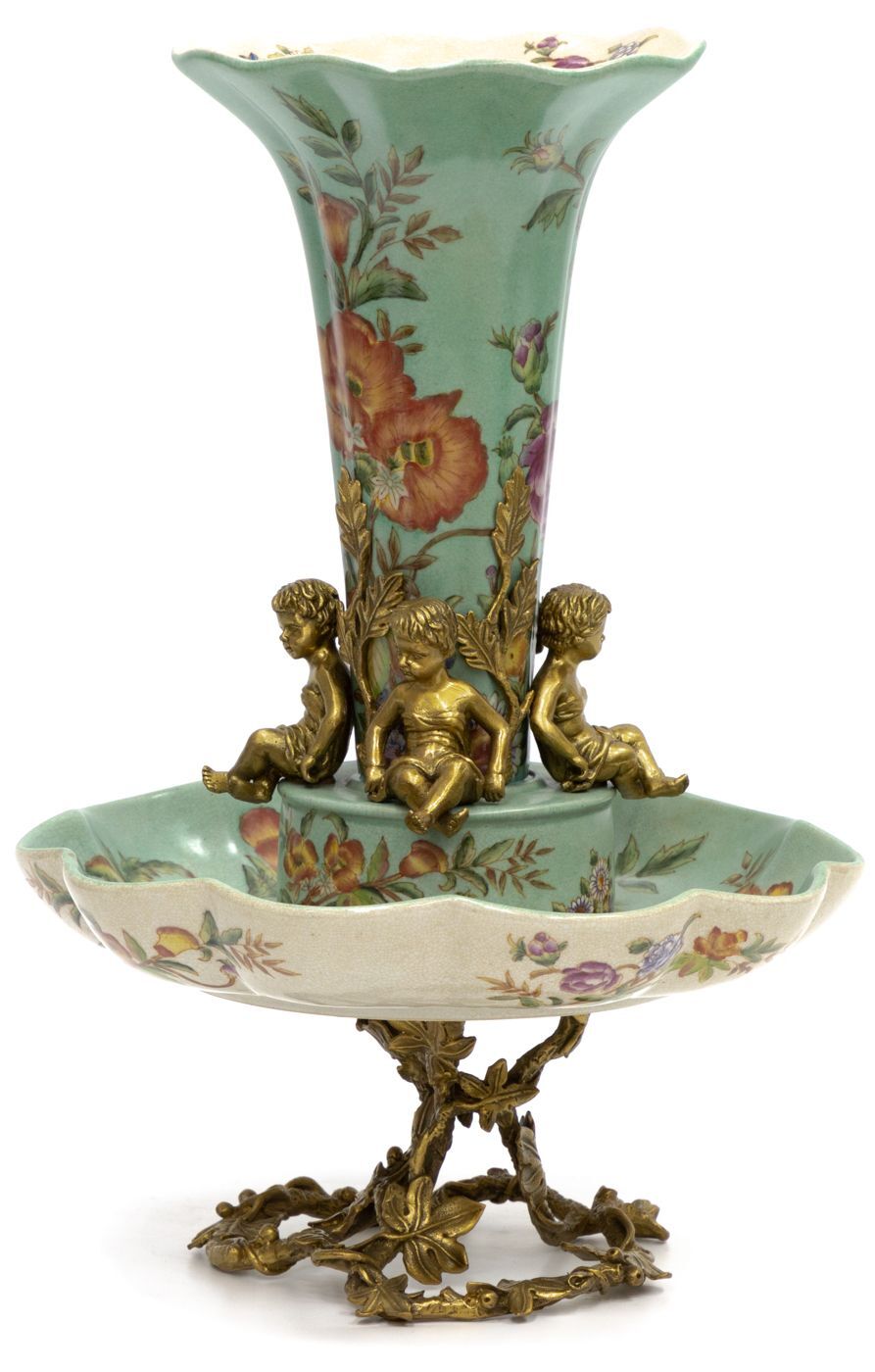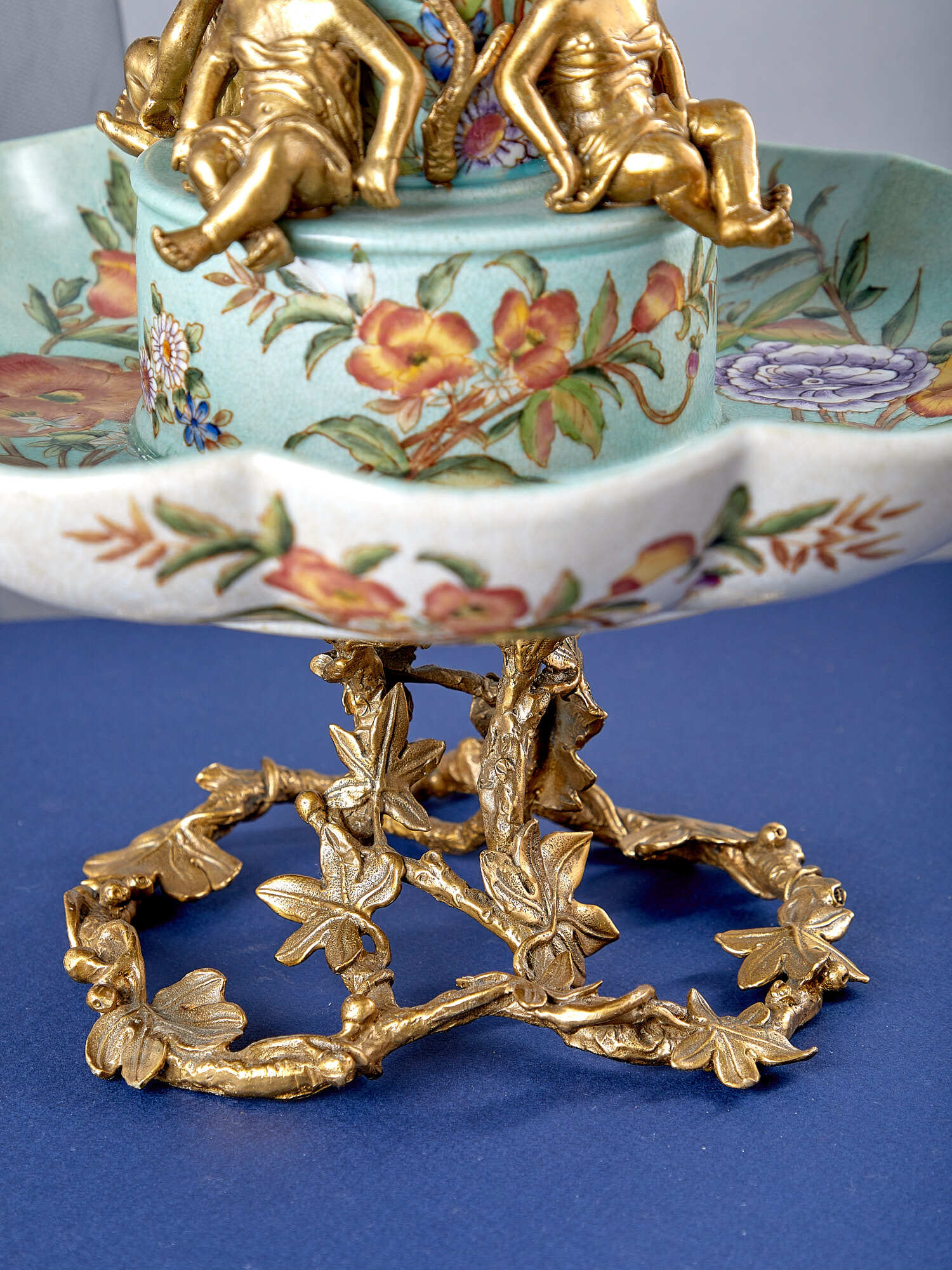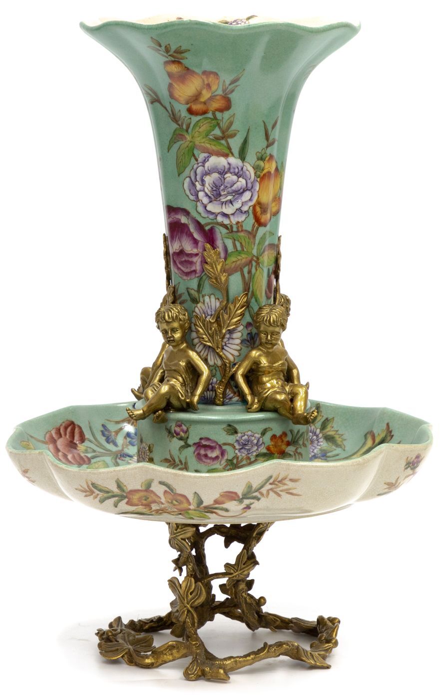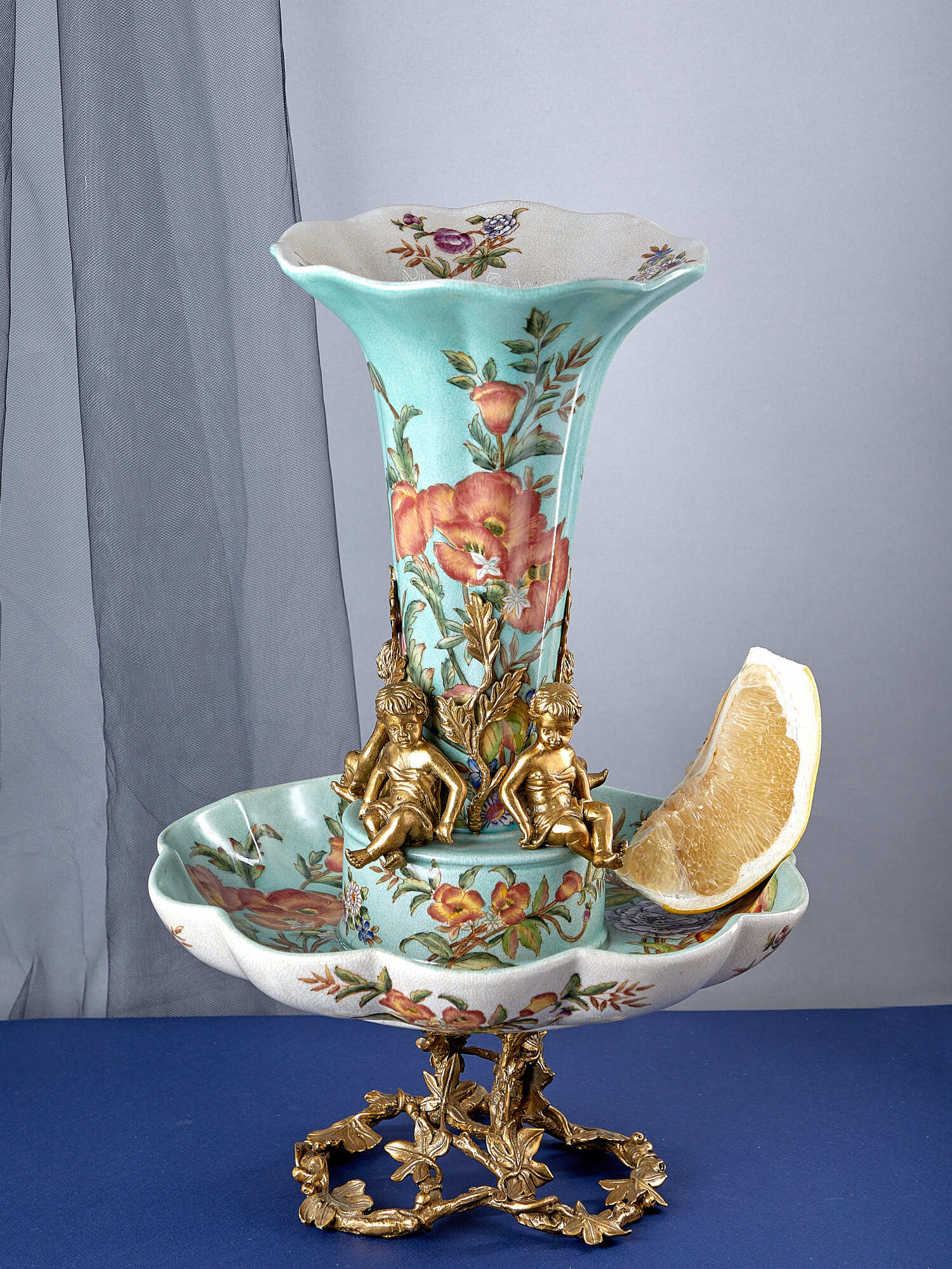 Ваза, выполненная из фарфора с бронзовыми элементами. Уникальное изделие ручной работы. При производстве этих художественных изделий из фарфора с бронзой используются вековые традиции китайских мастеров. Видимые трещинки (кракелюры) делаются по уникальной технологии, что придает более благородный вид старинного изделия.