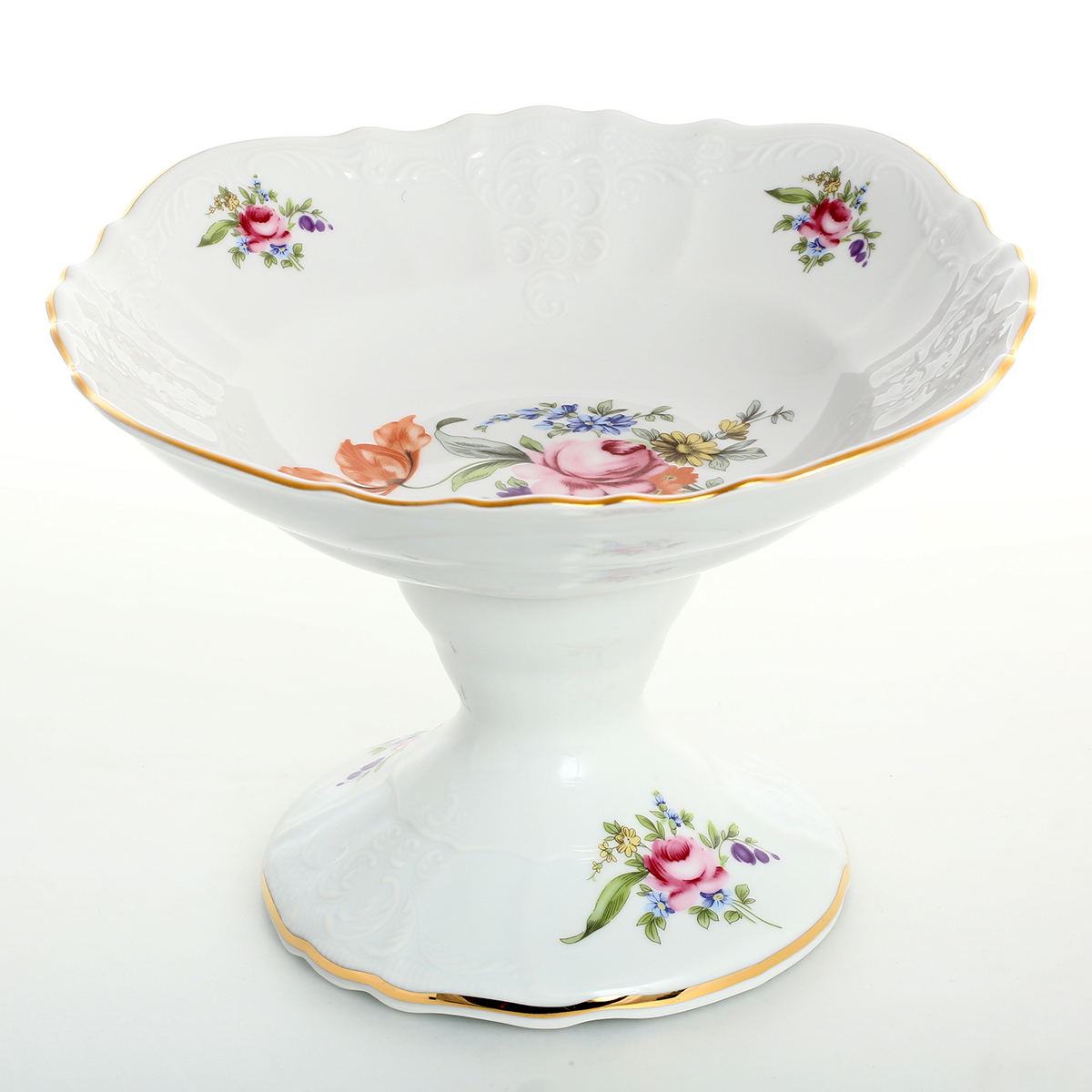 Чешский фарфор Bernadotte Полевой цветок - увидев однажды, влюбляешься навсегда! Это утверждение как нельзя лучше характеризует вазу для фруктов на изящной ножке. Декор на чаше, декор на ножке и яркий всплеск оранжевого физалиса в охапке центрального букета, распустившего свои лепестки и словно качающегося на ветру. Восхитительно и натурально!..