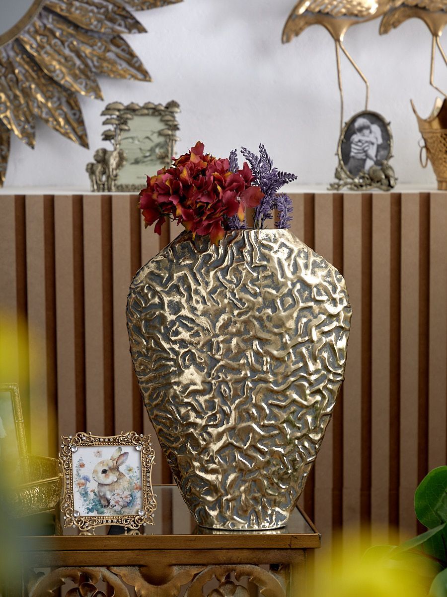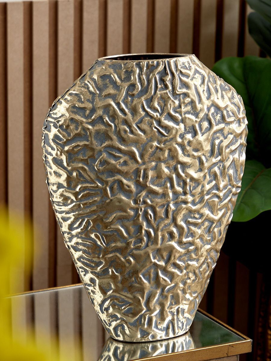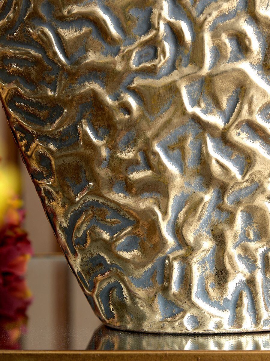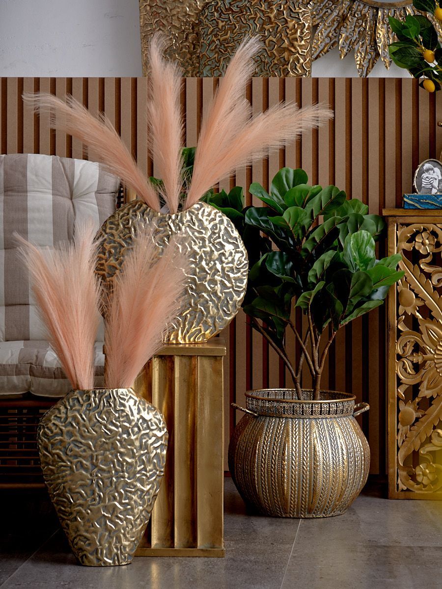 Металлическая ваза Гана, выполненная из металла в африканском стиле с широким горлышком, а также напылением золотистого оттенка с патиной, создана для сухоцветов и искусственных цветочных композиций. Благодаря лаконичности формы подходит для любого интерьера, при этом являясь идеальным подарком. Эксклюзивные формы и фактуры навеяло богатство культуры Африки, множество художественных традиций и таинственная атмосфера, окутывающая неподражаемостью. Изделие имеет признаки искусственного состаривания, поверхность декорирована с эффектом патинирования, а наличие сварочных швов подчеркивают принадлежность к ручной работе.