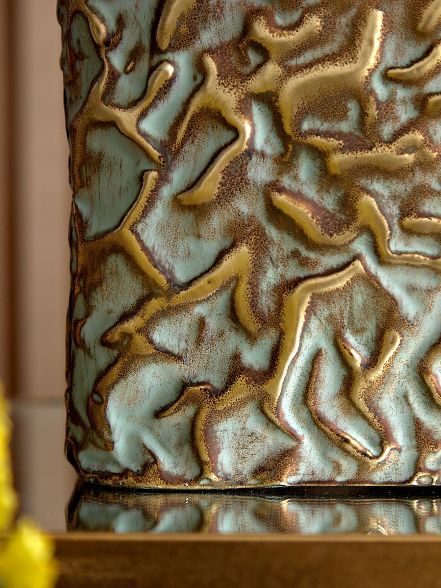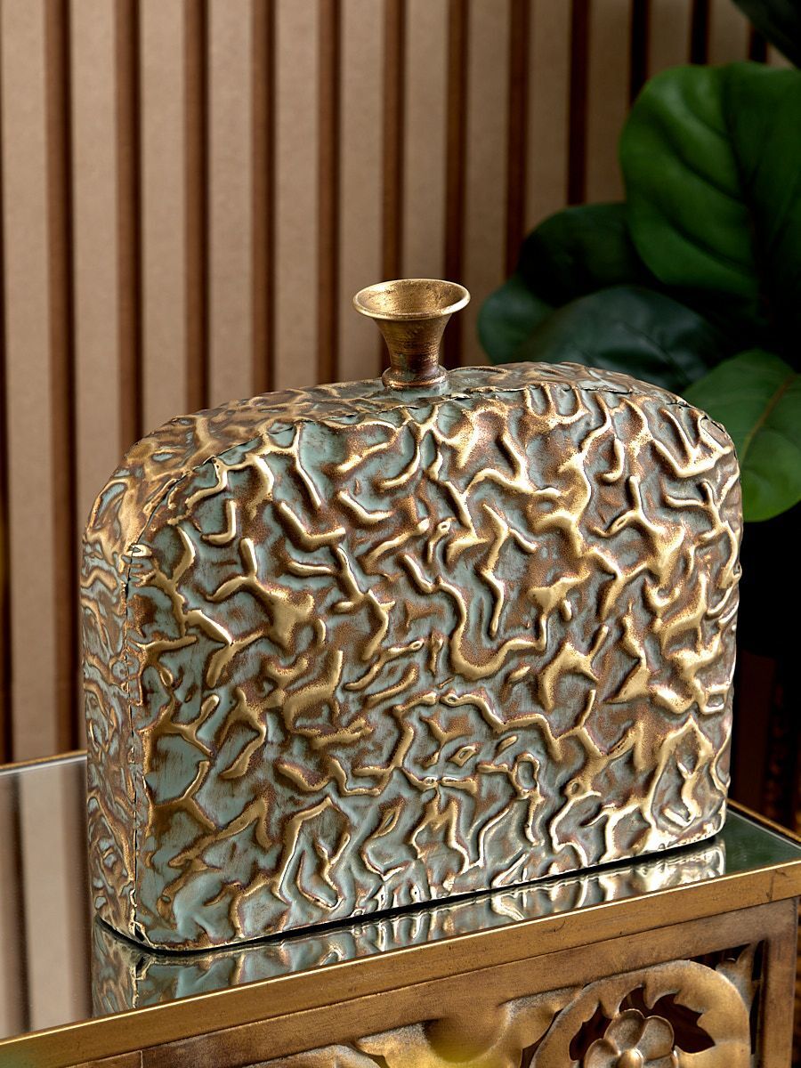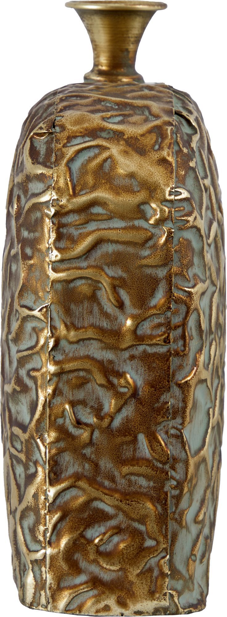 Металлическая ваза Гана, выполненная из металла в африканском стиле с узким горлышком, а также напылением золотистого оттенка с патиной, создана для размещения цветочных композиций из сухоцветов. Благодаря лаконичности формы подходит для любого интерьера, при этом являясь идеальным подарком. Эксклюзивные формы и фактуры навеяло богатство культуры Африки, множество художественных традиций и таинственная атмосфера, окутывающая неподражаемостью. Изделие имеет признаки искусственного состаривания, поверхность декорирована с эффектом патинирования, а наличие сварочных швов подчеркивают принадлежность к ручной работе.