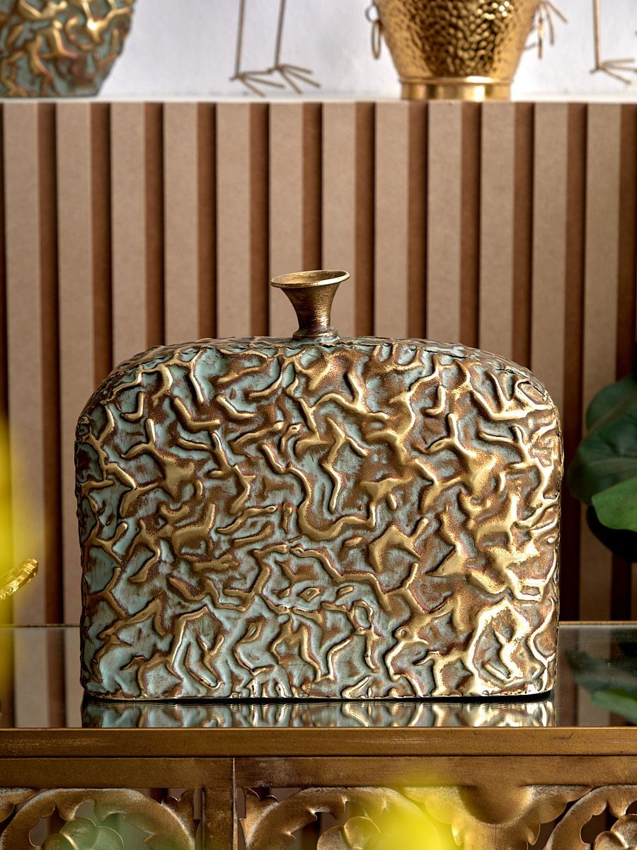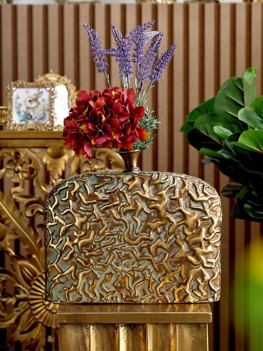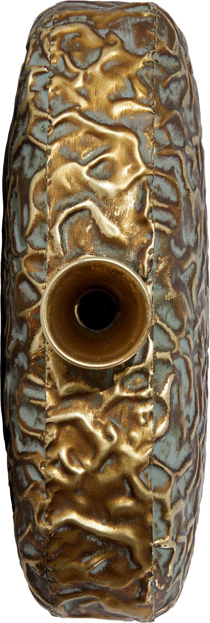 Металлическая ваза Гана, выполненная из металла в африканском стиле с узким горлышком, а также напылением золотистого оттенка с патиной, создана для размещения цветочных композиций из сухоцветов. Благодаря лаконичности формы подходит для любого интерьера, при этом являясь идеальным подарком. Эксклюзивные формы и фактуры навеяло богатство культуры Африки, множество художественных традиций и таинственная атмосфера, окутывающая неподражаемостью. Изделие имеет признаки искусственного состаривания, поверхность декорирована с эффектом патинирования, а наличие сварочных швов подчеркивают принадлежность к ручной работе.