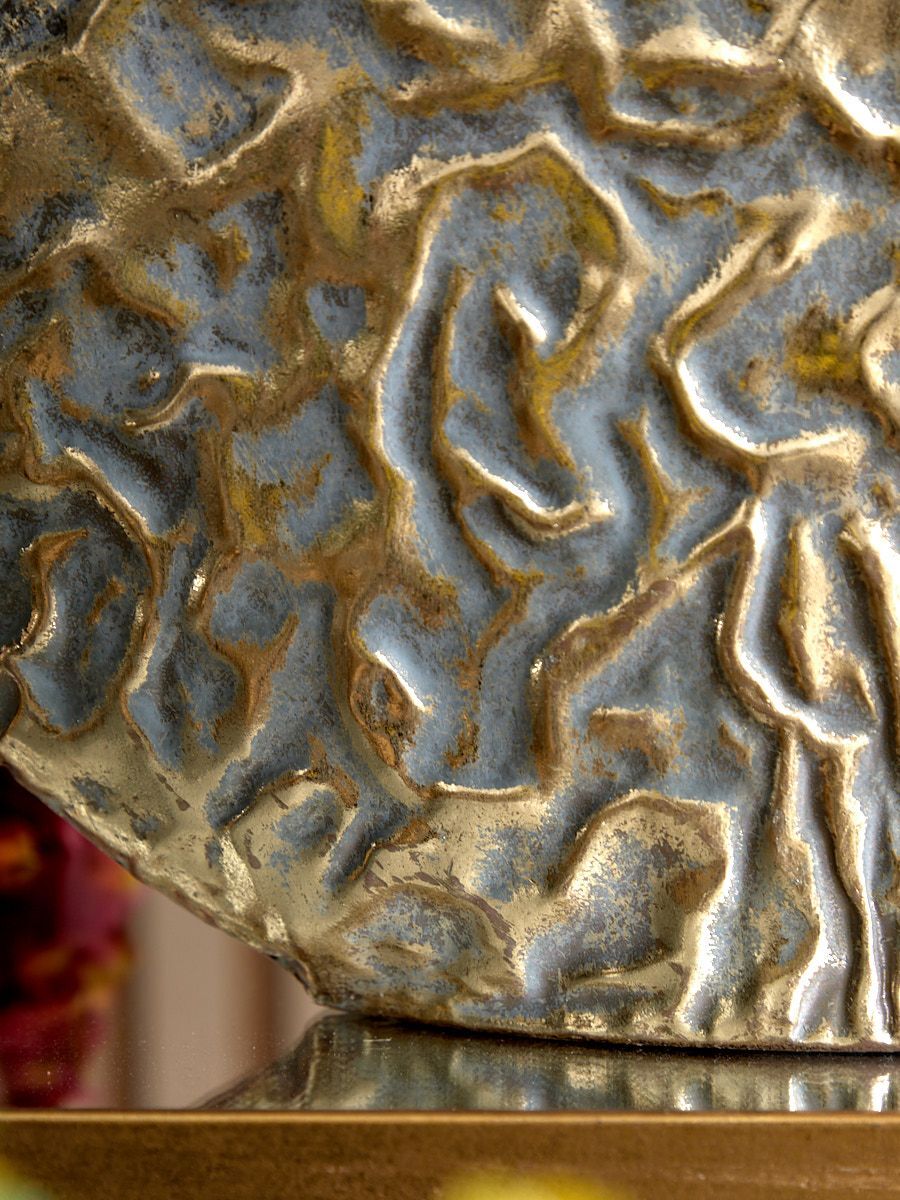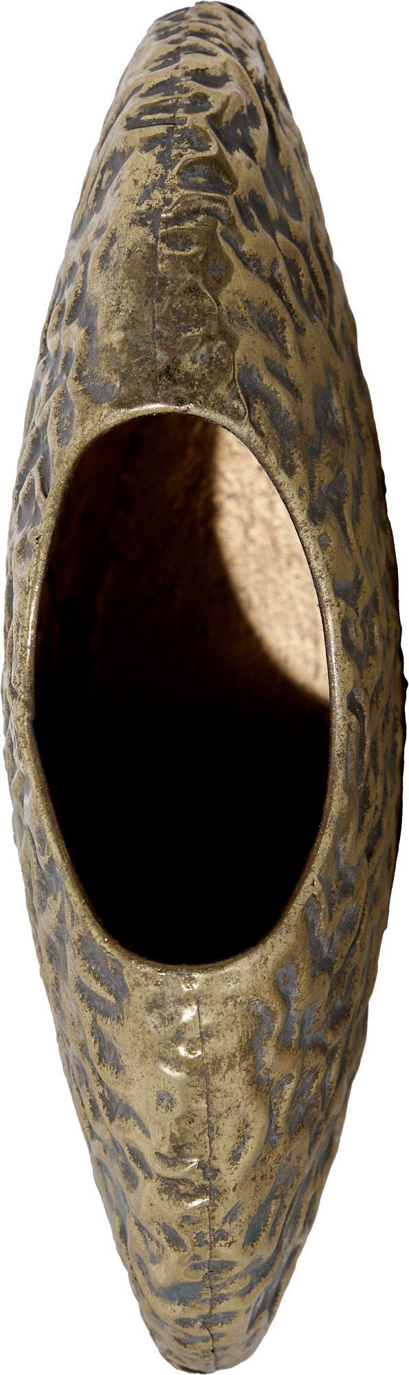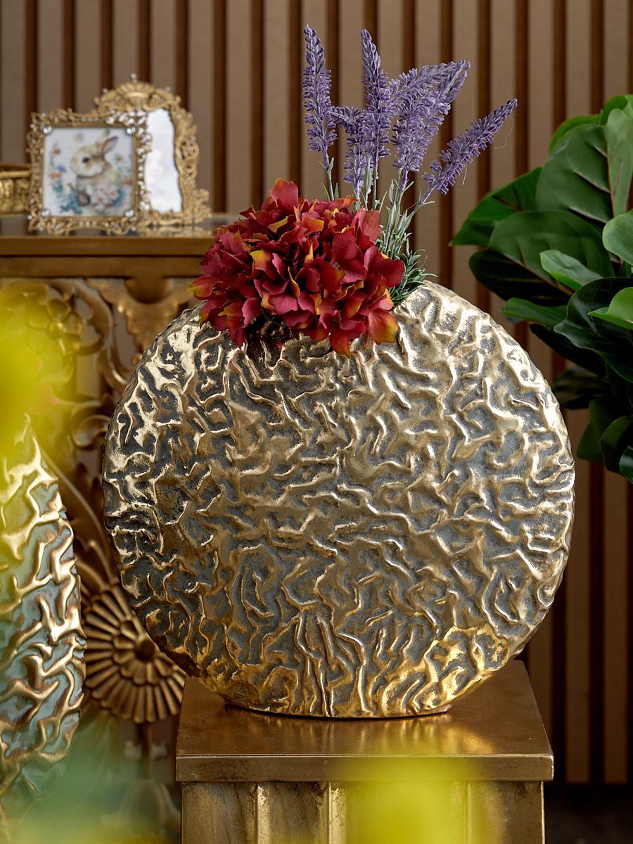 Металлическая ваза Гана, выполненная из металла в африканском стиле с широким горлышком, а также напылением золотистого оттенка с патиной, создана для сухоцветов и искусственных цветочных композиций. Благодаря лаконичности формы подходит для любого интерьера, при этом являясь идеальным подарком. Эксклюзивные формы и фактуры навеяло богатство культуры Африки, множество художественных традиций и таинственная атмосфера, окутывающая неподражаемостью. Изделие имеет признаки искусственного состаривания, поверхность декорирована с эффектом патинирования, а наличие сварочных швов подчеркивают принадлежность к ручной работе.
