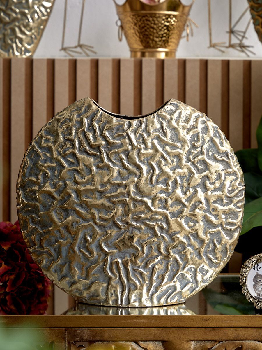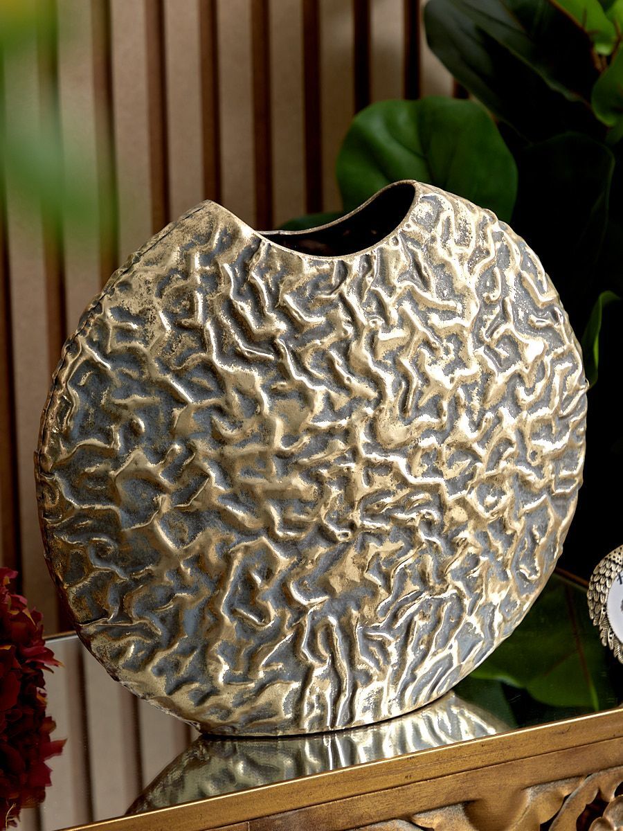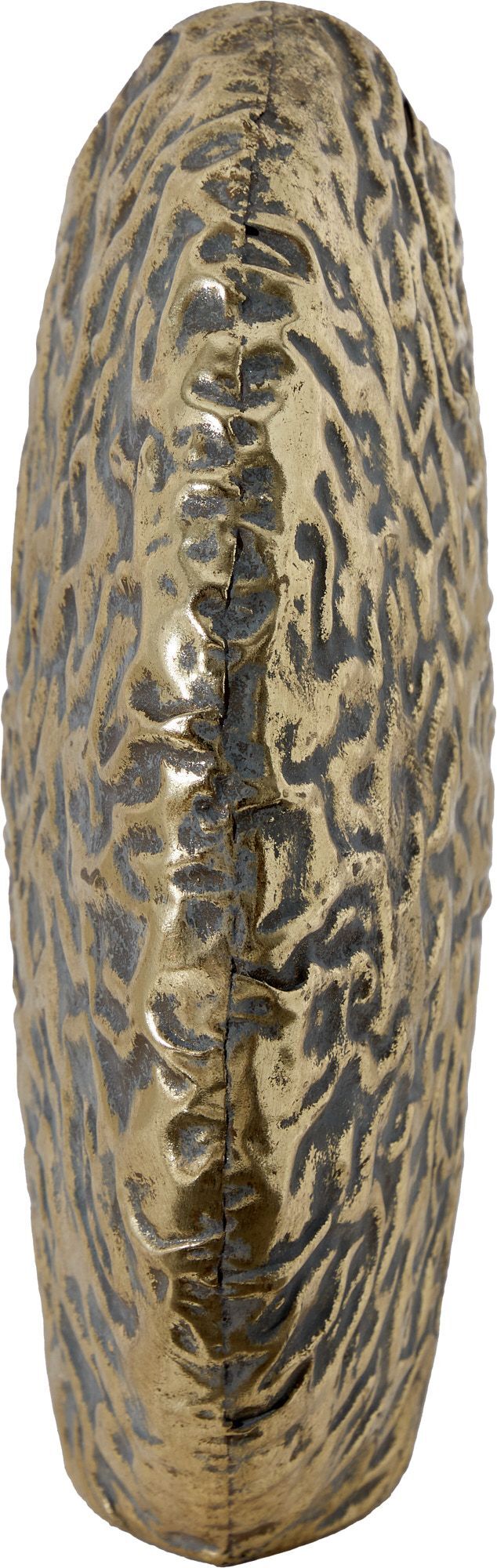 Металлическая ваза Гана, выполненная из металла в африканском стиле с широким горлышком, а также напылением золотистого оттенка с патиной, создана для сухоцветов и искусственных цветочных композиций. Благодаря лаконичности формы подходит для любого интерьера, при этом являясь идеальным подарком. Эксклюзивные формы и фактуры навеяло богатство культуры Африки, множество художественных традиций и таинственная атмосфера, окутывающая неподражаемостью. Изделие имеет признаки искусственного состаривания, поверхность декорирована с эффектом патинирования, а наличие сварочных швов подчеркивают принадлежность к ручной работе.