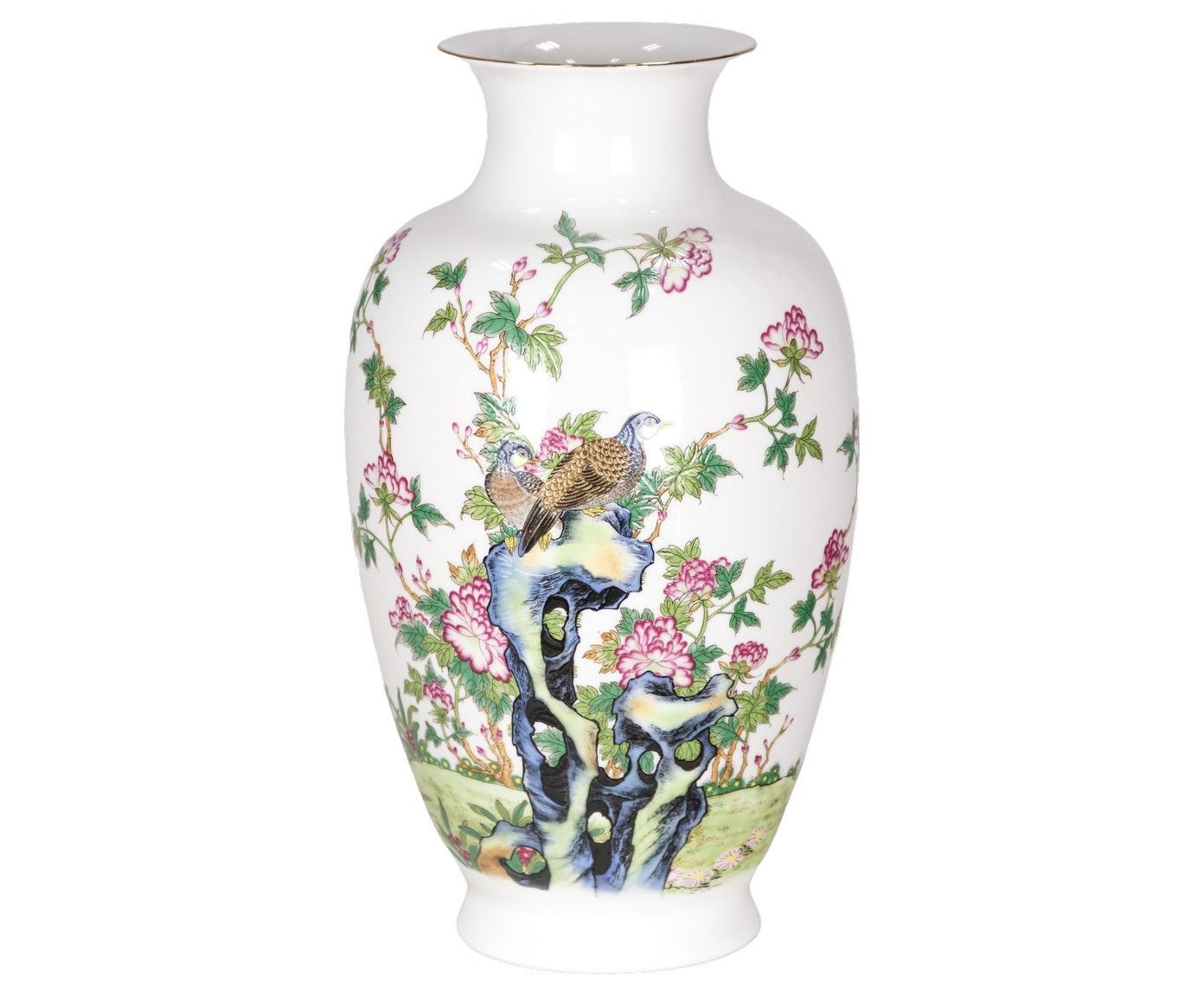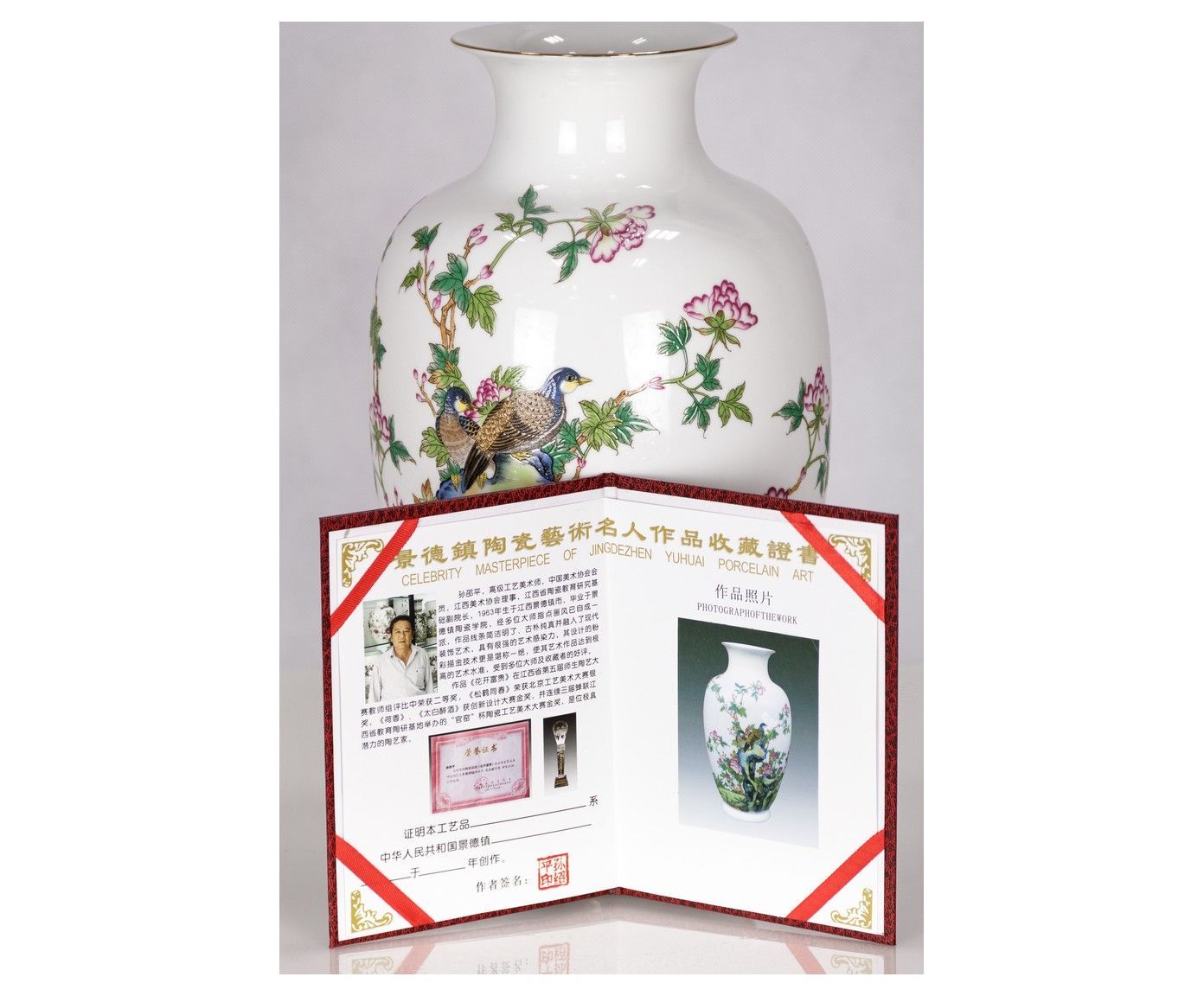 Фарфоровая ваза с ярким цветочным орнаментом. В комплекте паспорт с описанием вазы на китайском языке и фотографией вазы и художника, расписавшего её.