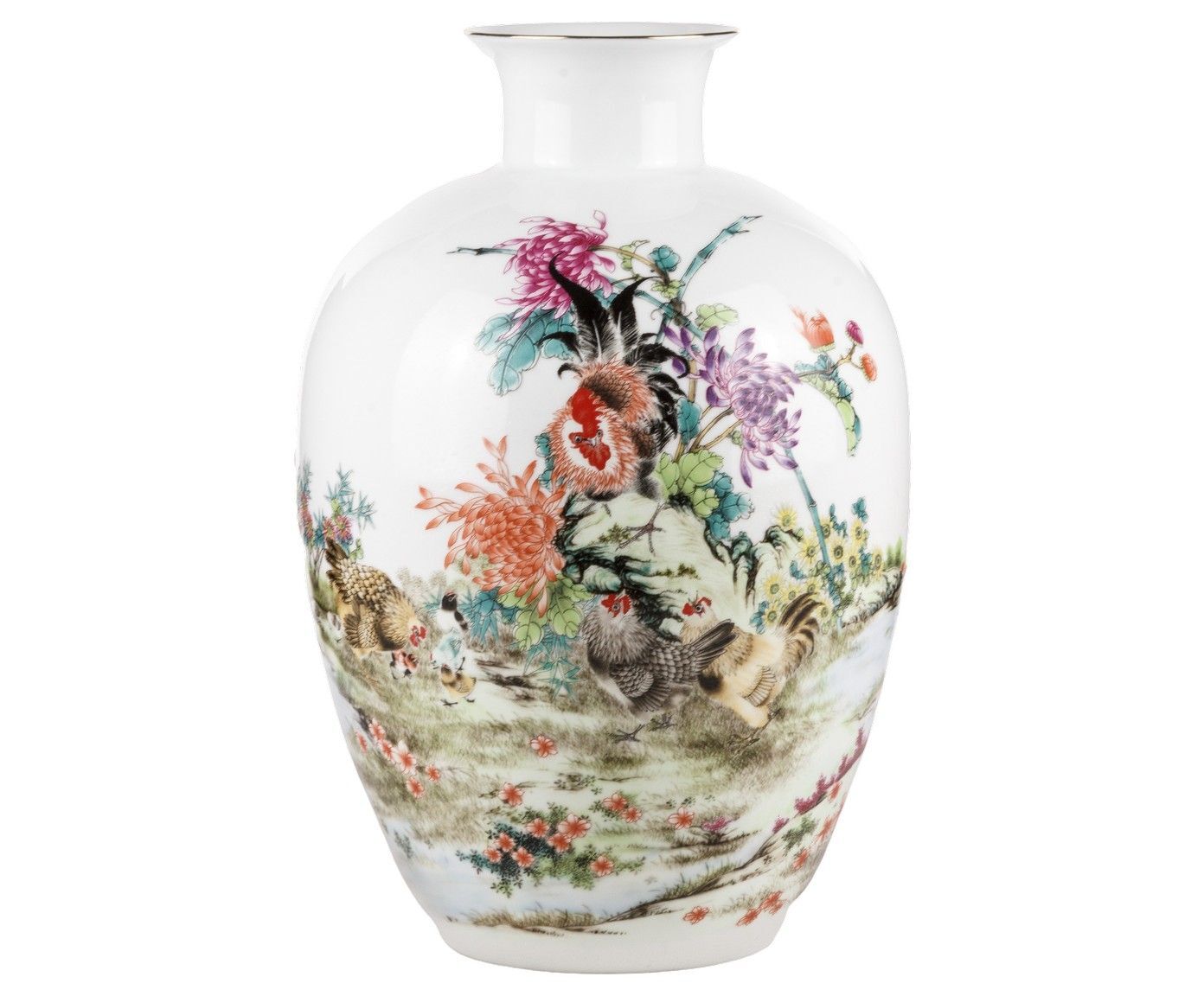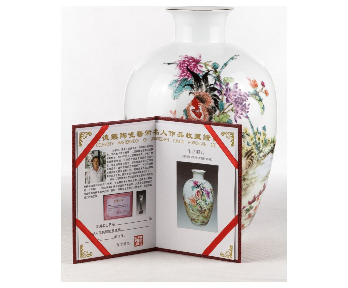 Фарфоровая ваза с ярким цветочным орнаментом. В комплекте паспорт с описанием вазы на китайском языке и фотографией вазы и художника, расписавшего её.