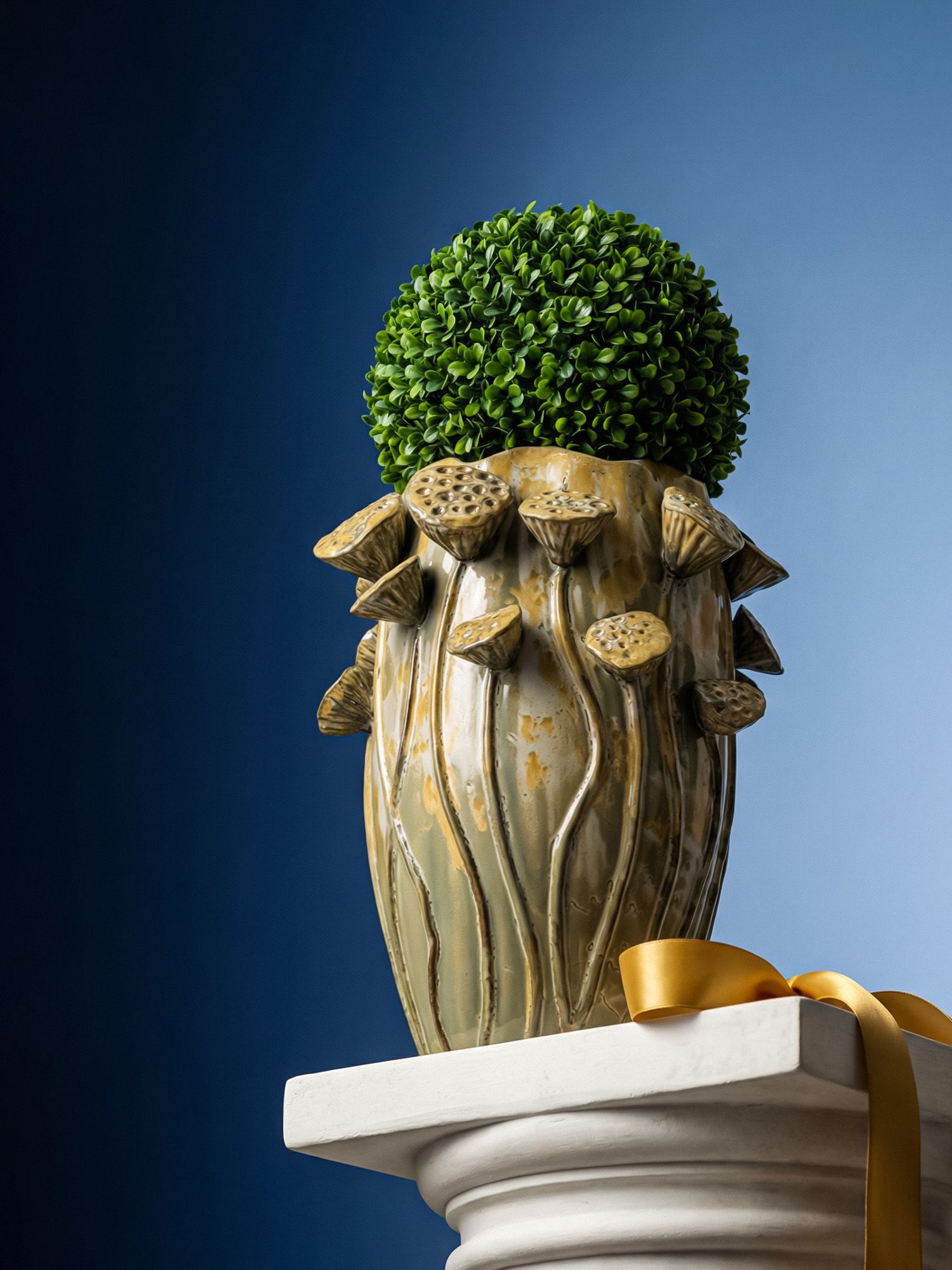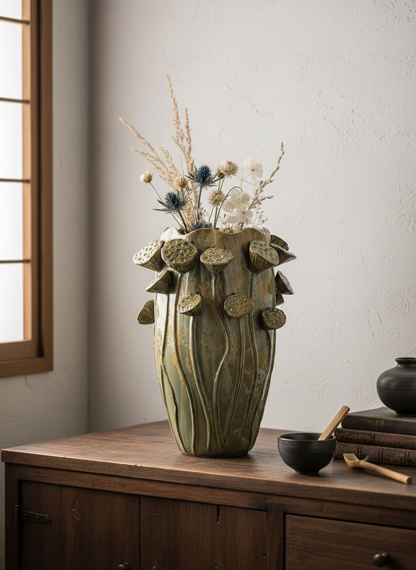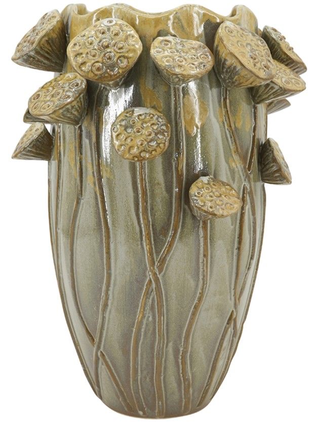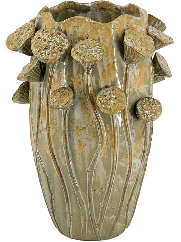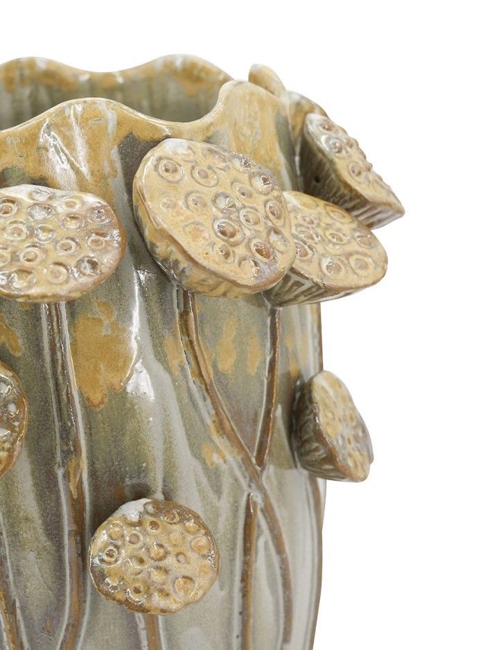 Декоративная ваза с классическим силуэтом в винтажном стиле и очаровательной отделкой на корпусе в виде семенных бутонов лотосов, привнесет вневременную изысканность в ваш домашний декор. Семена лотоса символизируют плодоносную силу творения, духовное пробуждение и чистоту. Поставьте вазу как отдельный элемент декора, или в коллекции с другими изделиями, эта ваза прекрасна в любом интерьере.