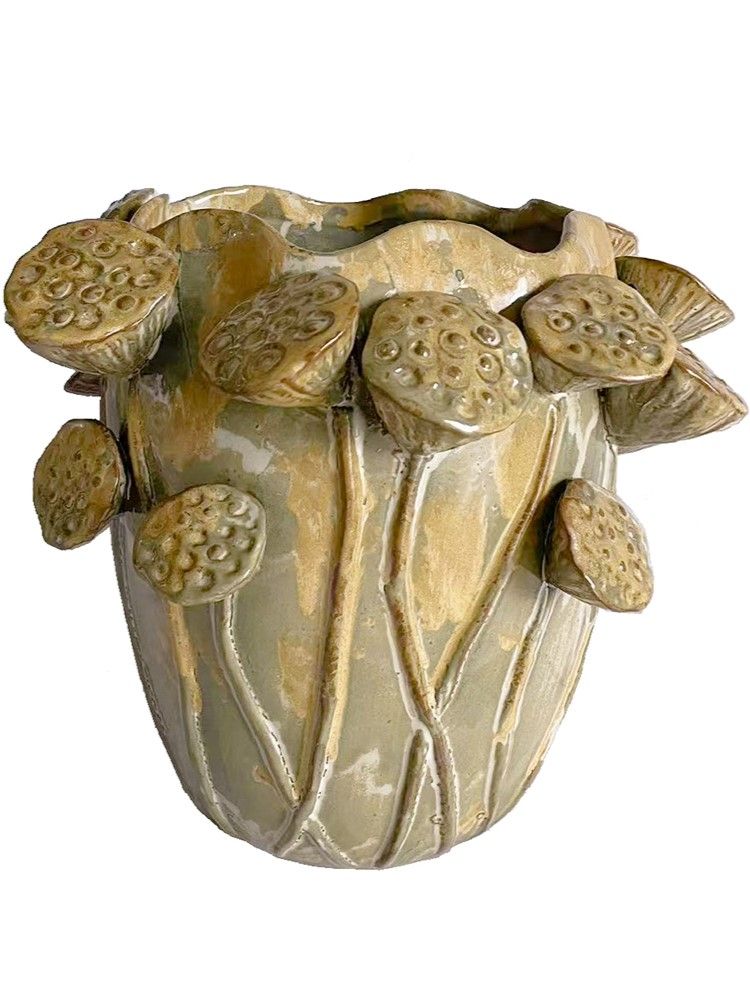 Декоративная ваза с классическим силуэтом в винтажном стиле и очаровательной отделкой на корпусе в виде семенных бутонов лотосов, привнесет вневременную изысканность в ваш домашний декор. Семена лотоса символизируют плодоносную силу творения, духовное пробуждение и чистоту. Поставьте вазу как отдельный элемент декора, или в коллекции с другими изделиями, эта ваза прекрасна в любом интерьере.
