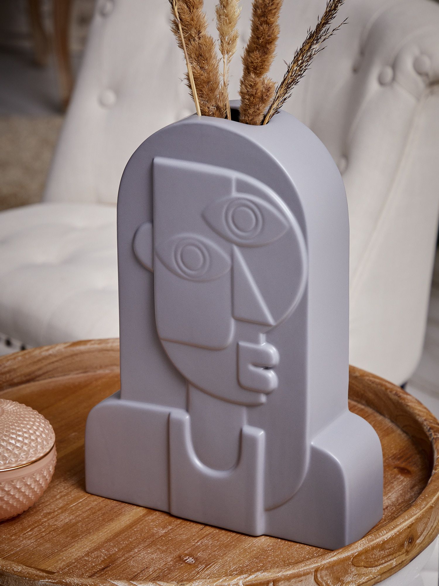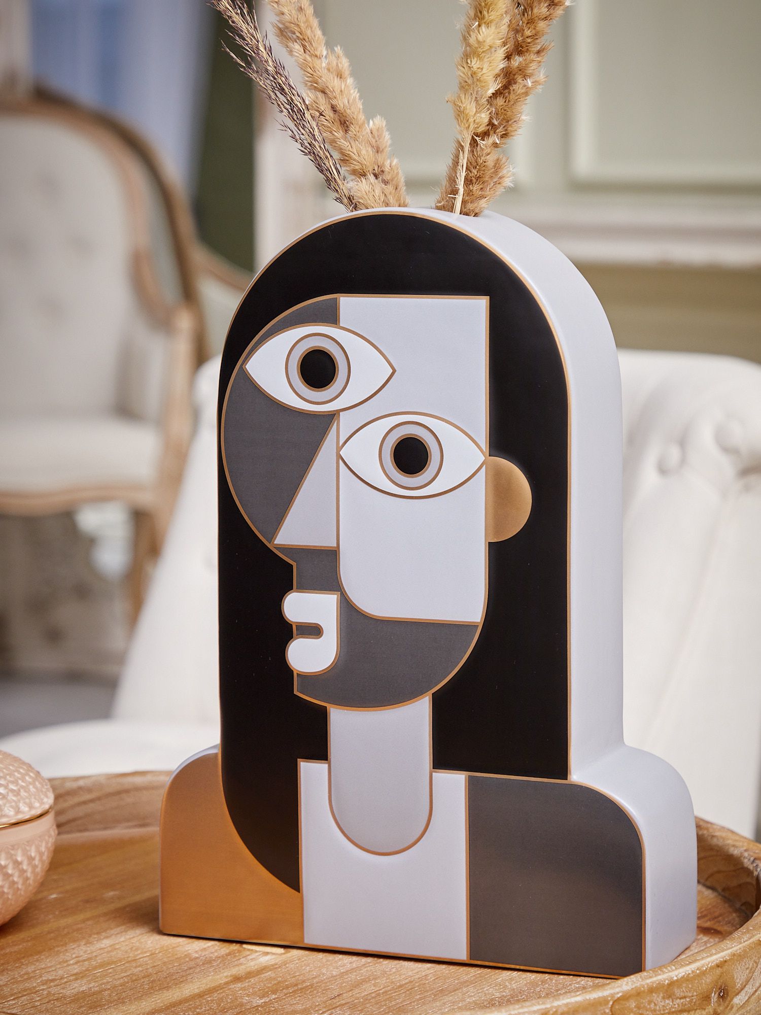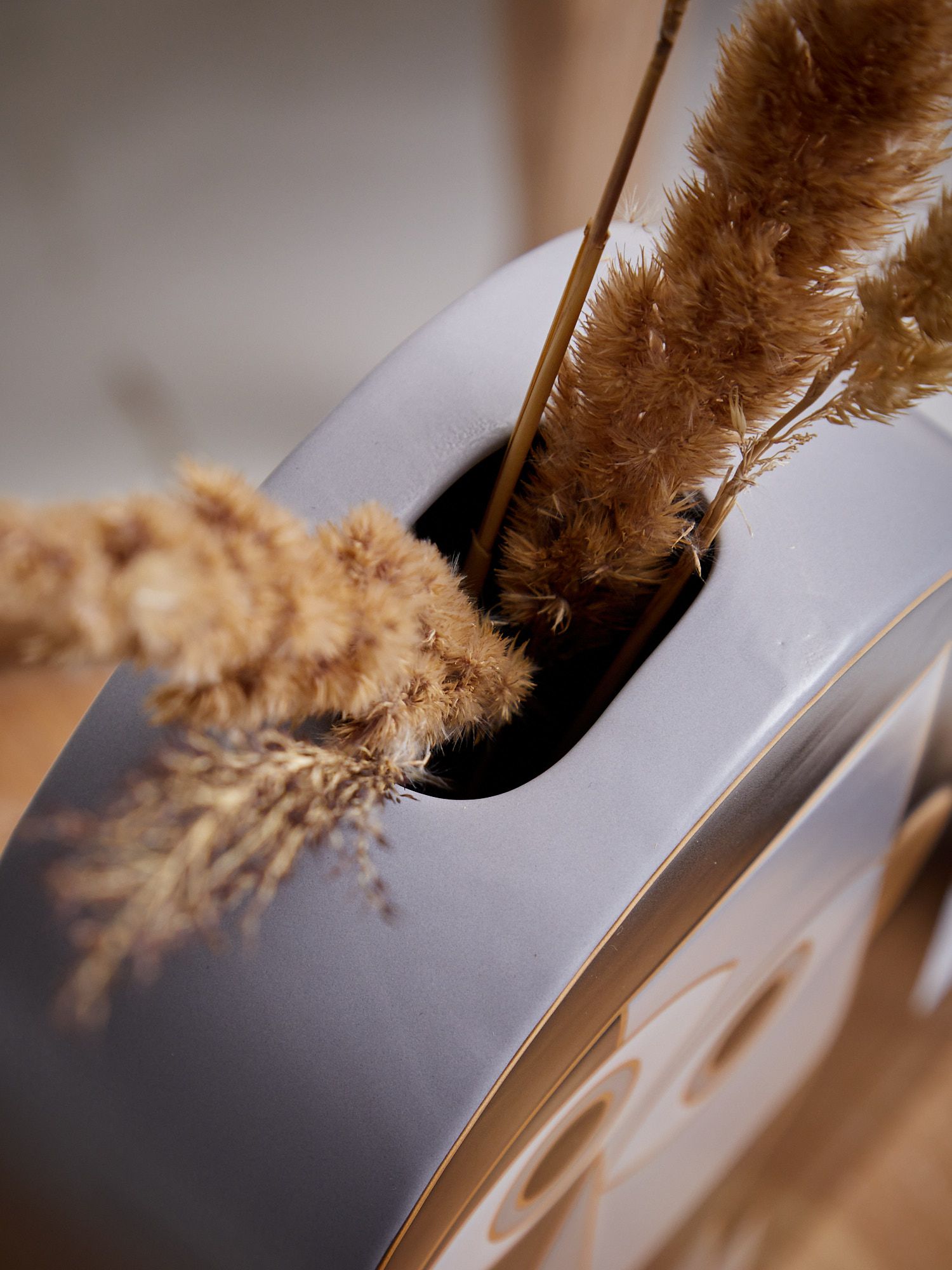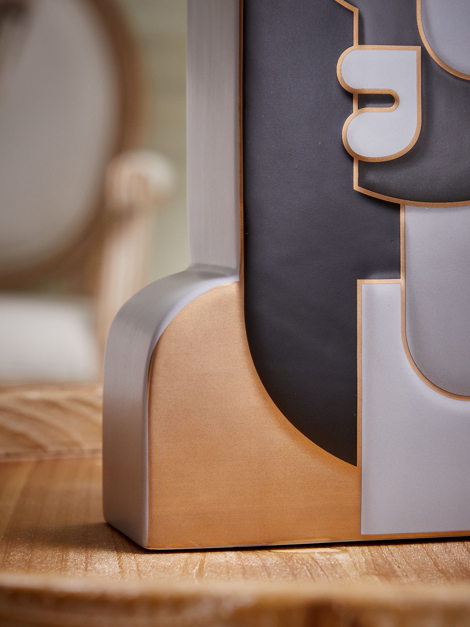 Керамическая ваза с серым фигурным корпусом демонстрирует стиль авангардной живописи, матовая поверхность которой подчеркнута золотистым контуром. Изделие создаст особенный штрих в интерьере и воплотит изысканные дизайнерские мечты. Поставьте ее как отдельный элемент декора, или наполните цветочной композицией, эта ваза впишется в любой интерьер.