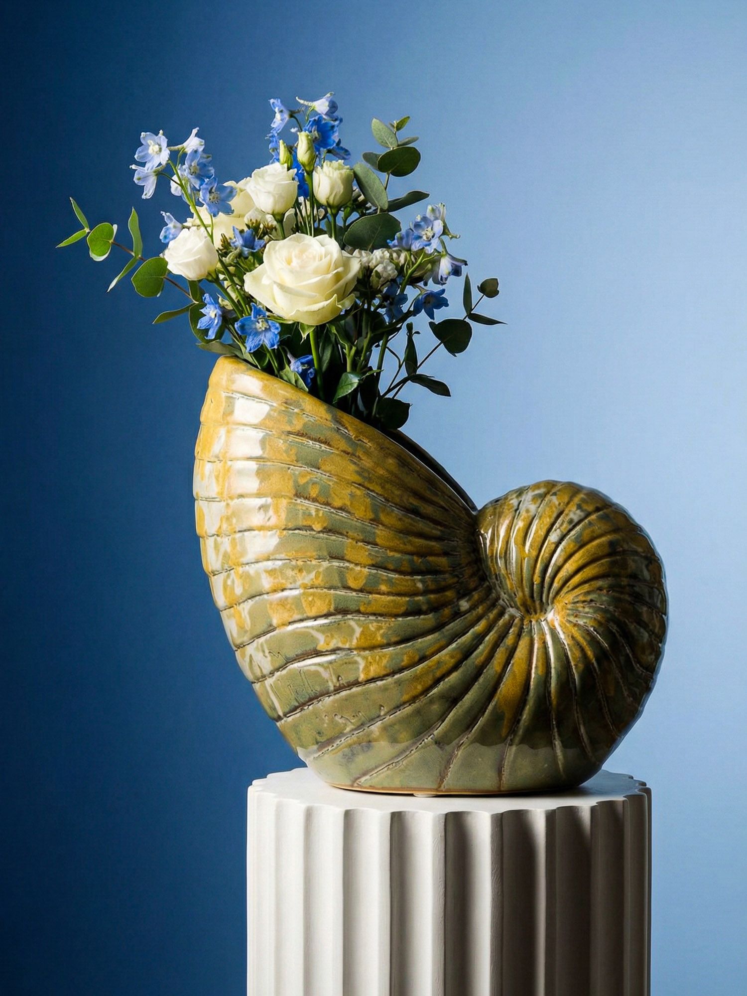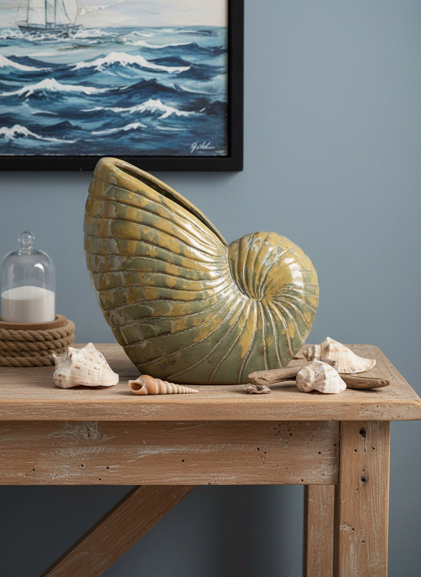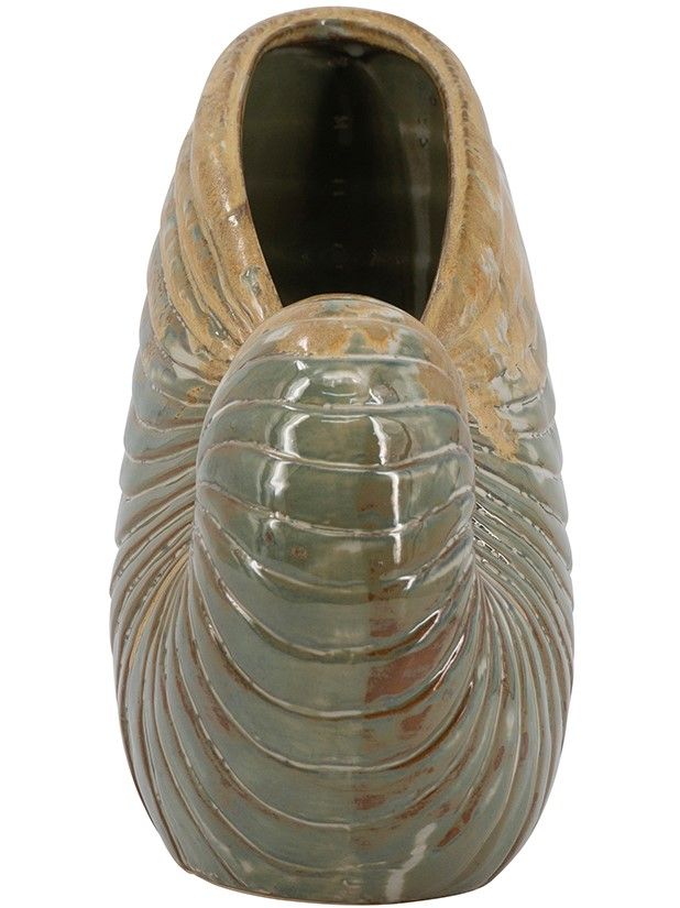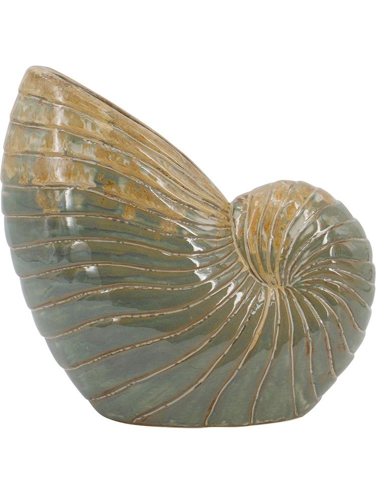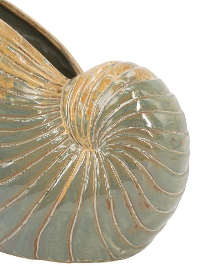 Декоративная ваза продемонстрирует детализированный дизайн раковины Наутилус с серо-зеленой и коричневой отделкой. Независимо от того, выставляется ли изделие отдельно или в паре с суккулентами, травами или вьющимися растениями, изделие наполнит любую комнату в вашем доме безмятежной морской энергией.