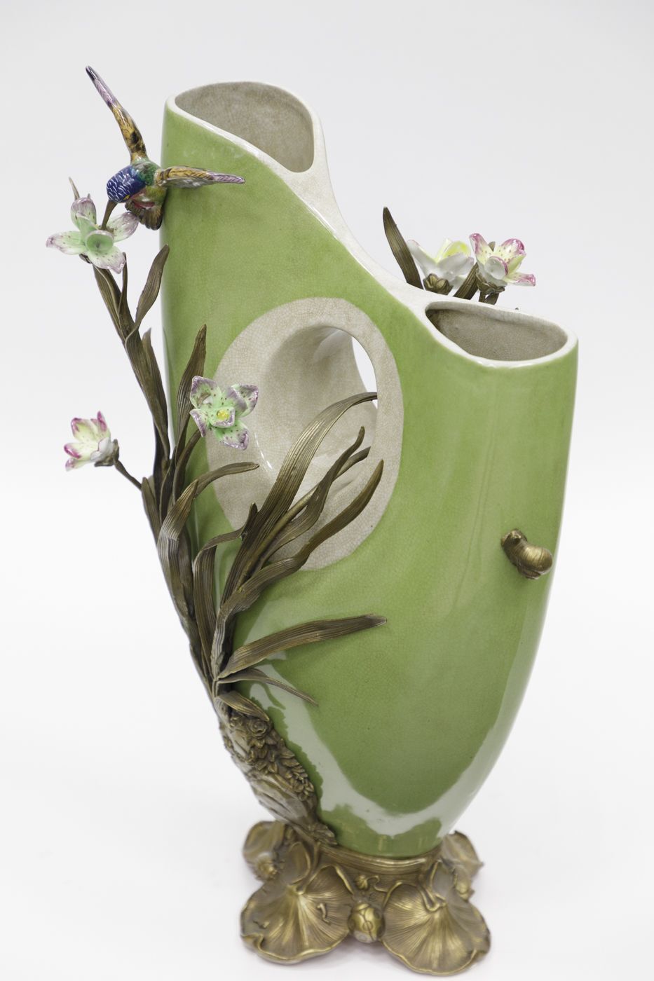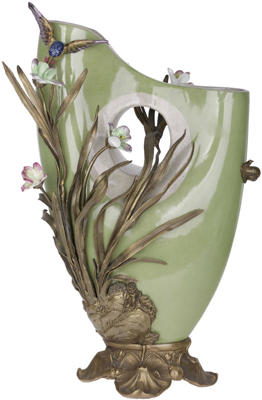 Ваза с колибри, выполненная из фарфора с бронзовыми элементами. Уникальное изделие ручной работы. При производстве этих художественных изделий из фарфора с бронзой используются вековые традиции китайских мастеров. Видимые трещинки (кракелюры) делаются по уникальной технологии, что придает более благородный вид старинного изделия.