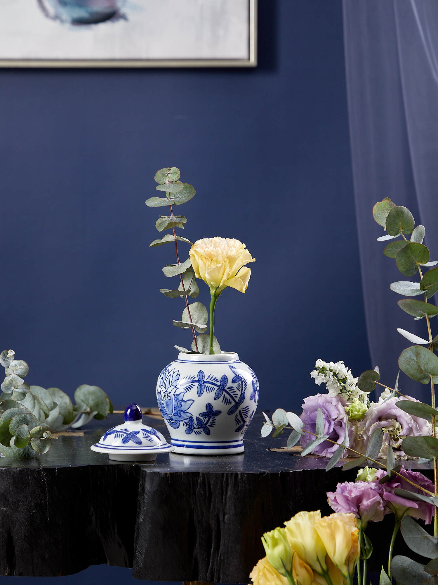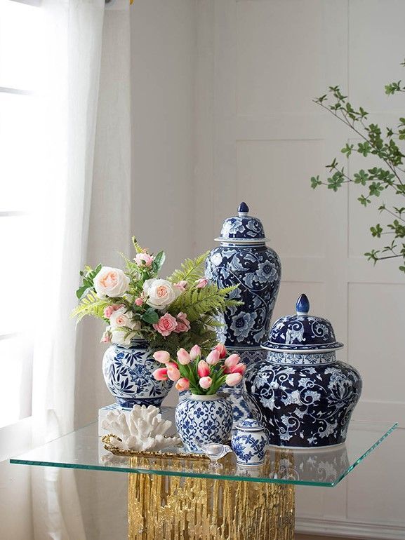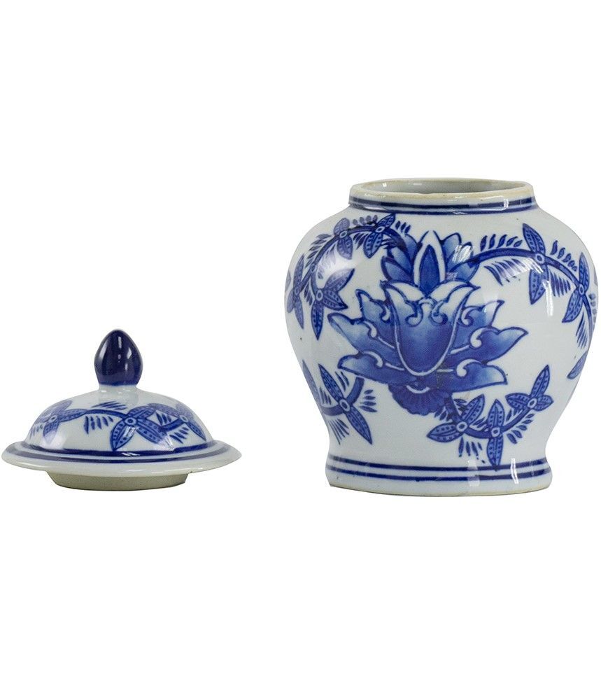Круглая ваза имеет синий цветочный орнамент на белом фарфоровом фоне. Эта комбинация цветовой гаммы создает классический образ, который прекрасно сочетается в любом интерьере.