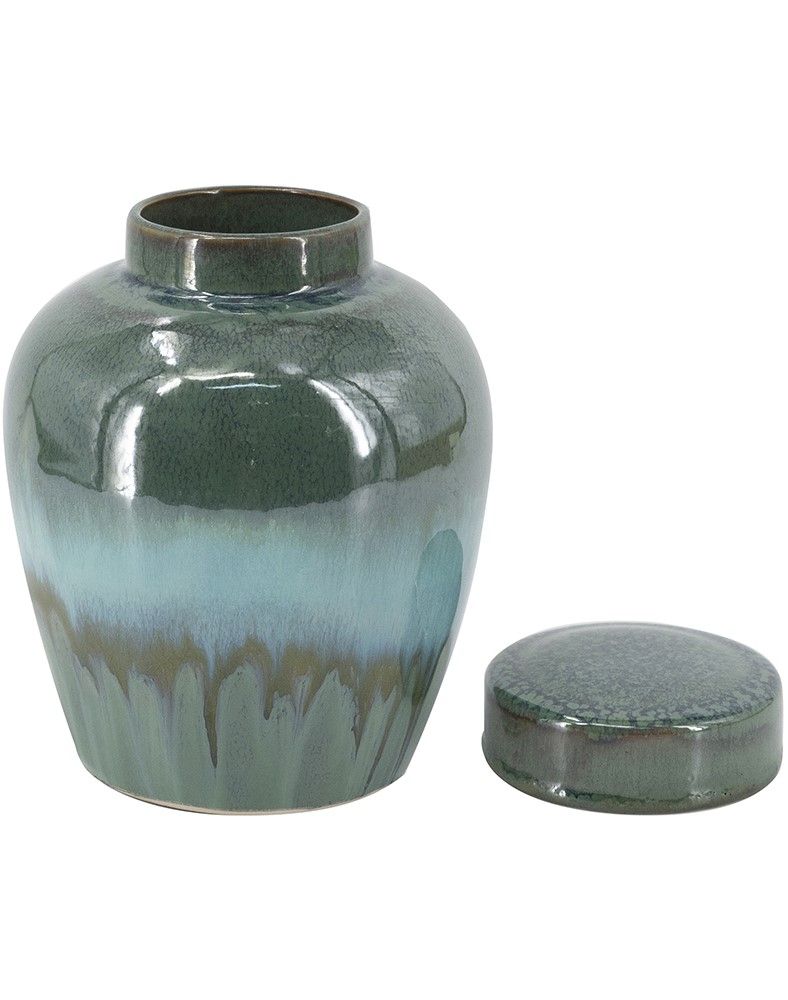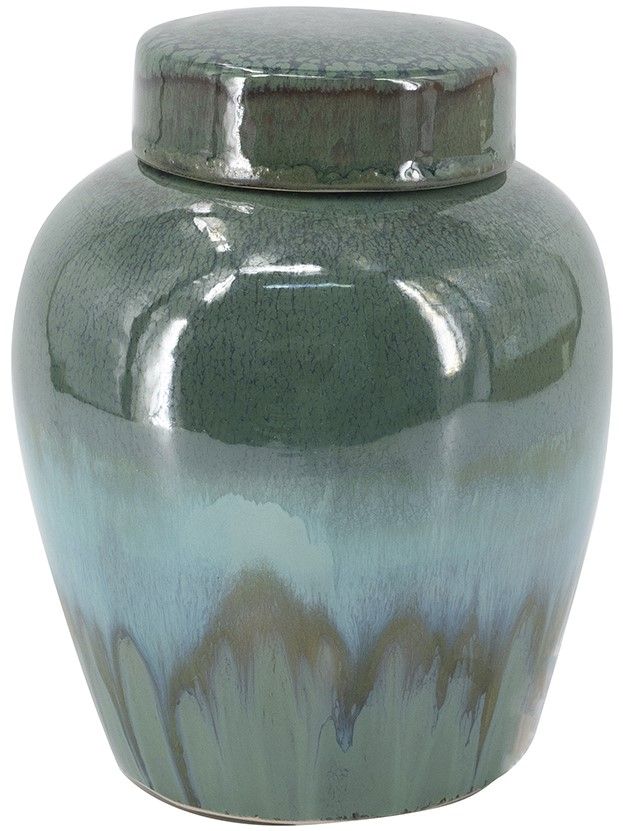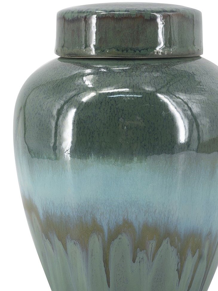Декоративная ваза с крышкой, покрытая многомерной глазурью с плавным переходом, имеет округлый силуэт, едва заметную ребристую текстуру и глянцевый блеск, переливающийся оттенками синего и зеленого. Ваза прекрасна в сочетании с длинными ветками или искусственными цветами, а также станет ярким акцентом на любой поверхности стола, каминной полки или комоде. Цветовая палитра и форма, выполненная вручную, позволяют этой вазе гармонично сочетаться с переходными, прибрежными, современными и эклектичными стилями, органично вписываясь в любой интерьер.