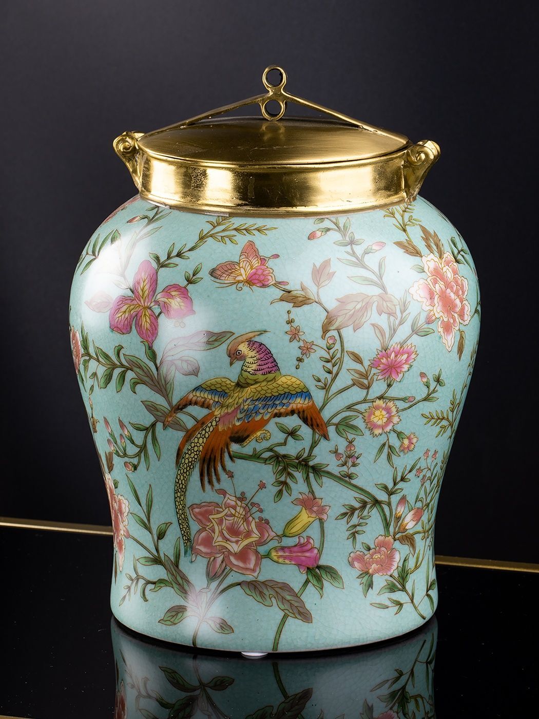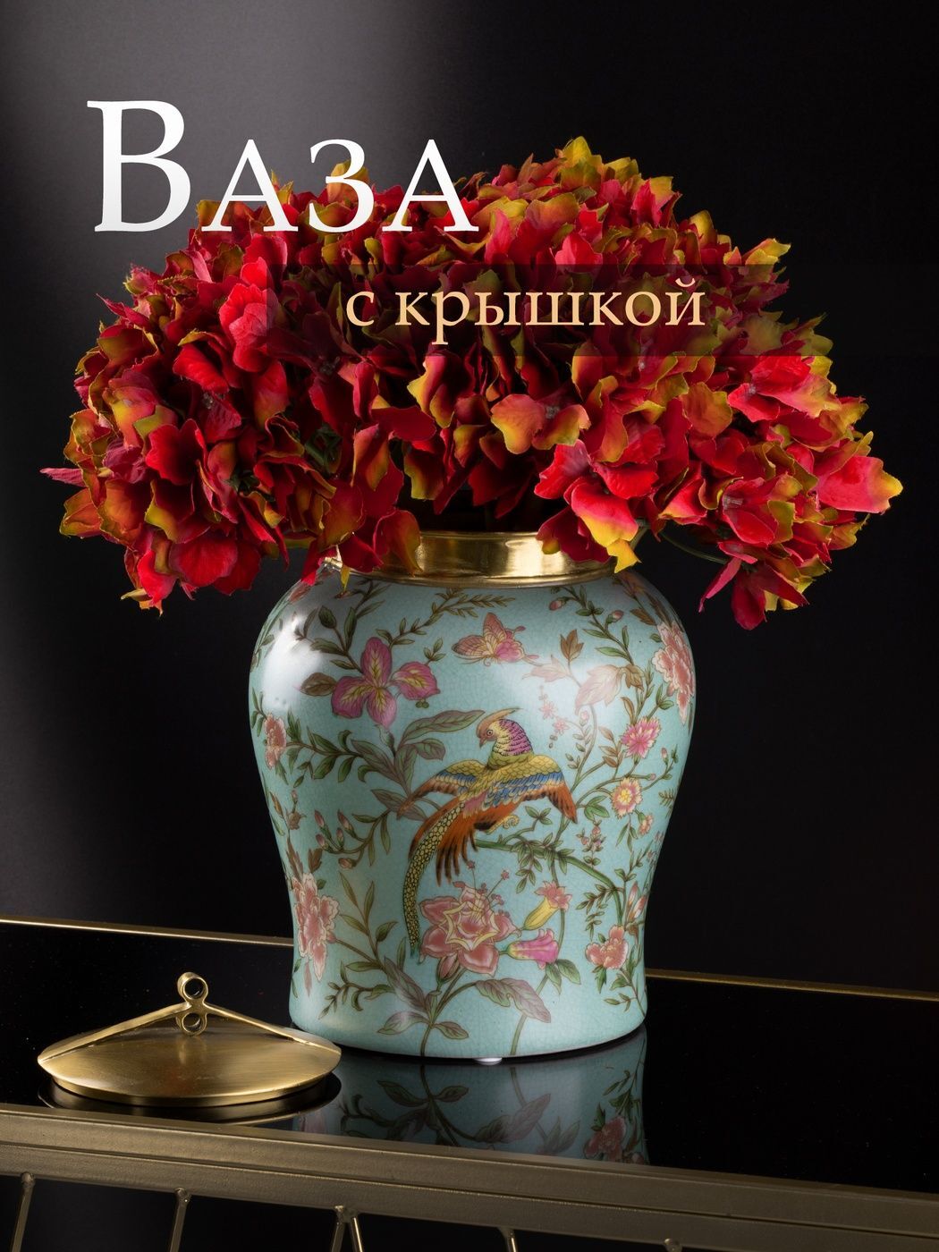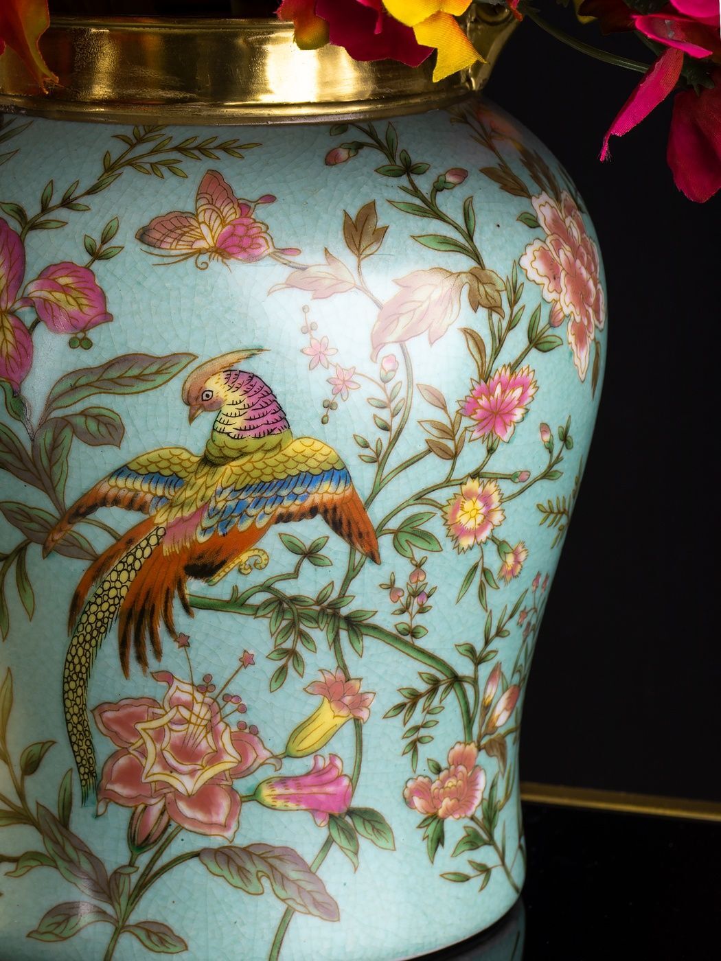Ваза с крышкой, выполненная из фарфора с бронзовыми элементами. Уникальное изделие ручной работы. При производстве этих художественных изделий из фарфора с бронзой используются вековые традиции китайских мастеров. Видимые трещинки (кракелюры) делаются по уникальной технологии, что придает более благородный вид старинного изделия.
