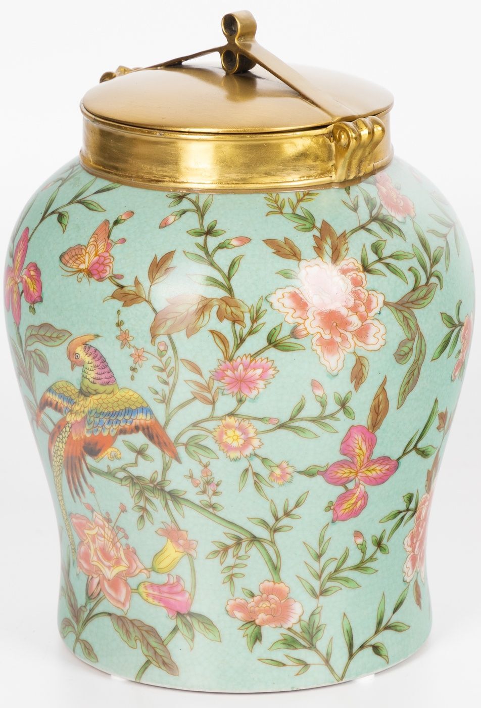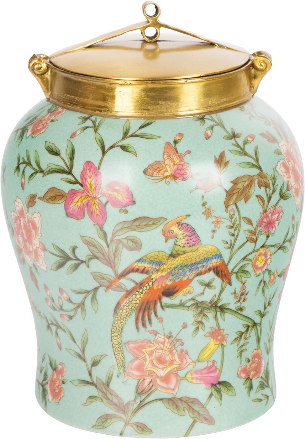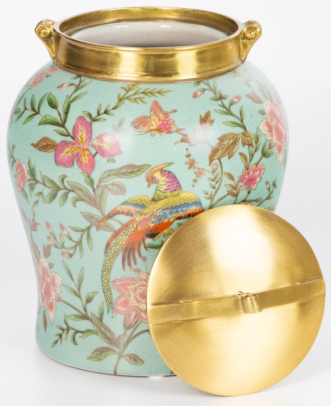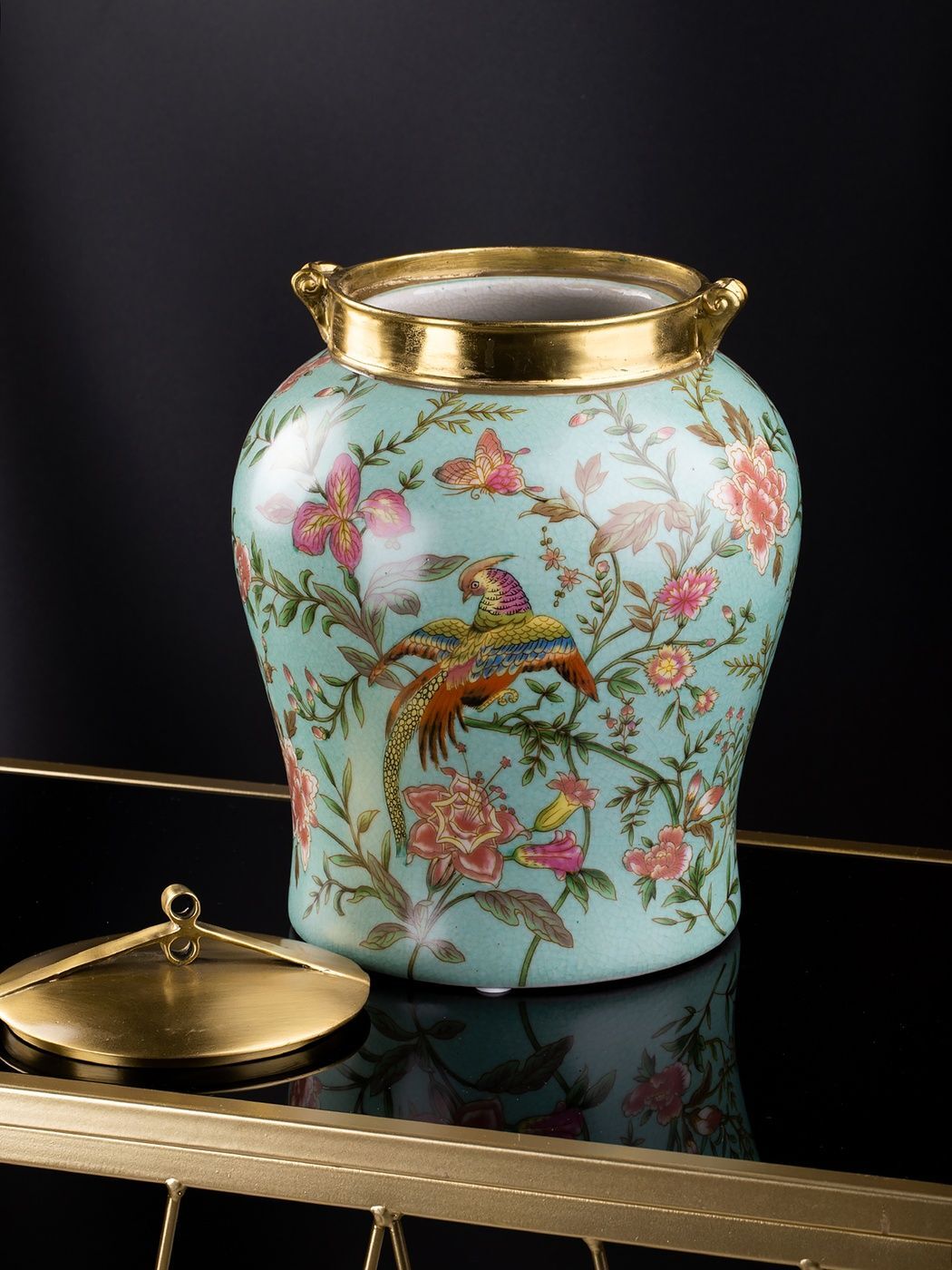 Ваза с крышкой, выполненная из фарфора с бронзовыми элементами. Уникальное изделие ручной работы. При производстве этих художественных изделий из фарфора с бронзой используются вековые традиции китайских мастеров. Видимые трещинки (кракелюры) делаются по уникальной технологии, что придает более благородный вид старинного изделия.