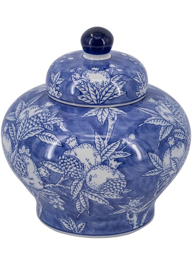 Фарфоровая ваза с крышкой, вдохновленная элегантным дизайном времен династии Мин в Китае, имеет классический силуэт, узкое горлышко и изящные синие мотивы цветущего гранатового дерева, которые грациозно переплетаются на белоснежном фоне. Разместите изделие на вашем журнальном столике, каминной полке или создайте свой дизайн интерьера совместно с изделиями из этой коллекции. Неподвластная времени форма и изысканные детали позволяют вазе дополнять традиционный, богемный, эклектичный и переходный стили, органично вписываясь в любой интерьер.