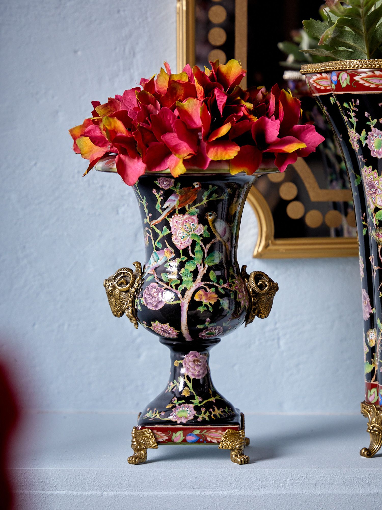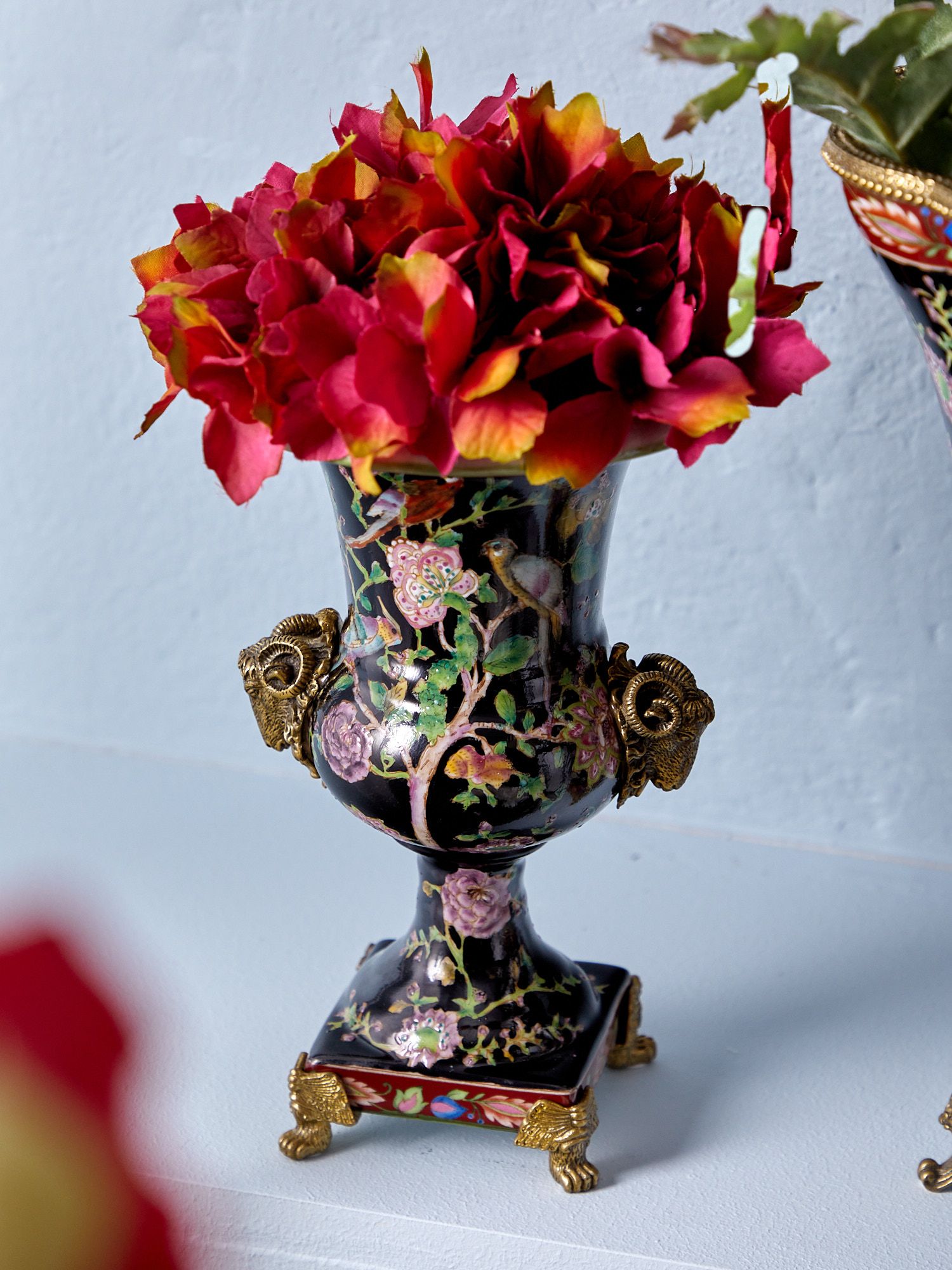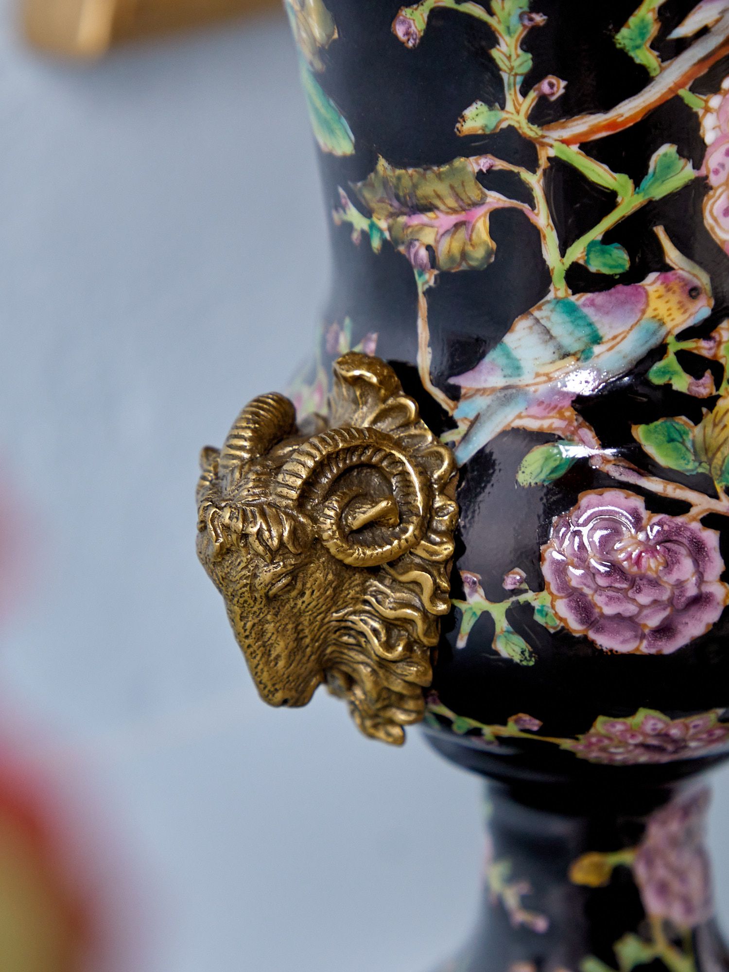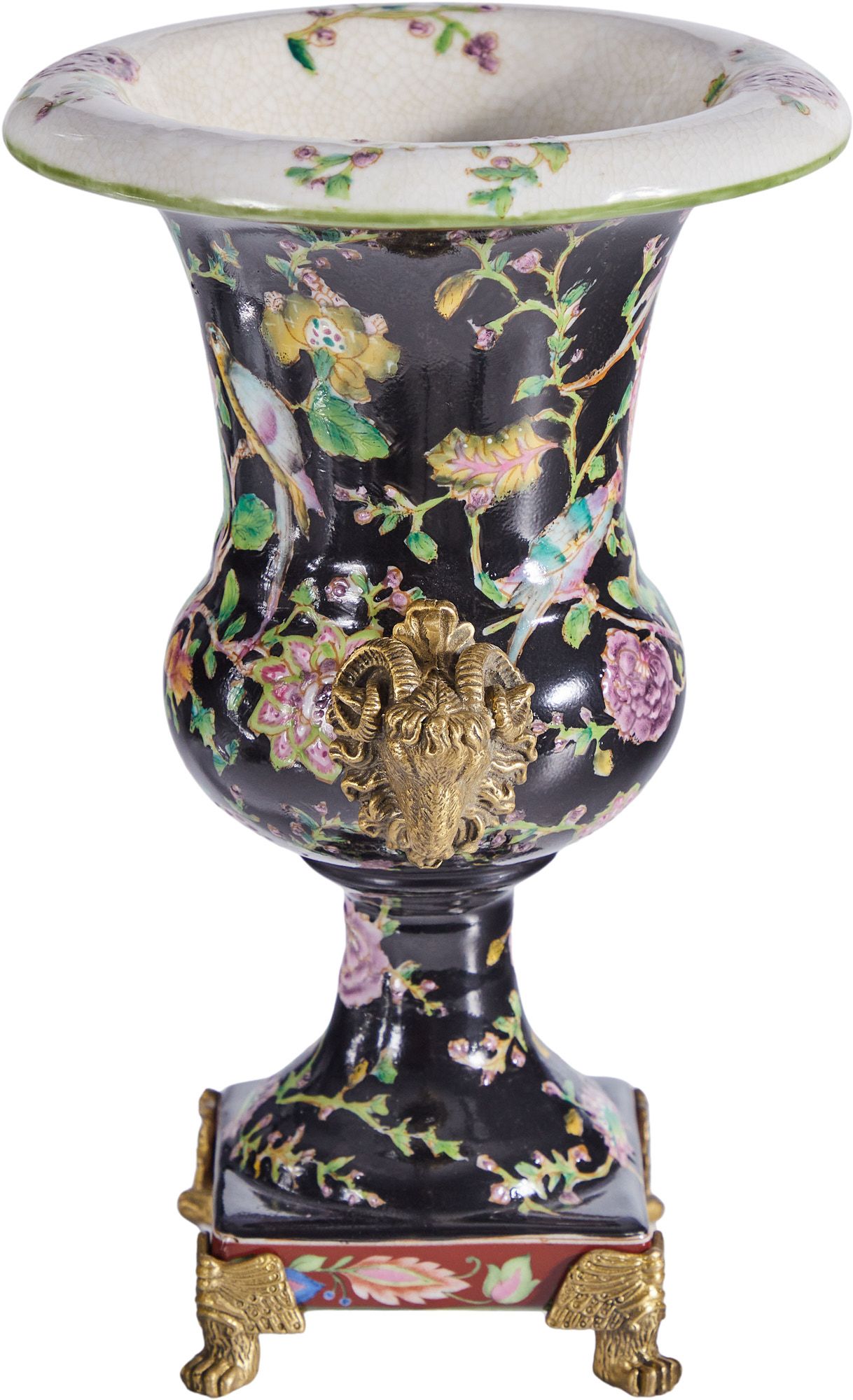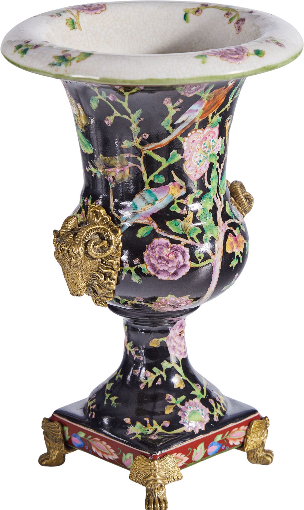 Ваза с овнами, выполненная из фарфора с бронзовыми элементами. Уникальное изделие ручной работы. При производстве этих художественных изделий из фарфора с бронзой используются вековые традиции китайских мастеров. Видимые трещинки (кракелюры) делаются по уникальной технологии, что придает более благородный вид старинного изделия.