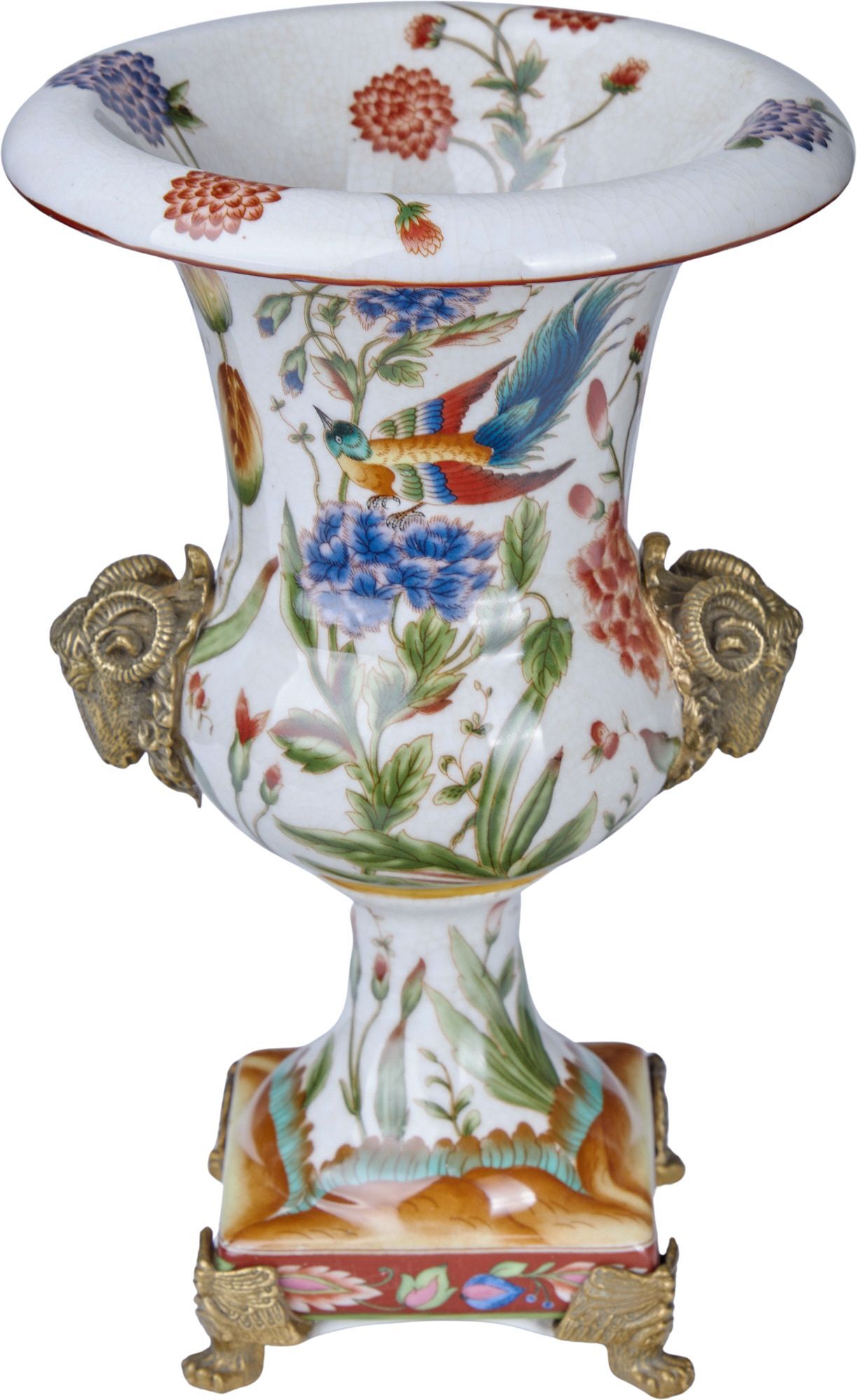 Ваза с овнами, выполненная из фарфора с бронзовыми элементами. Уникальное изделие ручной работы. При производстве этих художественных изделий из фарфора с бронзой используются вековые традиции китайских мастеров. Видимые трещинки (кракелюры) делаются по уникальной технологии, что придает более благородный вид старинного изделия.