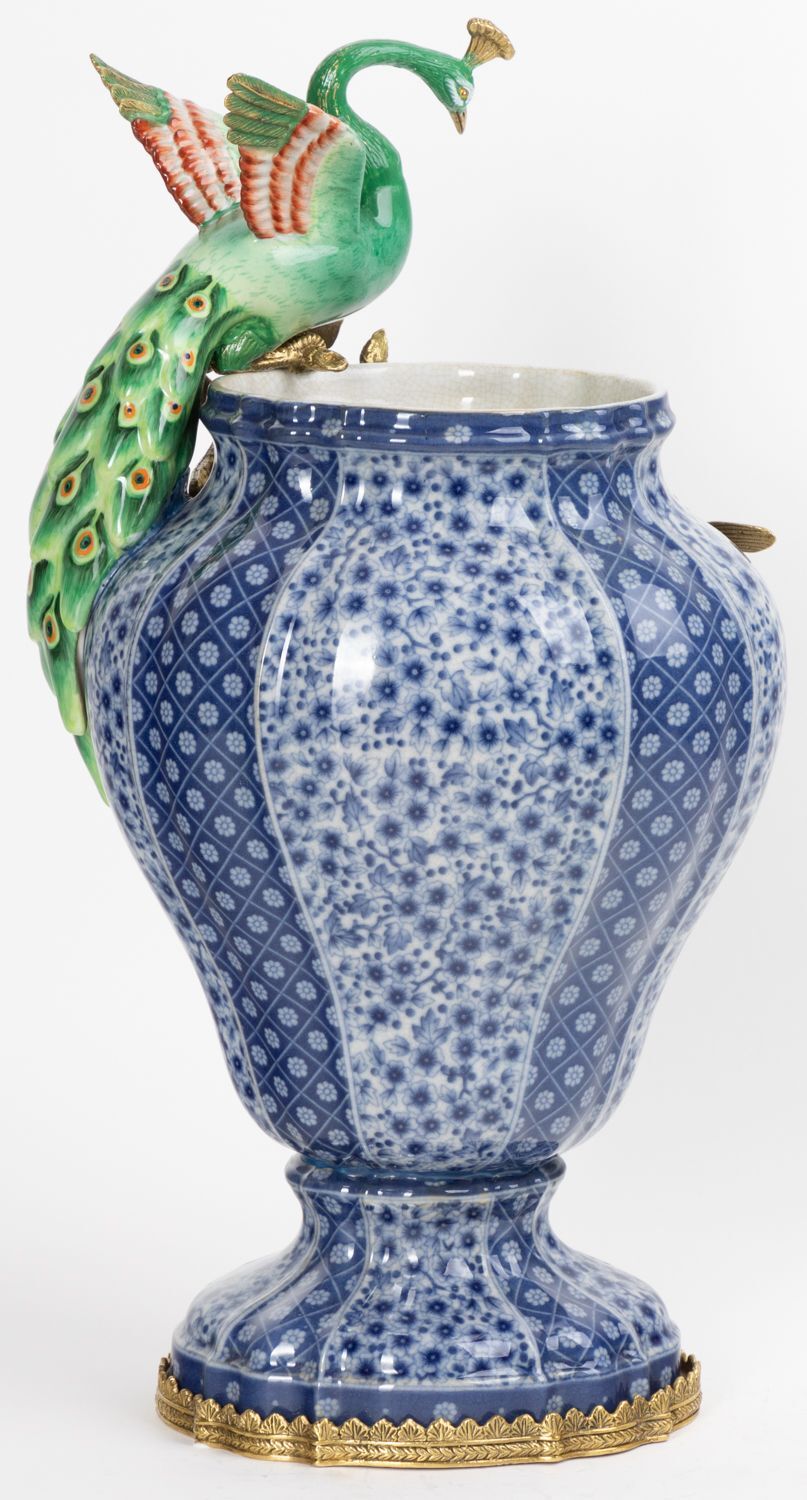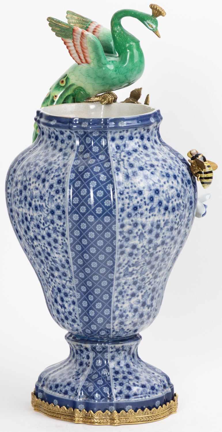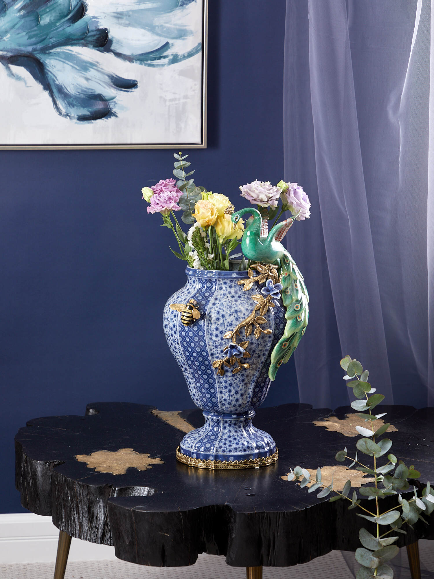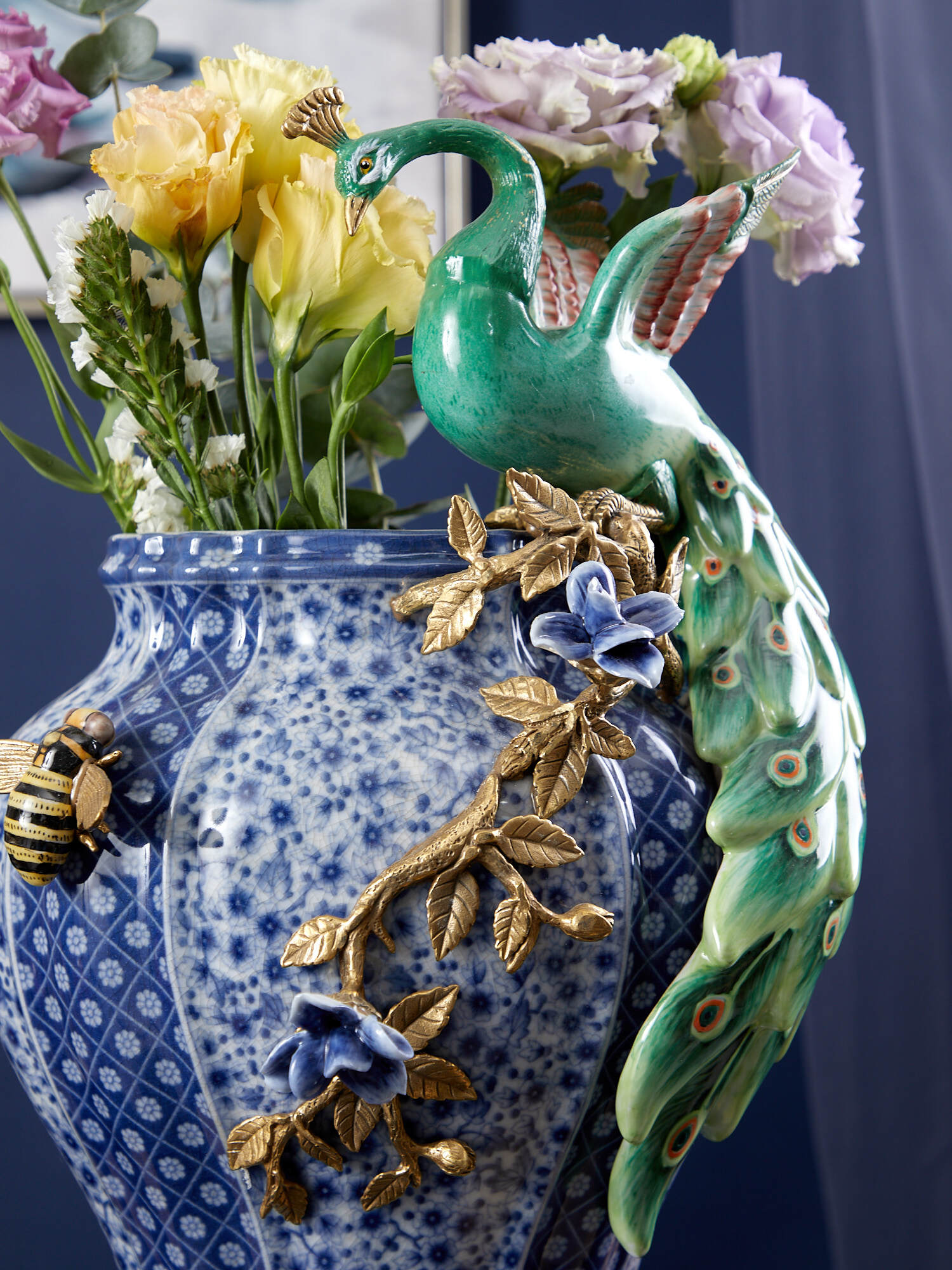Оригинальная ваза с павлином, выполненная из фарфора с бронзовыми элементами. Уникальное изделие ручной работы. При производстве этих художественных изделий из фарфора с бронзой используются вековые традиции китайских мастеров. Видимые трещинки (кракелюры) делаются по уникальной технологии, что придает более благородный вид старинного изделия.
