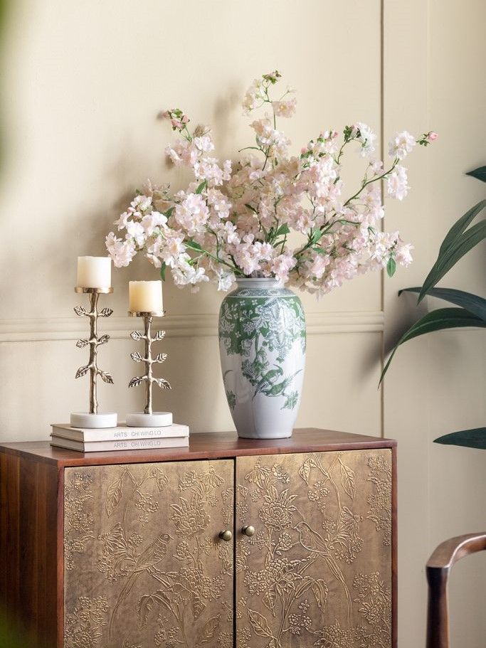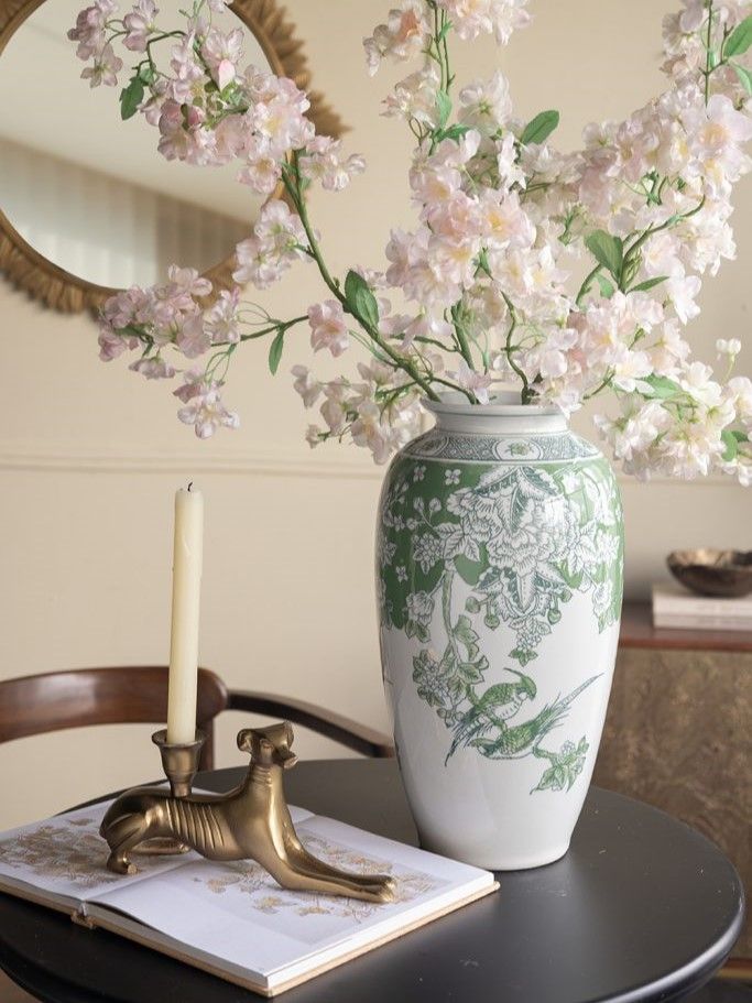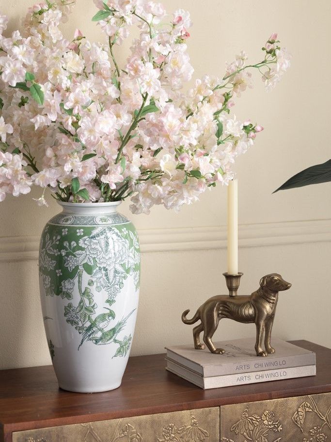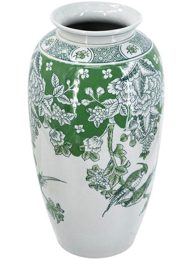 Фарфоровая ваза, вдохновленная классическим стилем шинуазри, отличается изящным зауженным силуэтом, слегка расширяющимся горлышком, зелеными цветочными и птичьими мотивами, контрастно выделяющимися на белоснежном фоне. Ваза идеально подходит для того, чтобы стоять отдельно или в сочетании с пышным букетом, привлекая внимание на любой поверхности стола, каминной или книжной полке. Мягкие декоративные элементы и неподвластная времени форма позволяют изделию сочетаться с традиционными, французскими, современными и переходными стилями, органично вписываясь в любой интерьер.