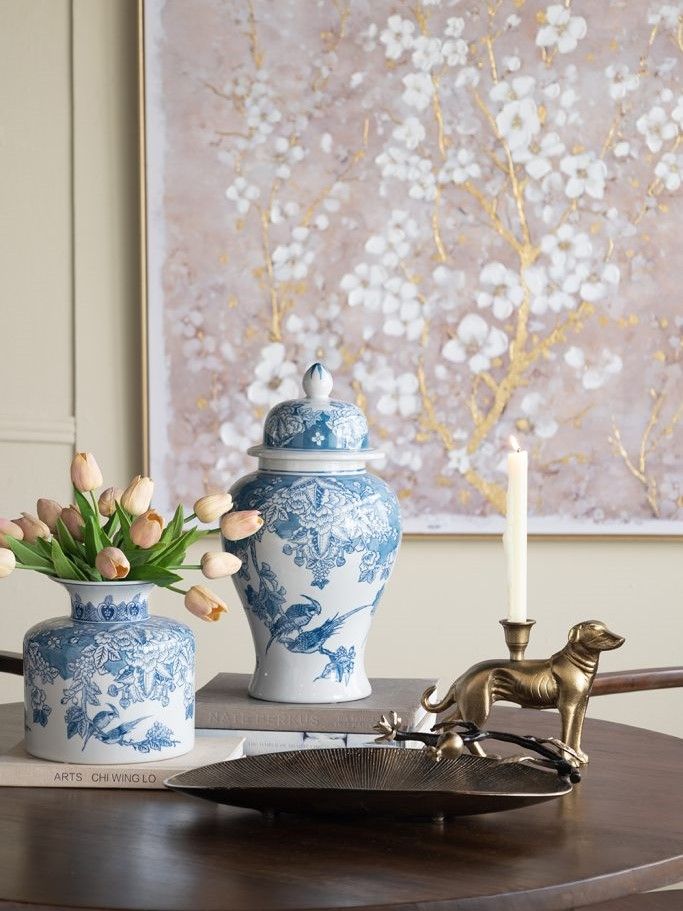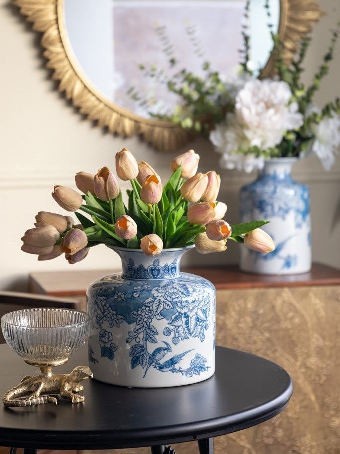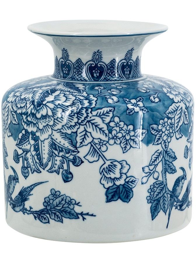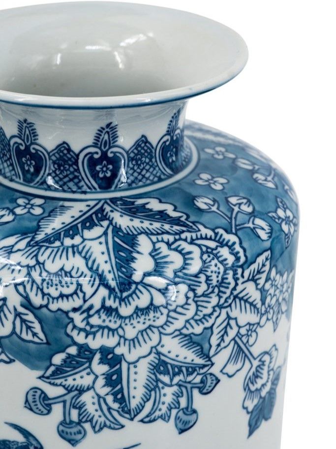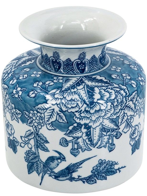 Фарфоровая ваза, вдохновленная элегантным дизайном времен династии Мин в Китае, имеет цилиндрический силуэт, узкое горлышко и изящные синие мотивы цветущего сада с попугаями, которые грациозно разместились на белоснежном фоне. Разместите изделие на вашем журнальном столике, каминной полке или создайте свой дизайн интерьера совместно с изделиями из этой коллекции. Неподвластная времени форма и изысканные детали позволяют вазе дополнять традиционный, богемный, эклектичный и переходный стили, органично вписываясь в любой интерьер.