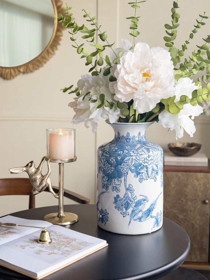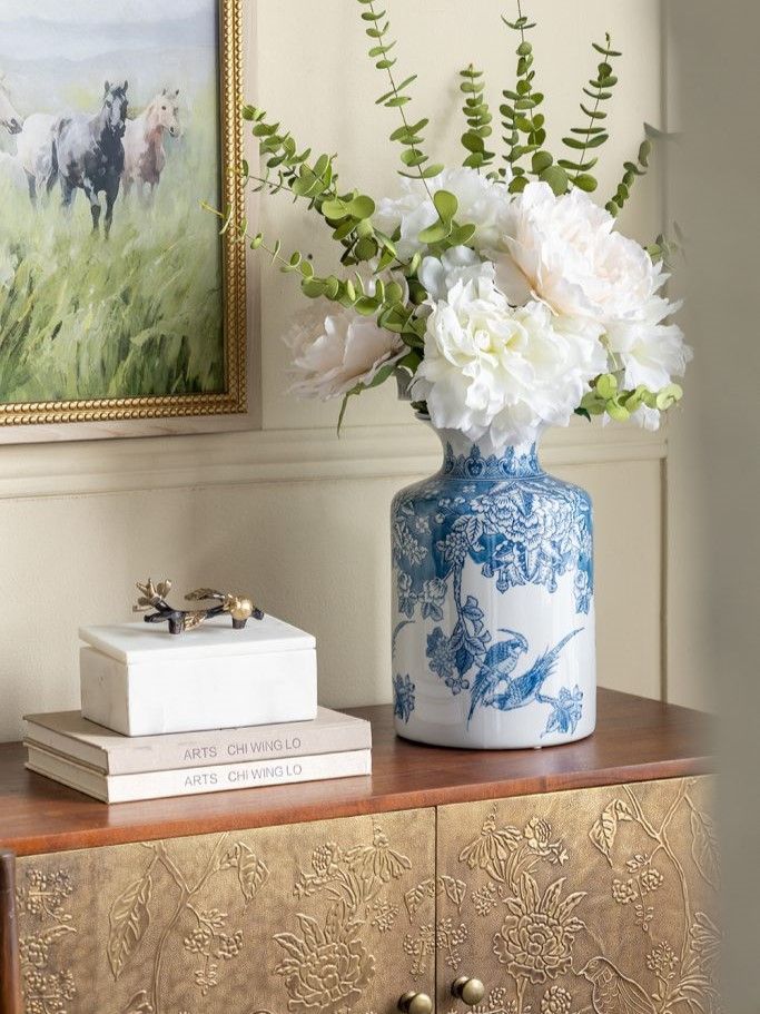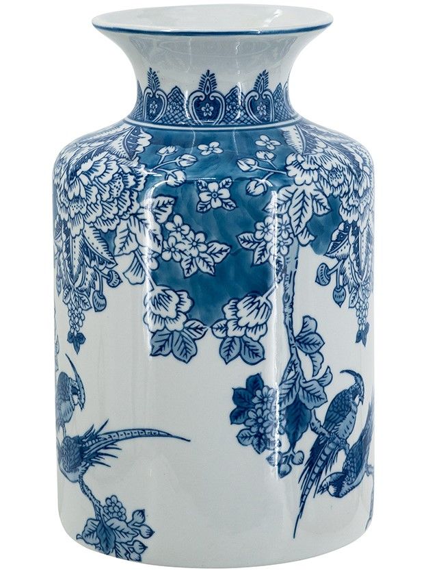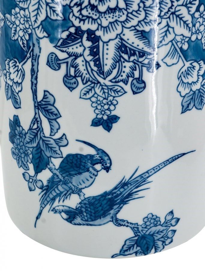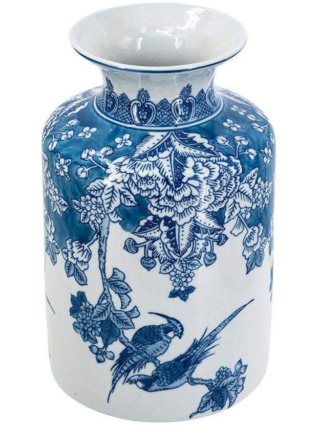 Фарфоровая ваза, вдохновленная элегантным дизайном времен династии Мин в Китае, имеет цилиндрический силуэт, узкое горлышко и изящные синие мотивы цветущего сада с попугаями, которые грациозно разместились на белоснежном фоне. Разместите изделие на вашем журнальном столике, каминной полке или создайте свой дизайн интерьера совместно с изделиями из этой коллекции. Неподвластная времени форма и изысканные детали позволяют вазе дополнять традиционный, богемный, эклектичный и переходный стили, органично вписываясь в любой интерьер.