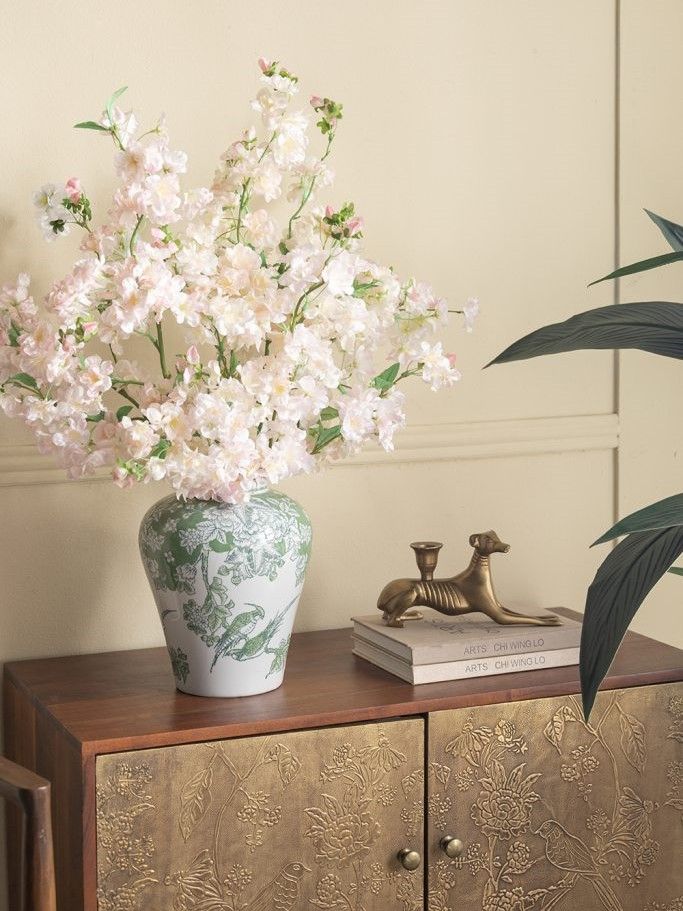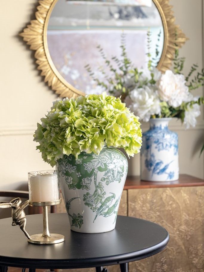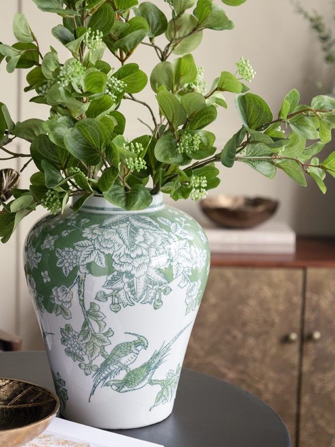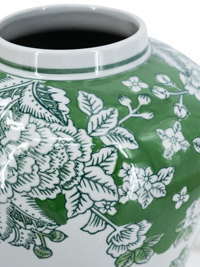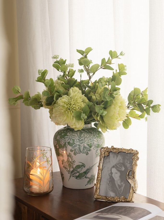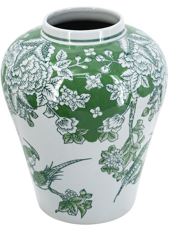 Фарфоровая ваза, вдохновленная классическим стилем шинуазри, отличается изящным зауженным силуэтом, слегка расширяющимся горлышком, зелеными цветочными и птичьими мотивами, контрастно выделяющимися на белоснежном фоне. Ваза идеально подходит для того, чтобы стоять отдельно или в сочетании с пышным букетом, привлекая внимание на любой поверхности стола, каминной или книжной полке. Мягкие декоративные элементы и неподвластная времени форма позволяют изделию сочетаться с традиционными, французскими, современными и переходными стилями, органично вписываясь в любой интерьер.