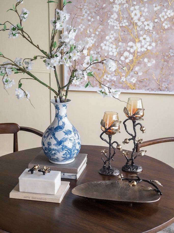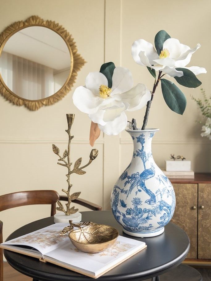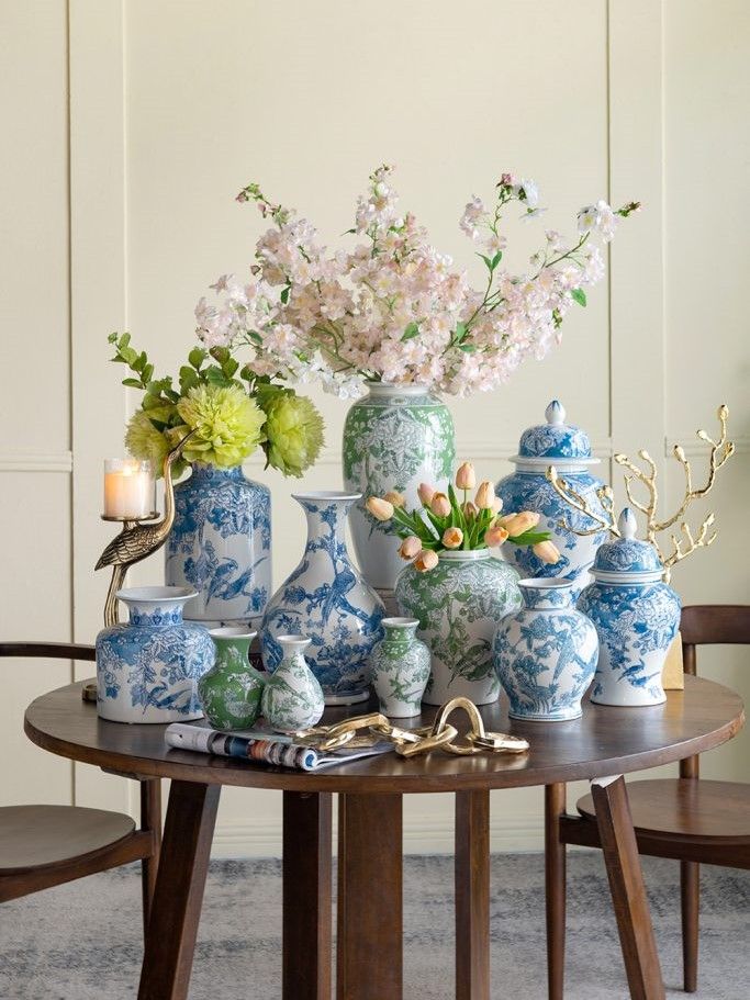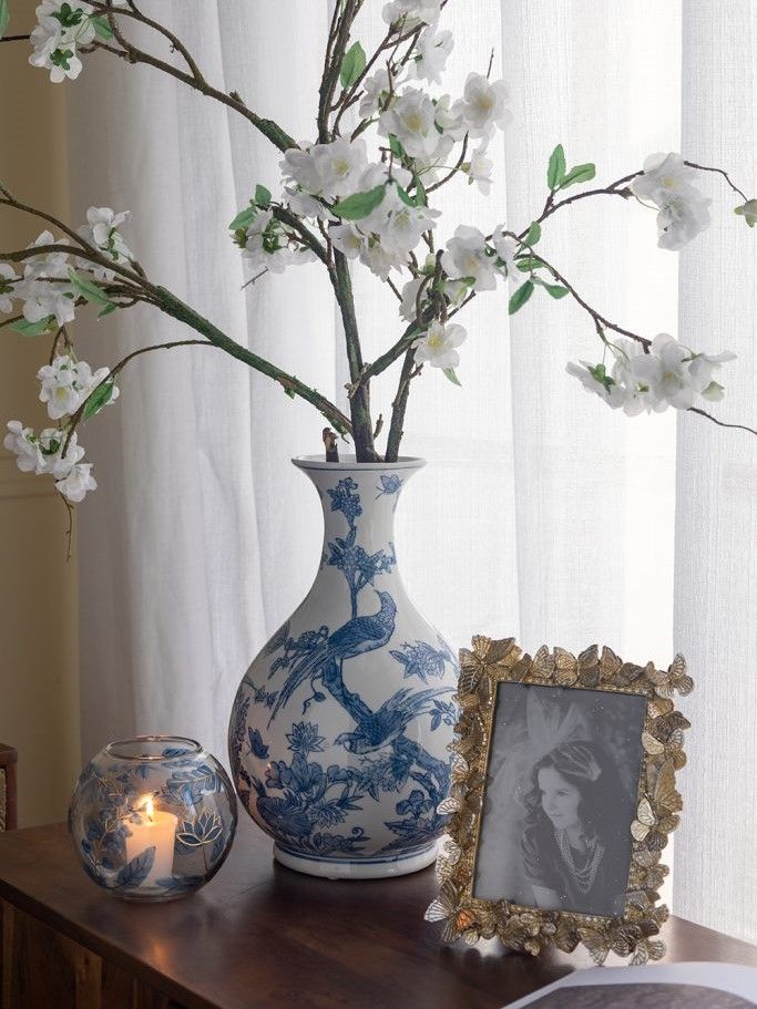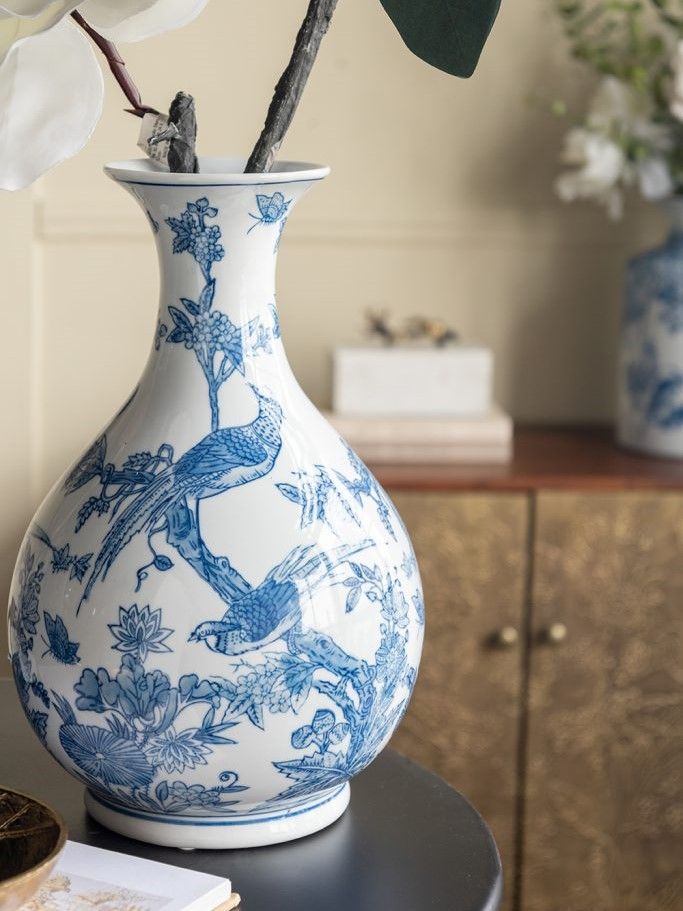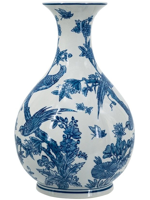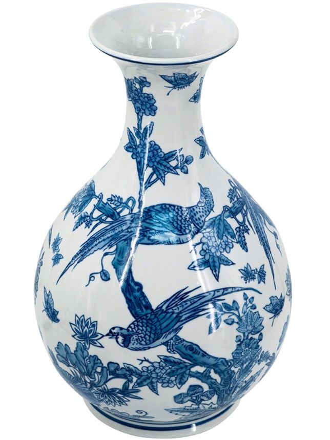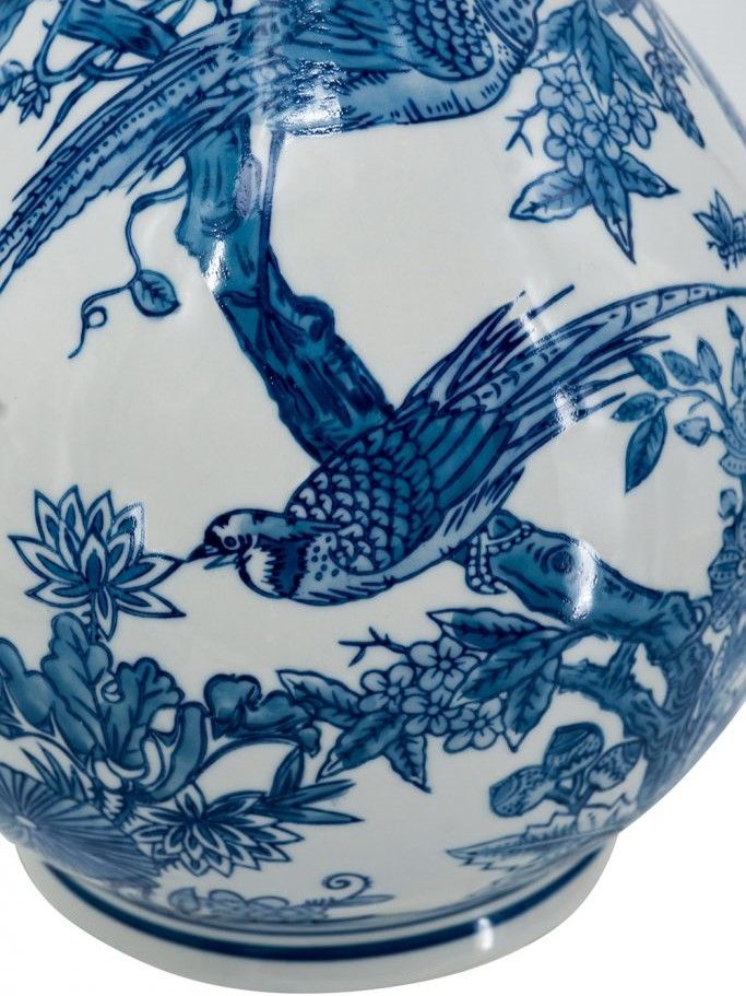 Фарфоровая ваза, вдохновленная элегантным дизайном времен династии Мин в Китае, имеет округлый силуэт, узкое горлышко и изящные синие мотивы цветущего сада с попугаями, которые грациозно разместились на белоснежном фоне. Разместите изделие на вашем журнальном столике, каминной полке или создайте свой дизайн интерьера совместно с изделиями из этой коллекции. Неподвластная времени форма и изысканные детали позволяют вазе дополнять традиционный, богемный, эклектичный и переходный стили, органично вписываясь в любой интерьер.