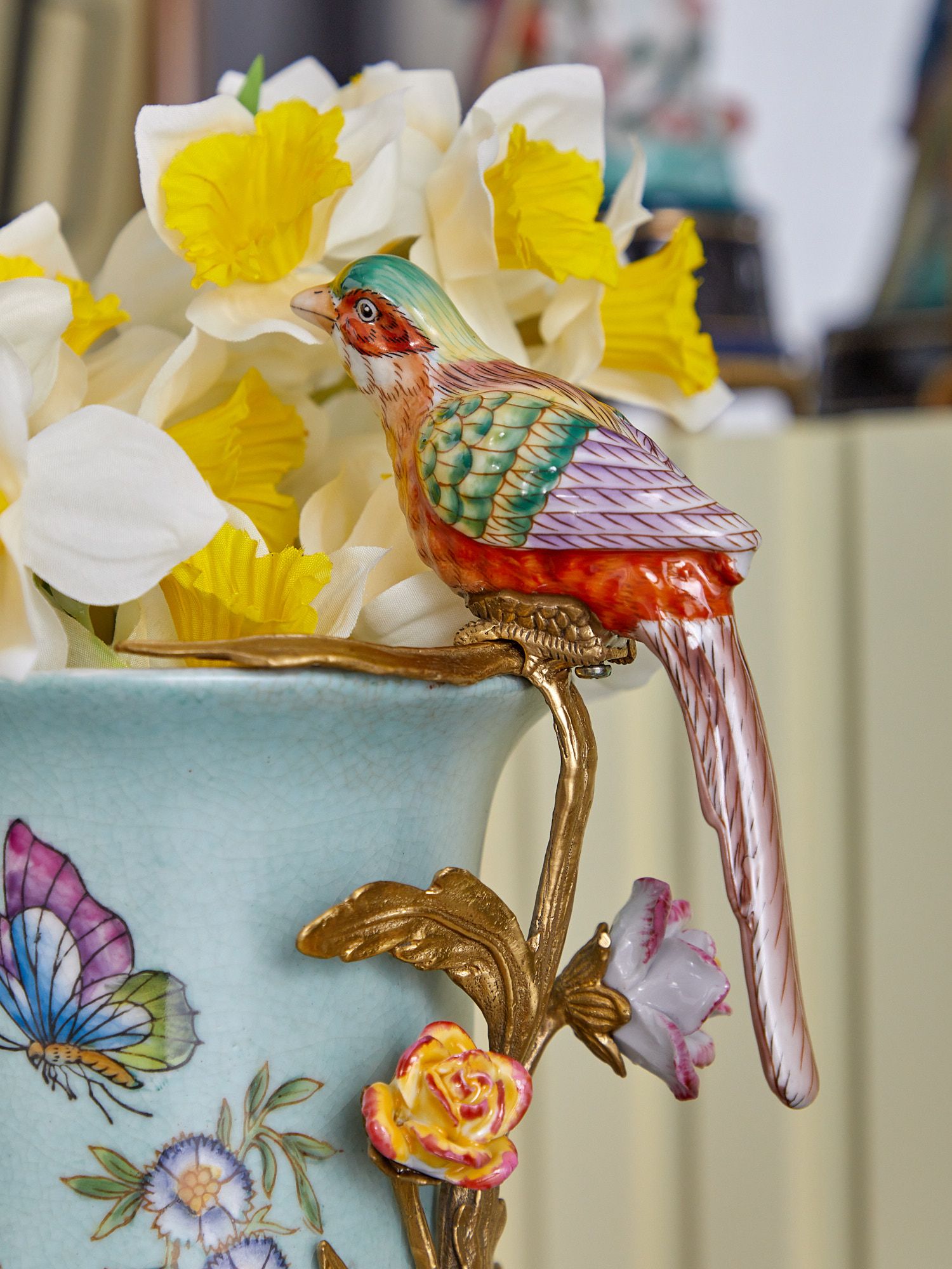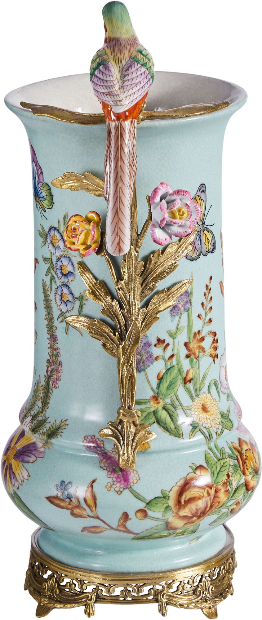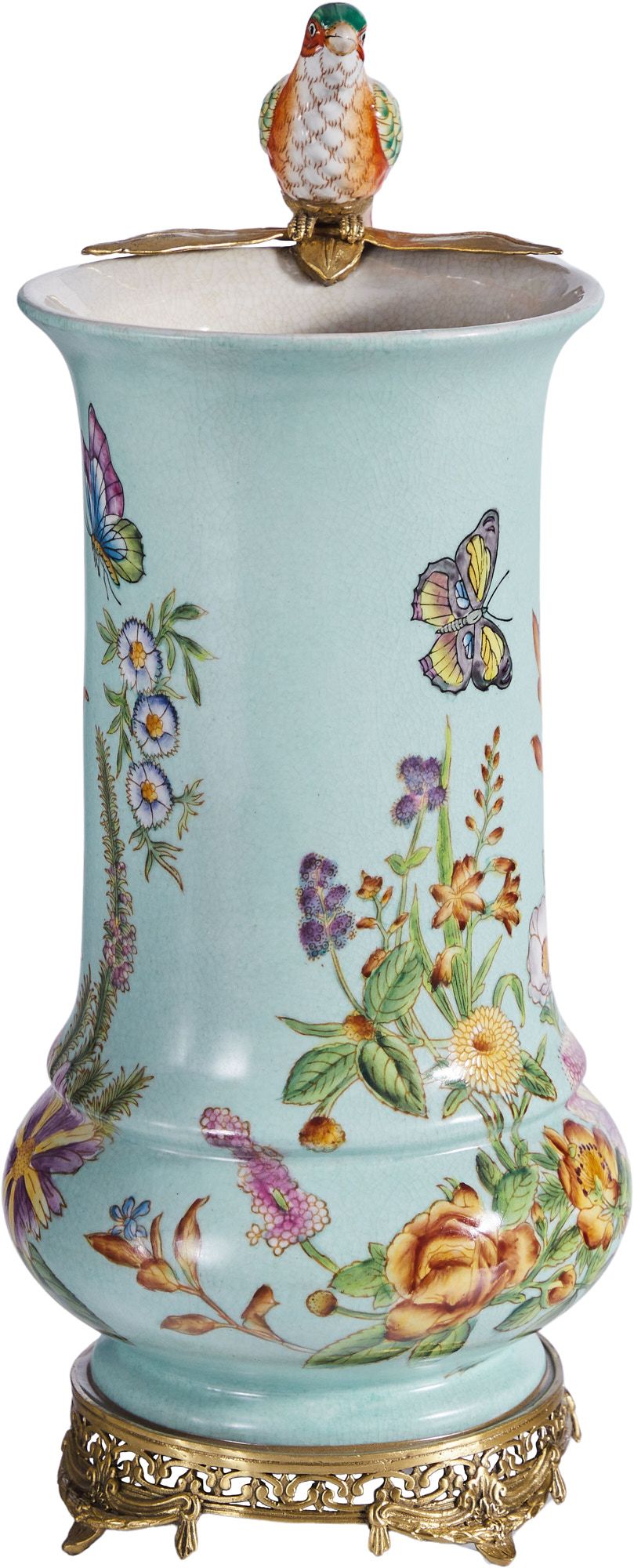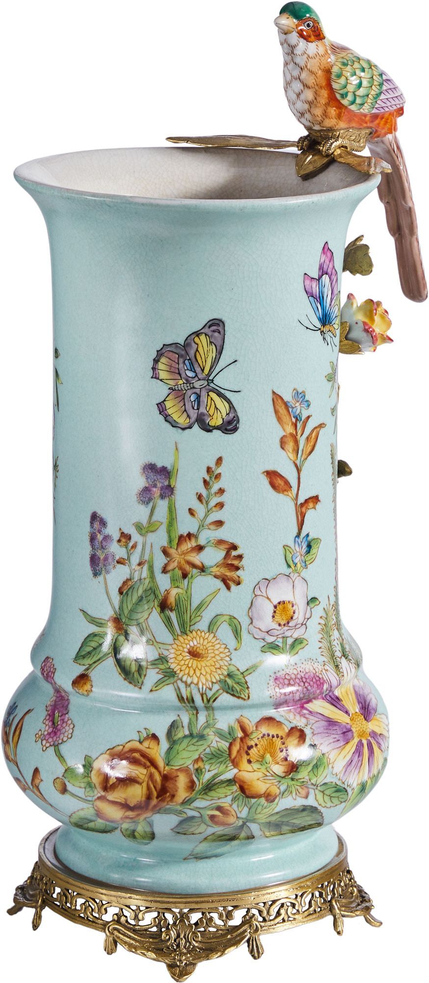Изысканная ваза с птичкой, выполненная из фарфора с бронзовыми элементами. Уникальное изделие ручной работы. При производстве этих художественных изделий из фарфора с бронзой используются вековые традиции китайских мастеров. Видимые трещинки (кракелюры) делаются по уникальной технологии, что придает более благородный вид старинного изделия.