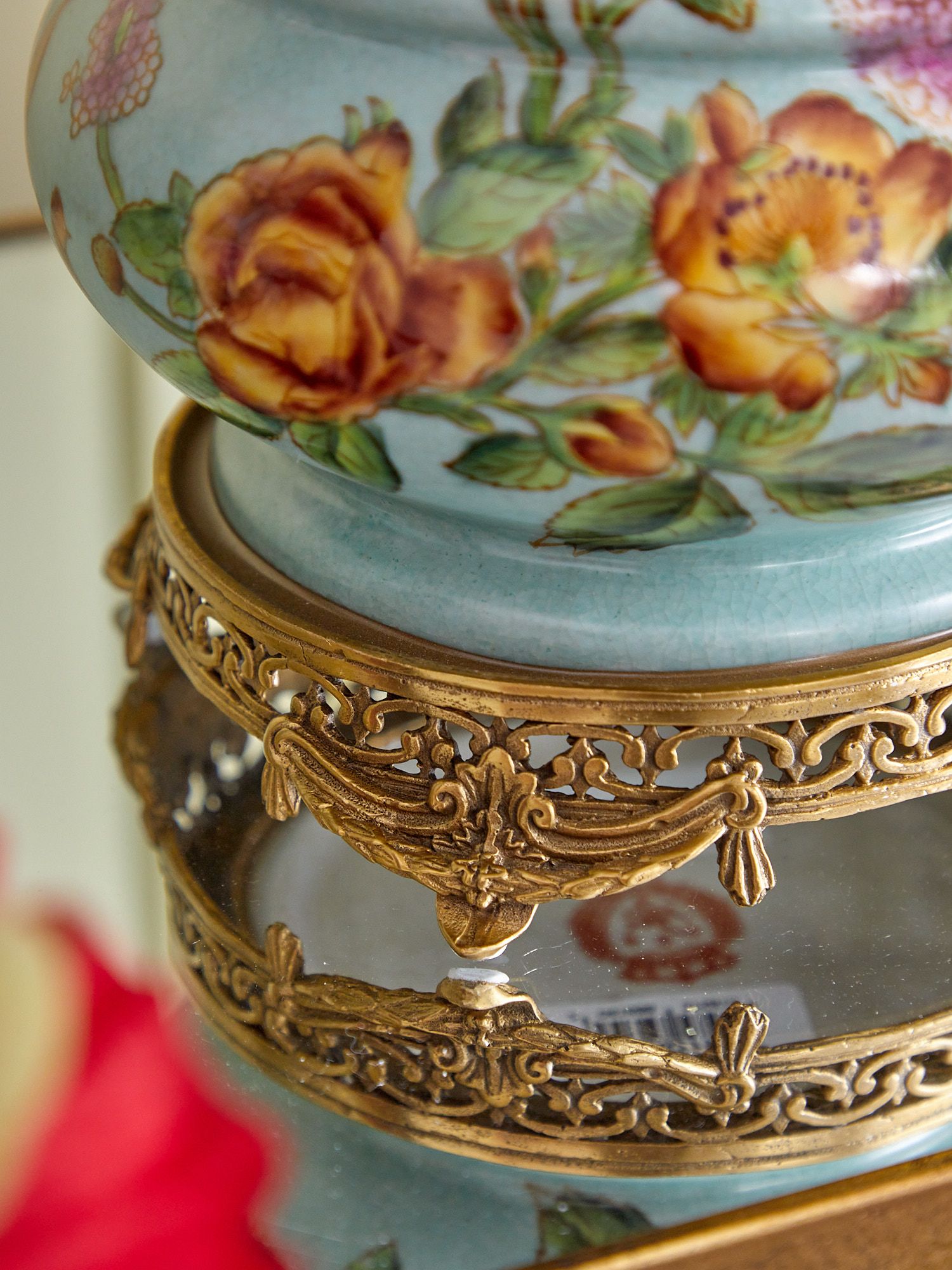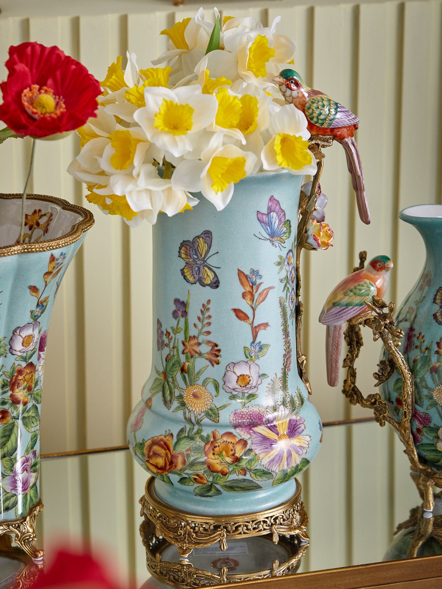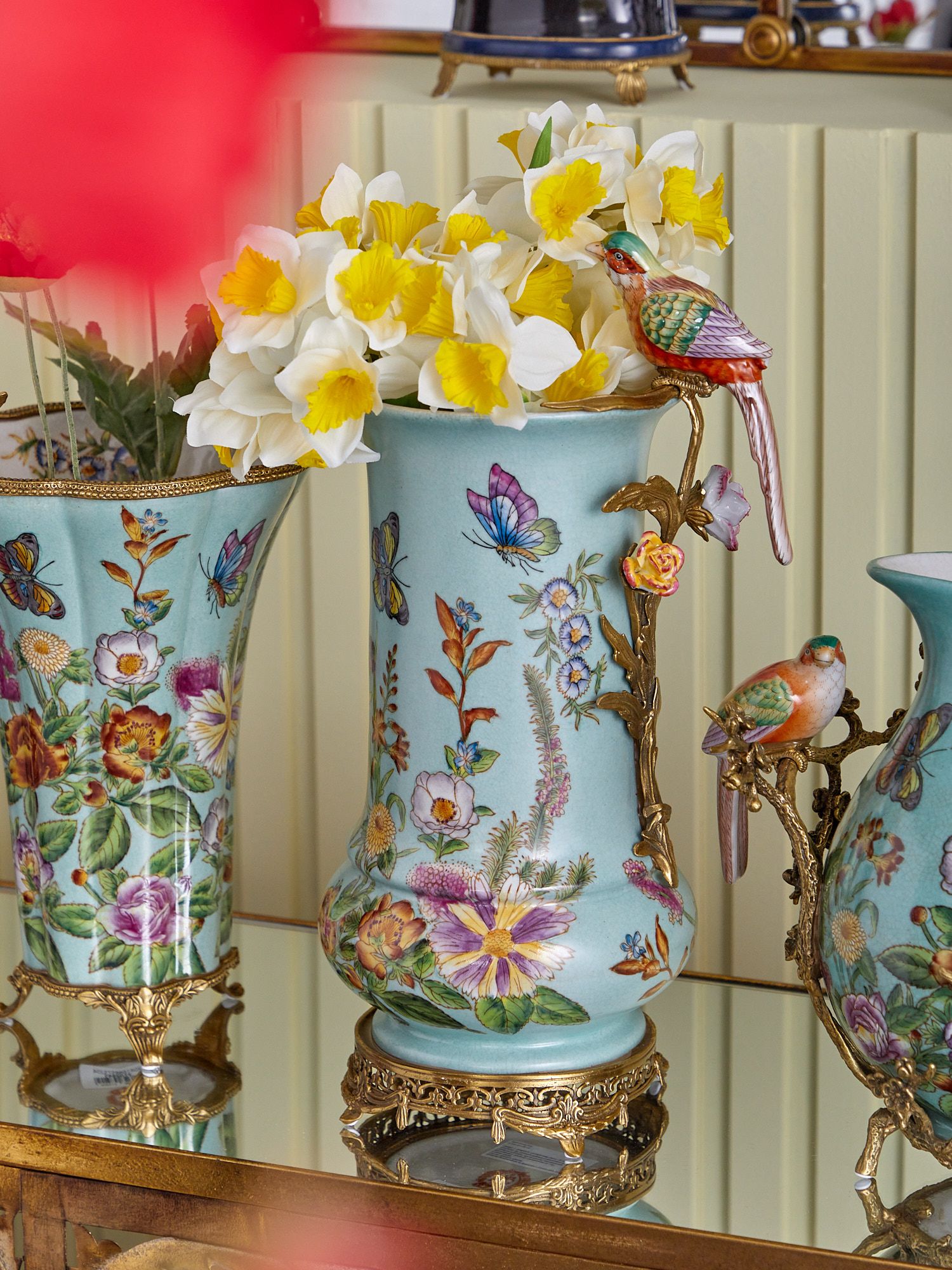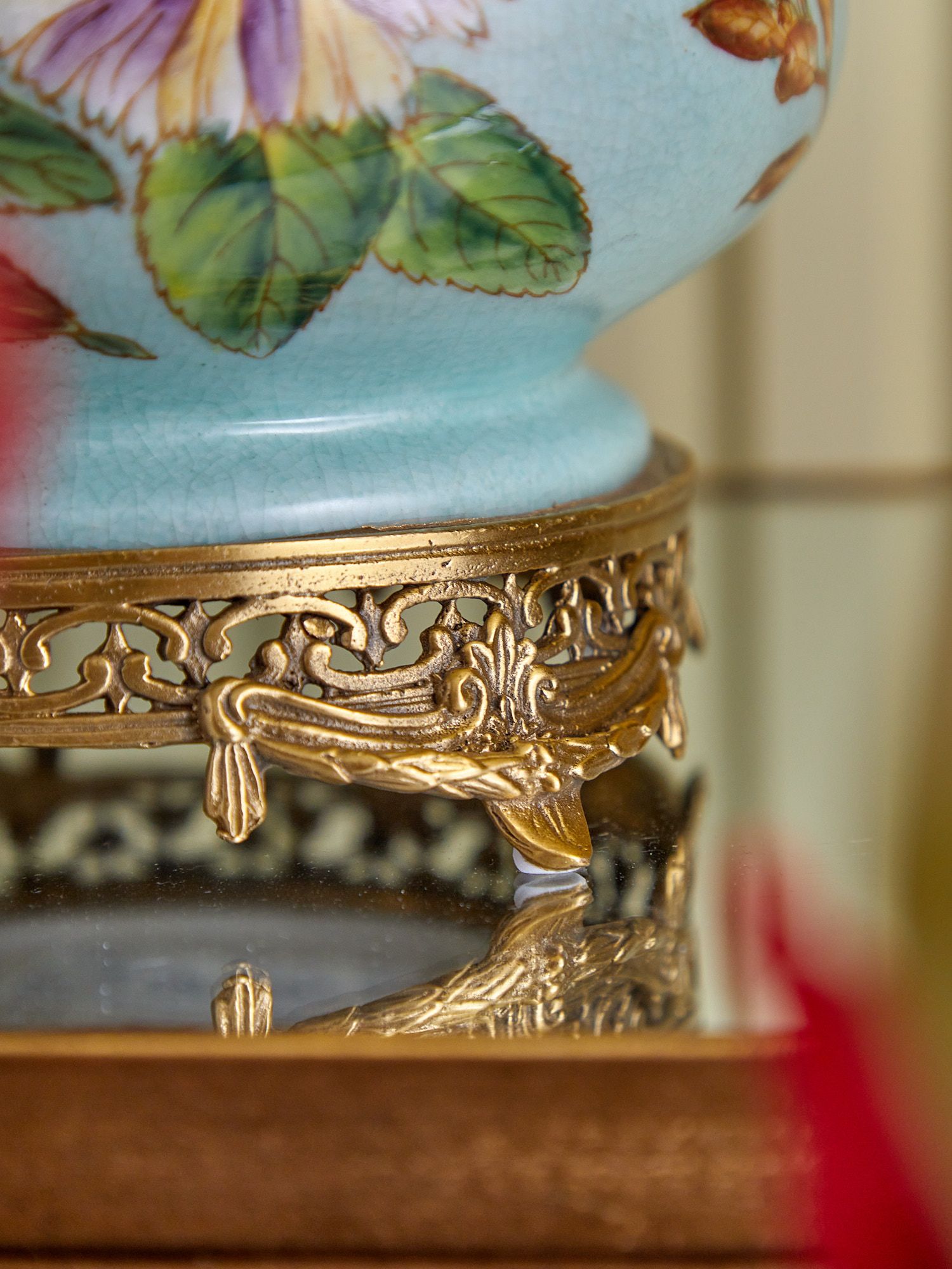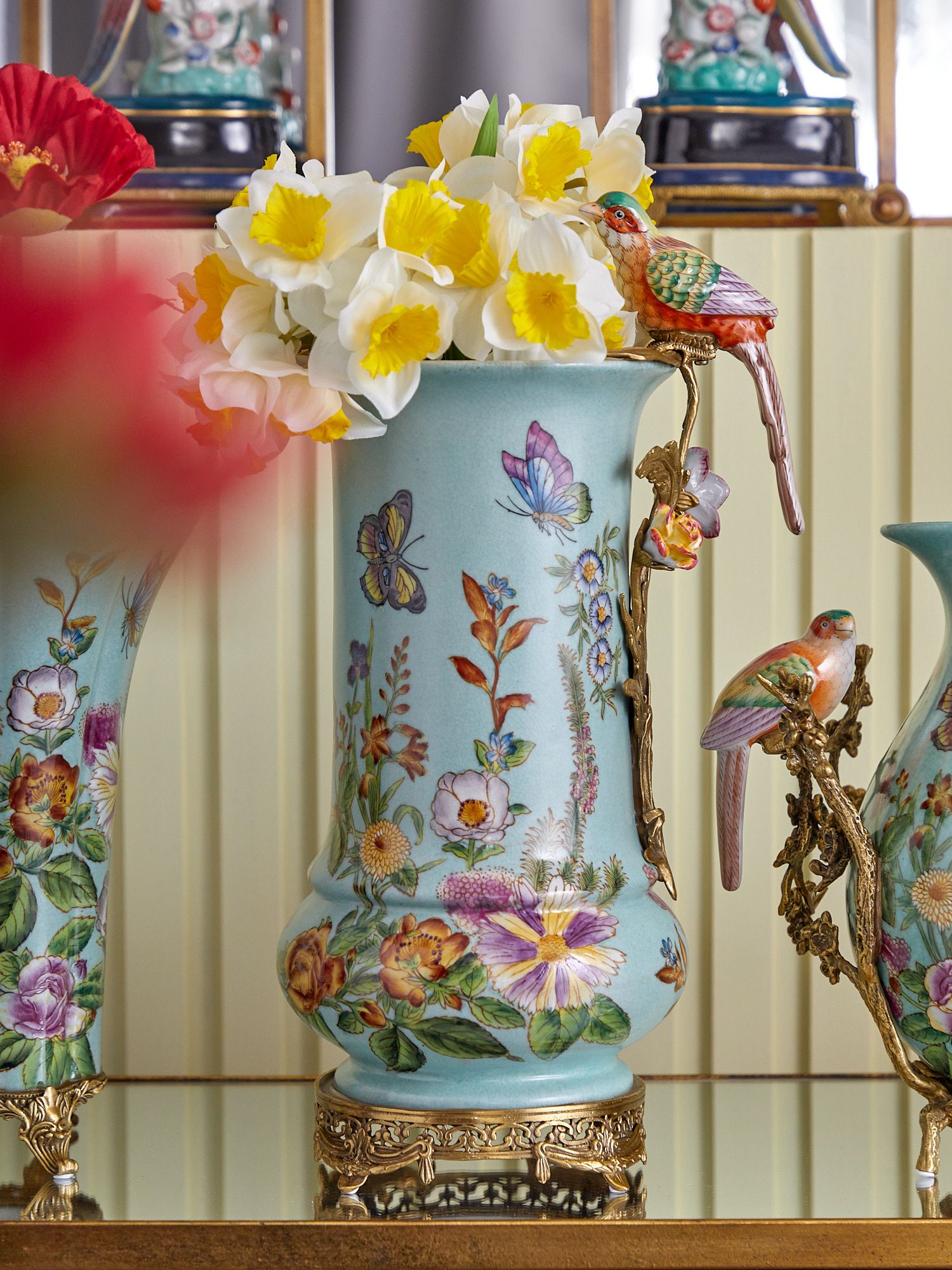 Изысканная ваза с птичкой, выполненная из фарфора с бронзовыми элементами. Уникальное изделие ручной работы. При производстве этих художественных изделий из фарфора с бронзой используются вековые традиции китайских мастеров. Видимые трещинки (кракелюры) делаются по уникальной технологии, что придает более благородный вид старинного изделия.